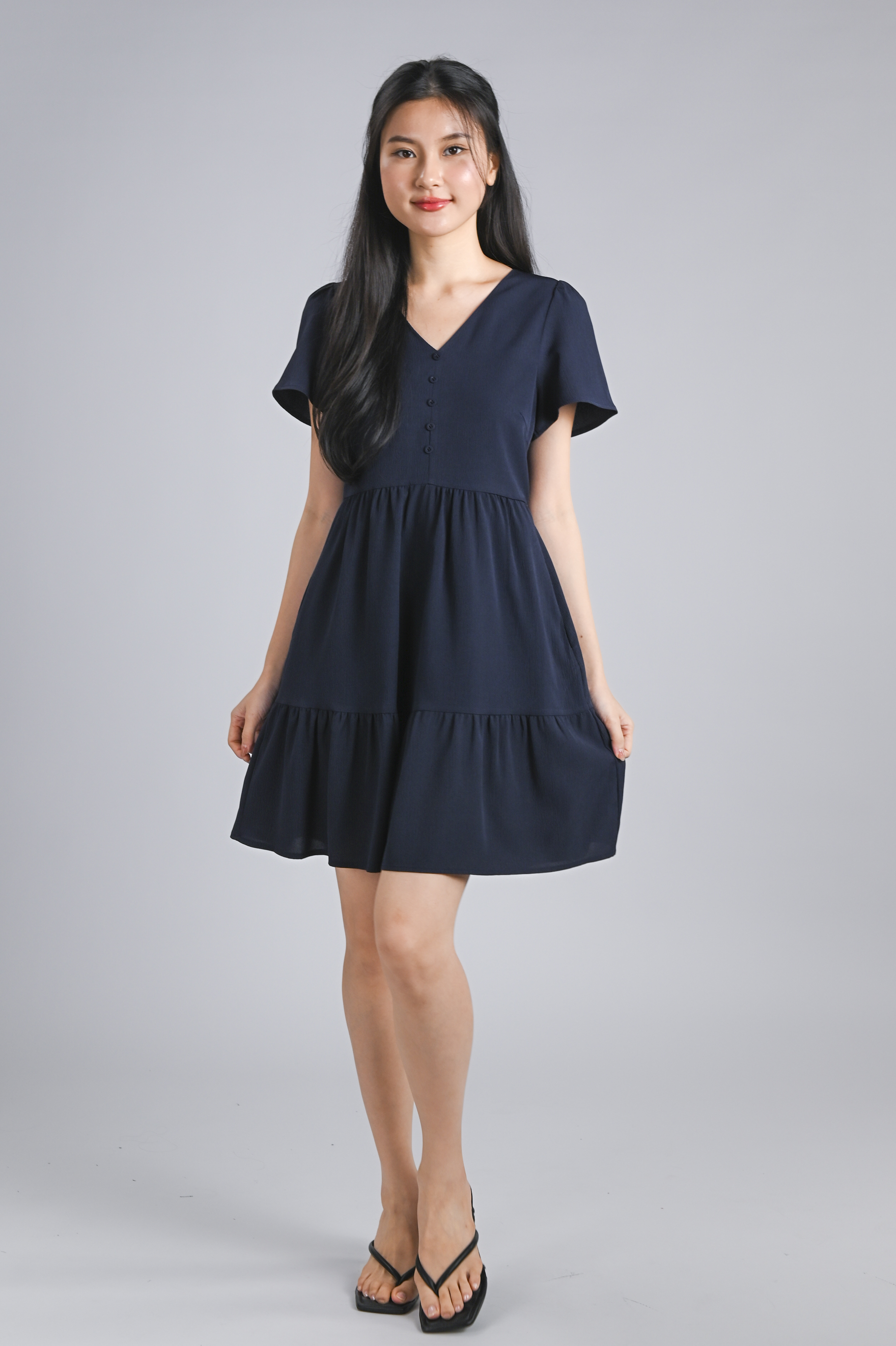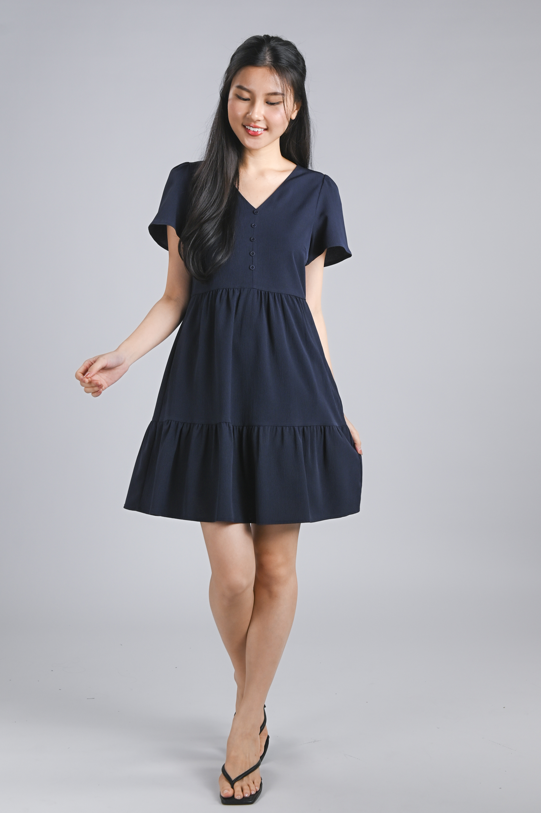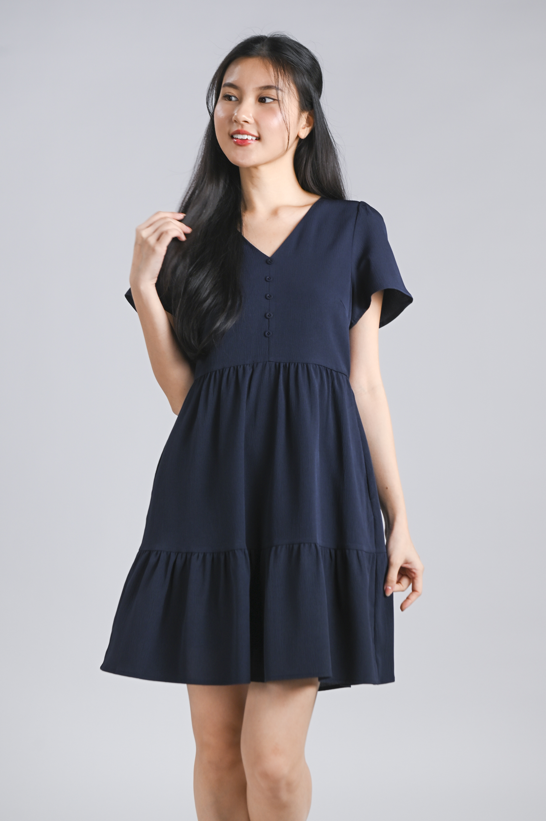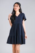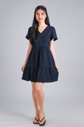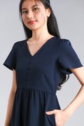 STELLA SLEEVED BUTTON FLOUNCE DRESS IN NAVY