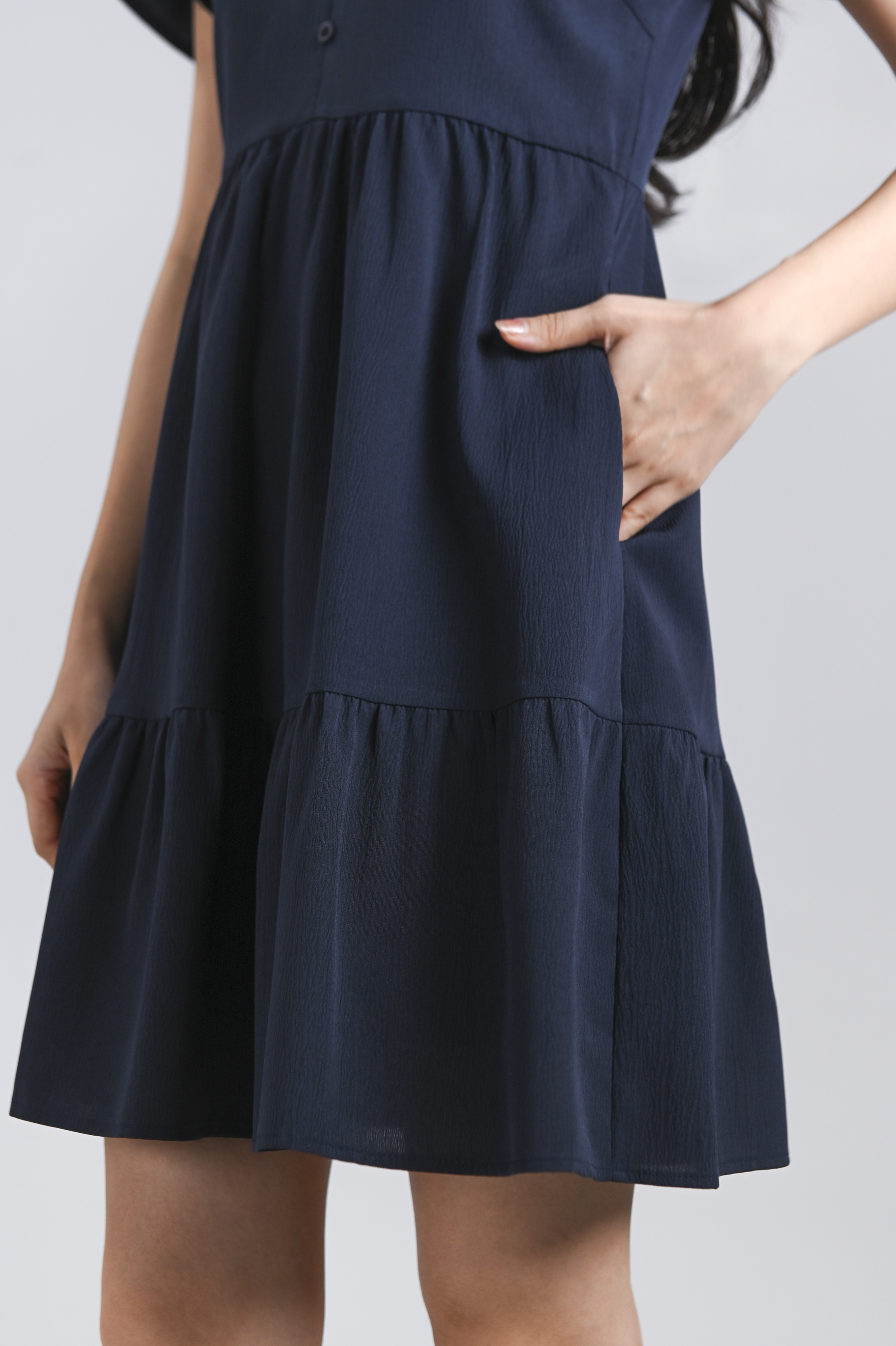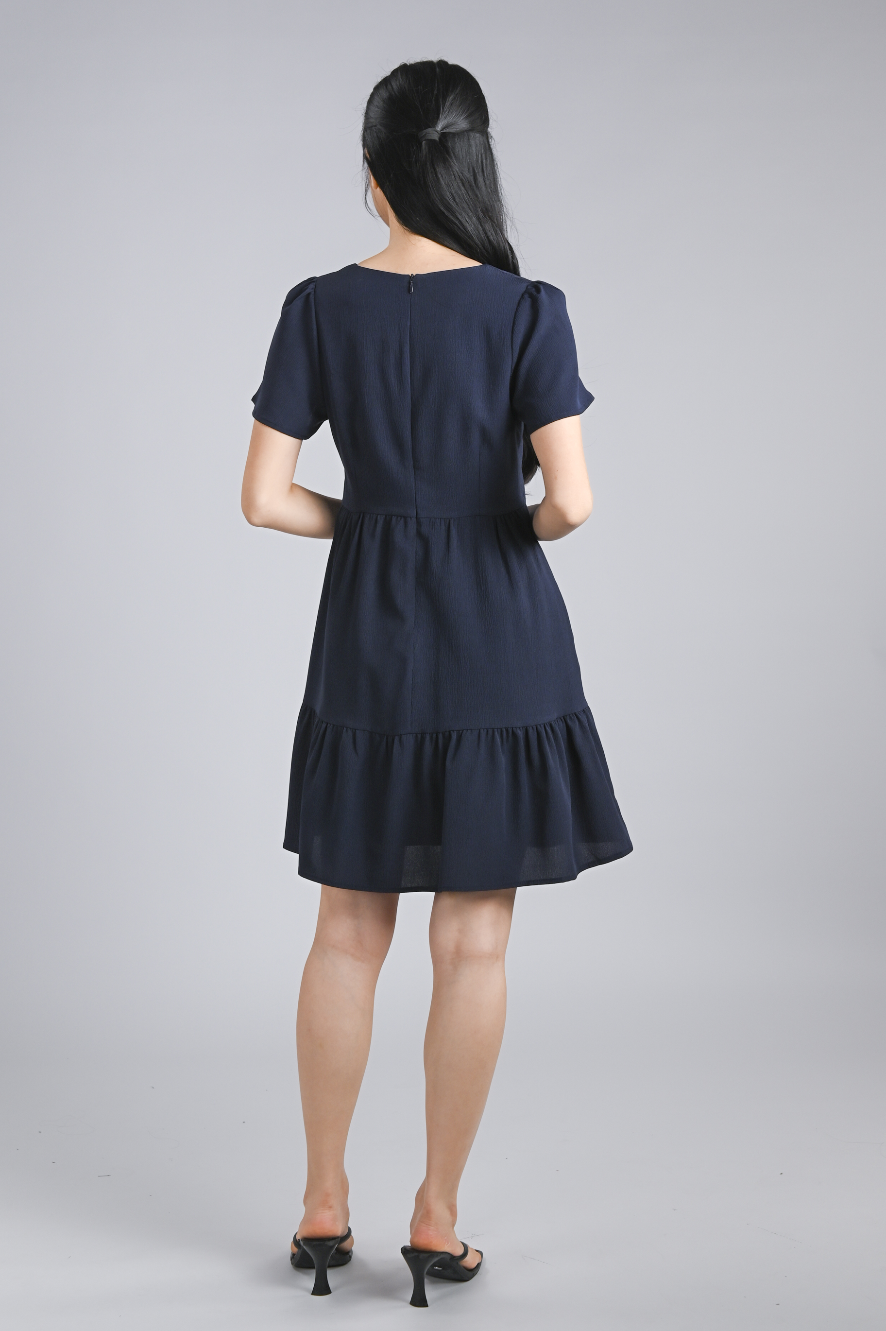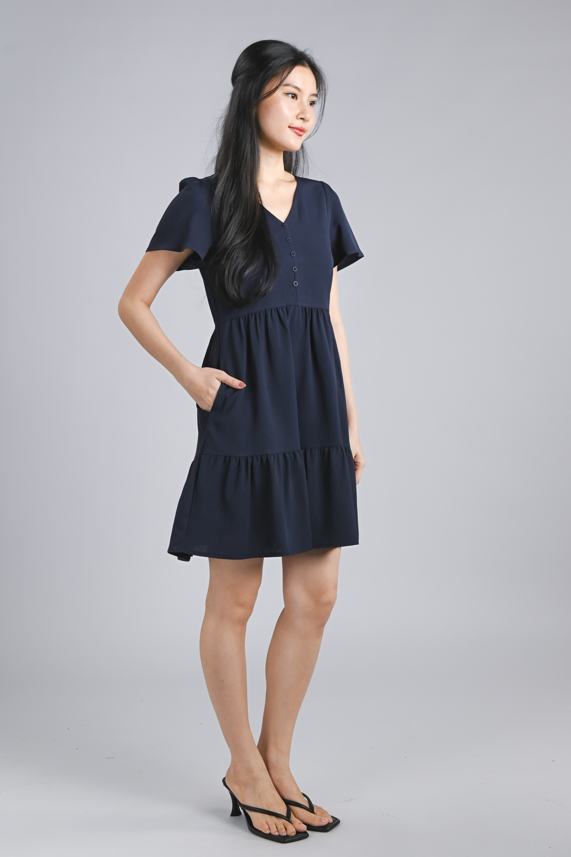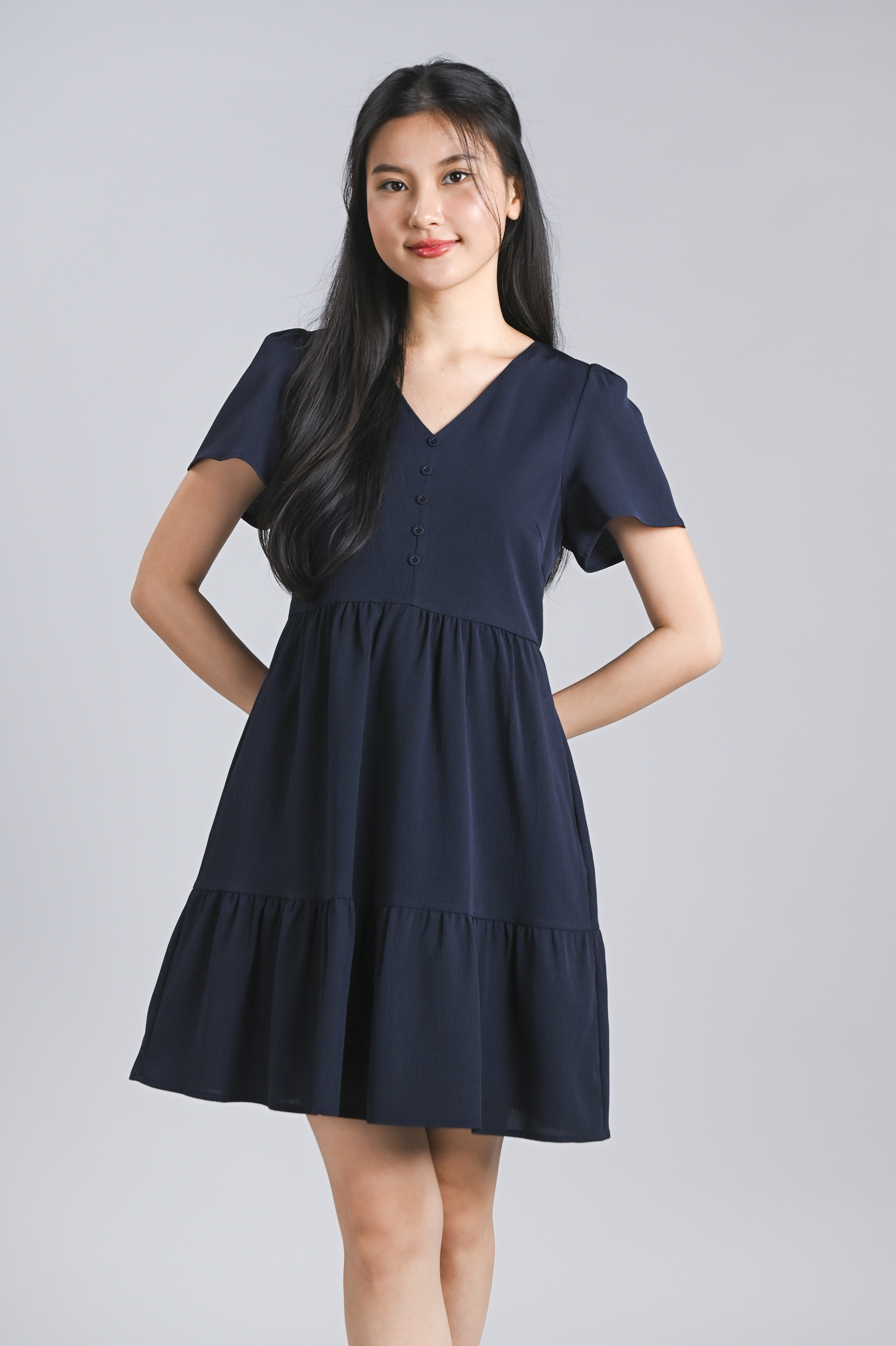 STELLA SLEEVED BUTTON FLOUNCE DRESS IN NAVY