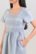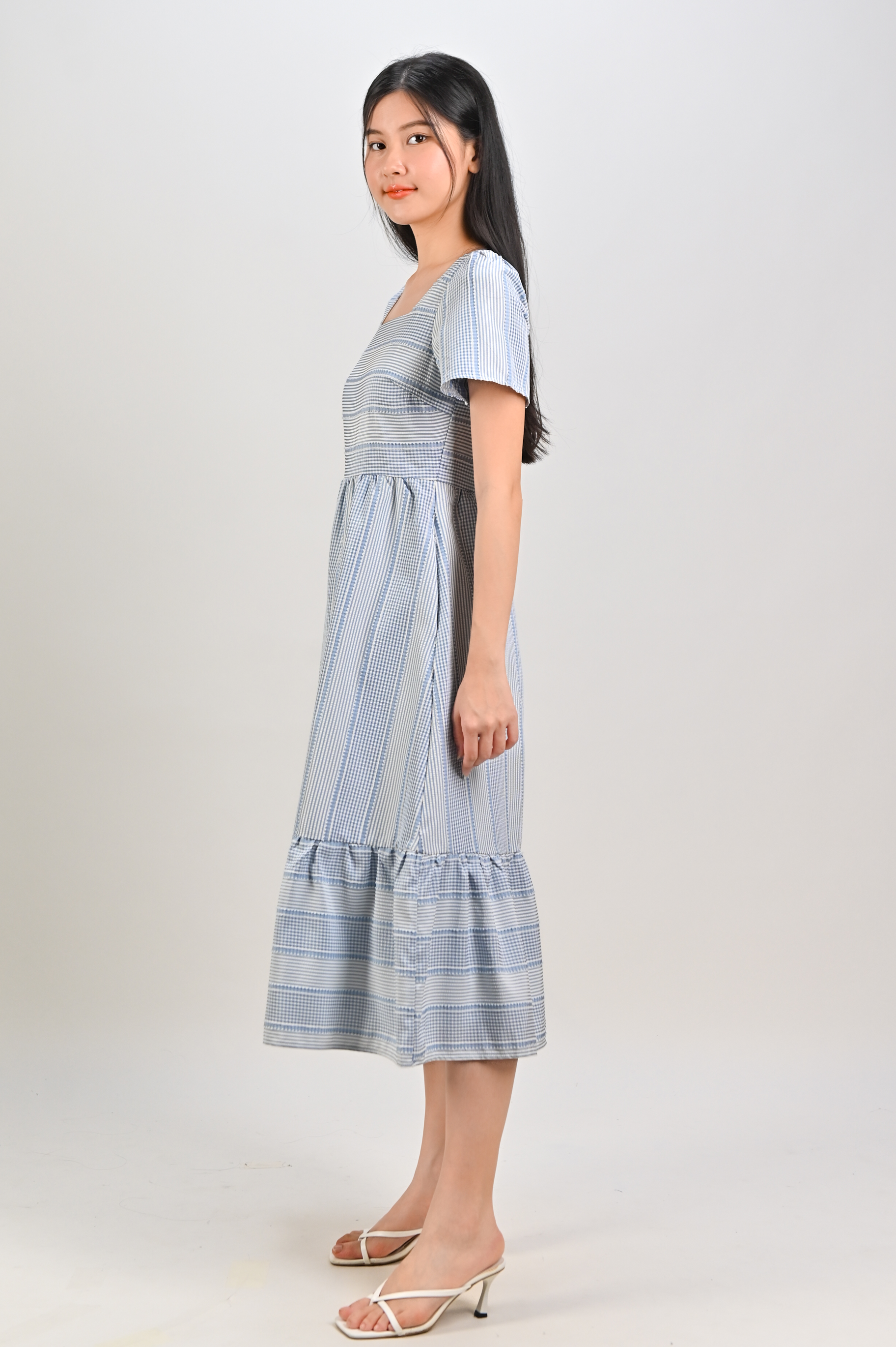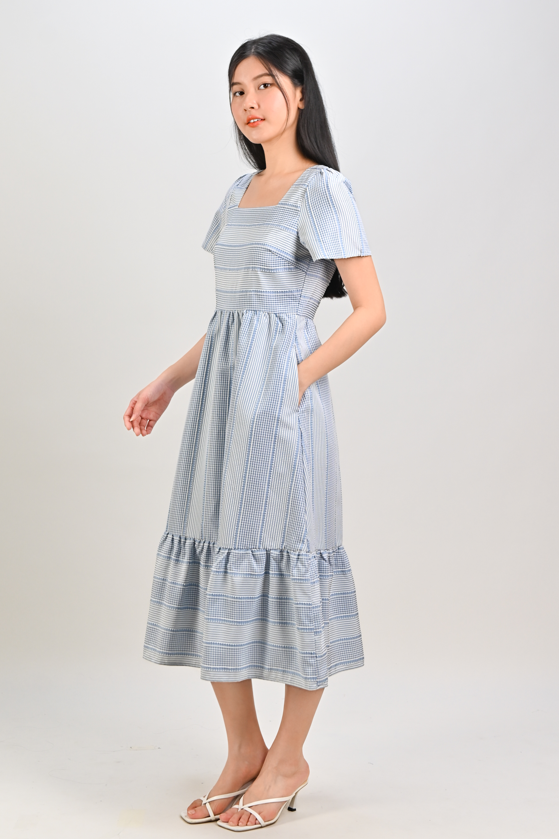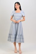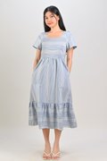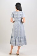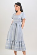 STRIPE-GINGHAM SQUARE-NECK MIDI DRESS IN BLUE