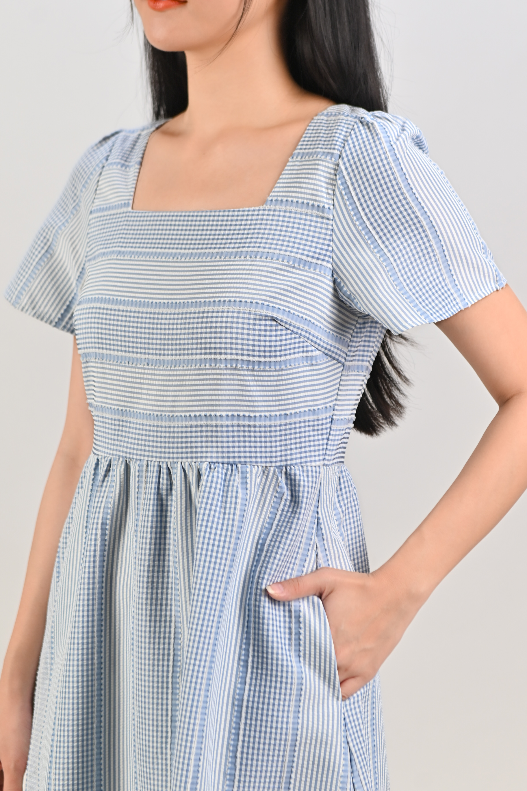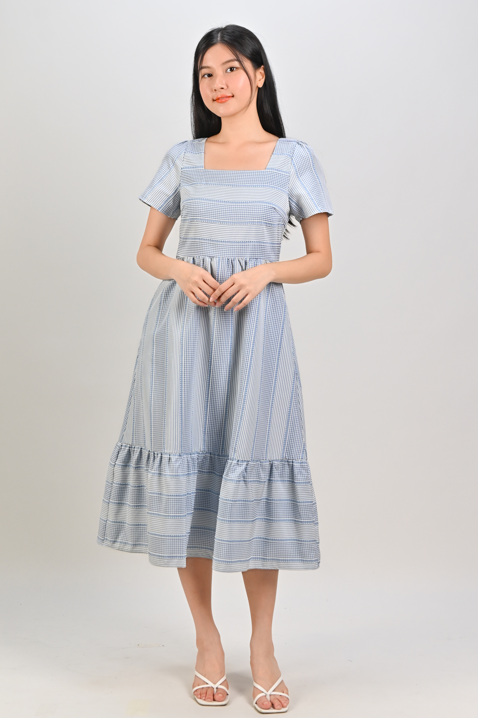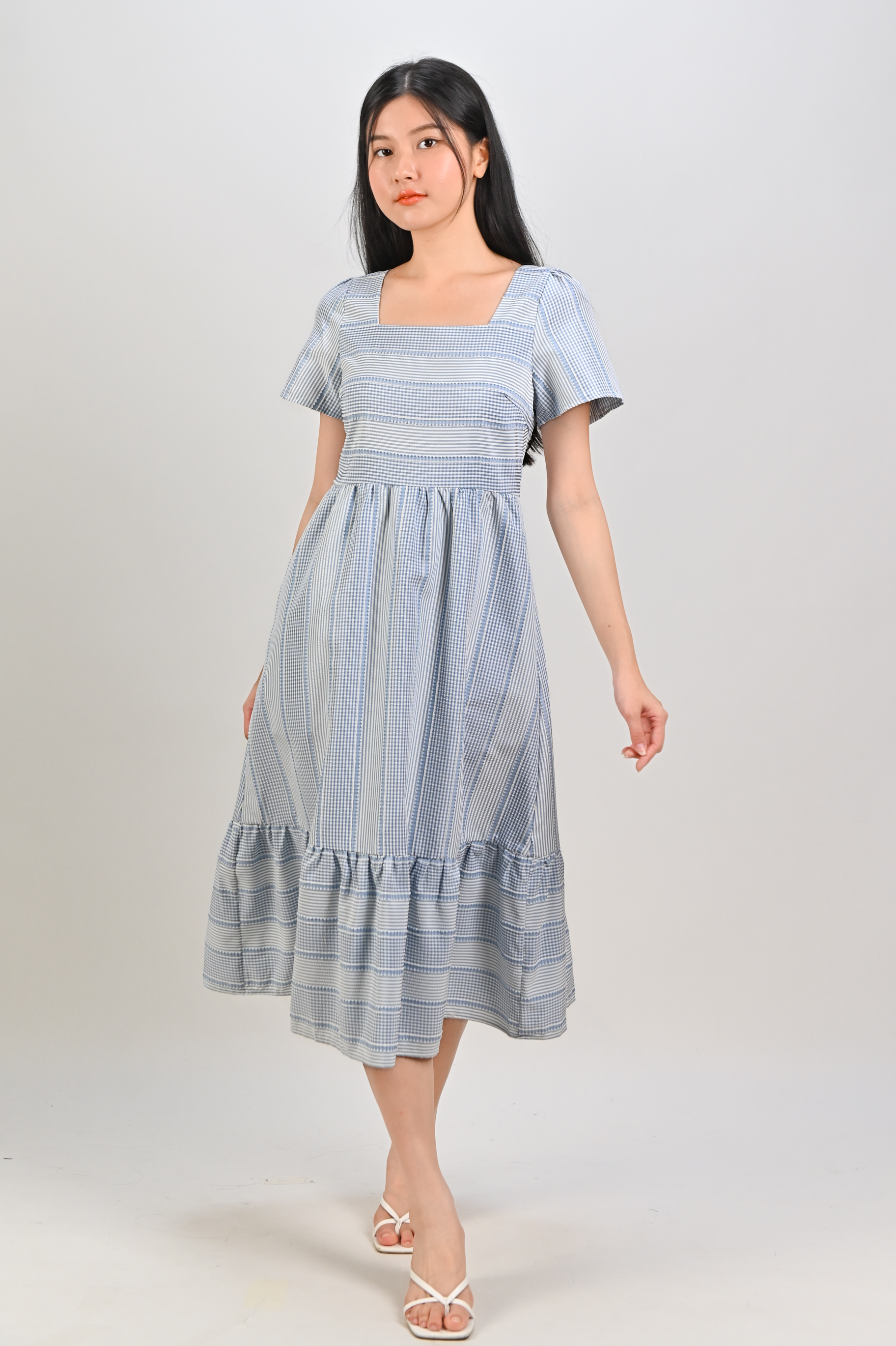 Actual stocks may varyStep out in style in our Stripe-Gingham Square-Neck Midi Dress! 💃 A chic combo of stripes + gingham on a classy timeless cut!