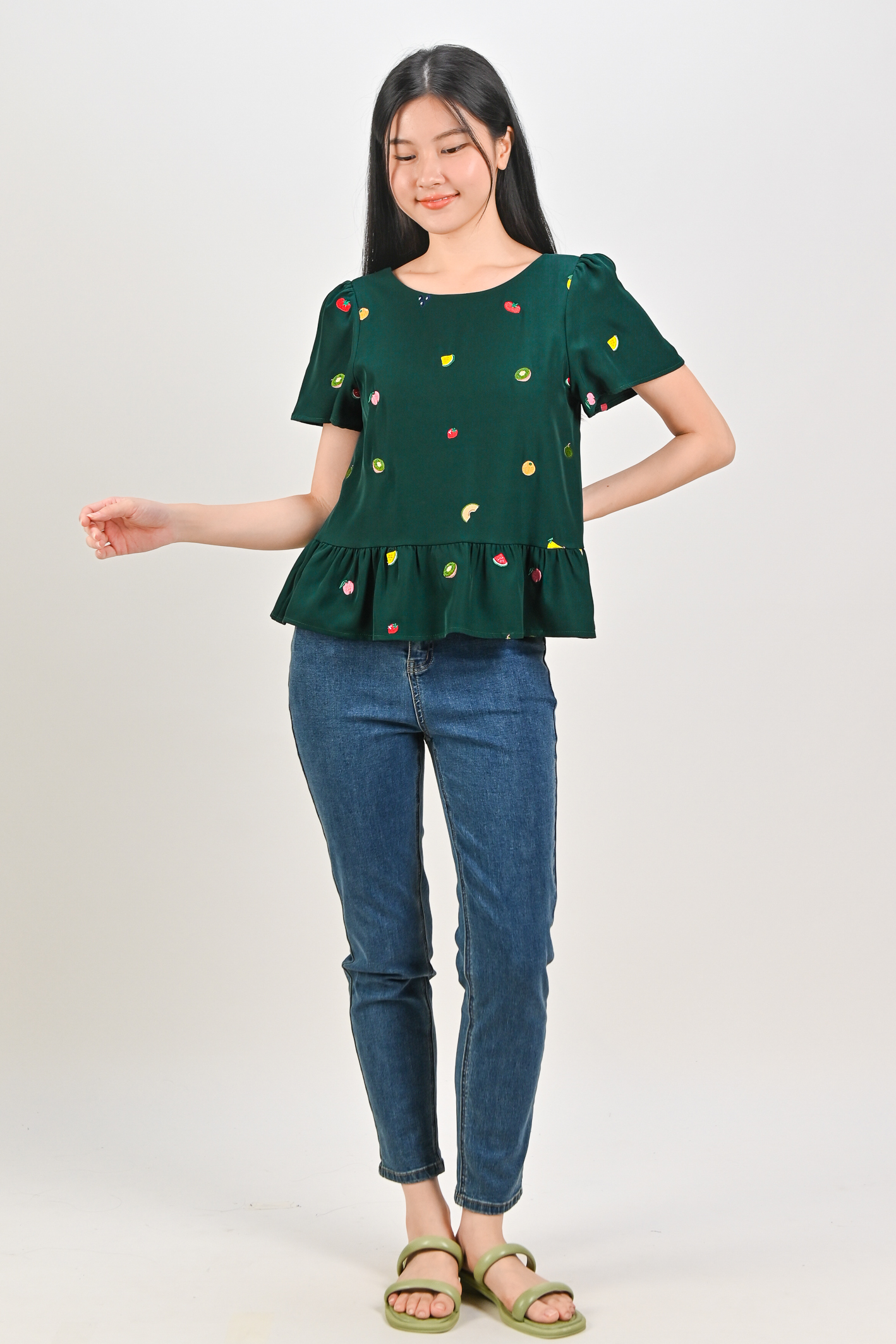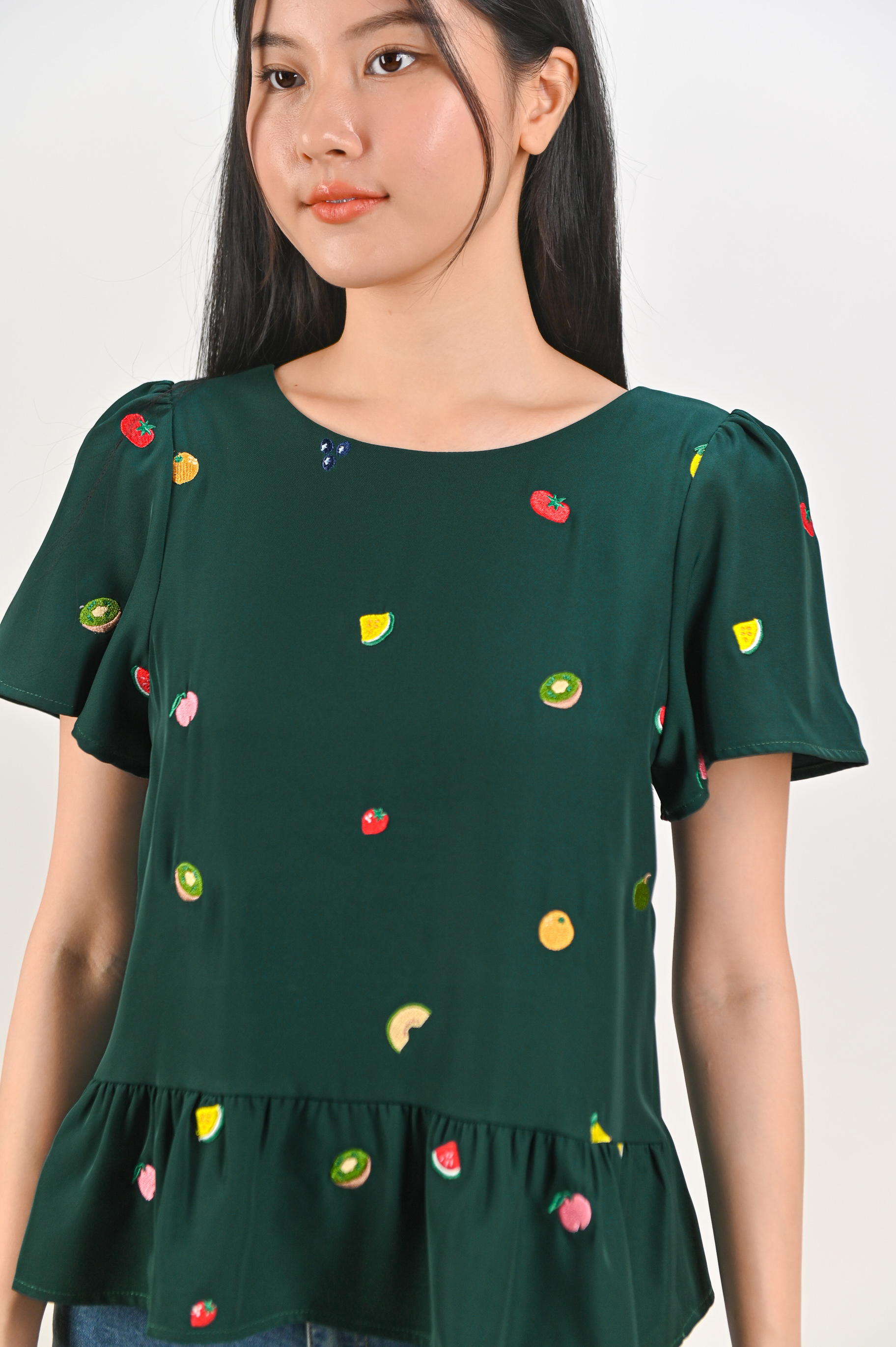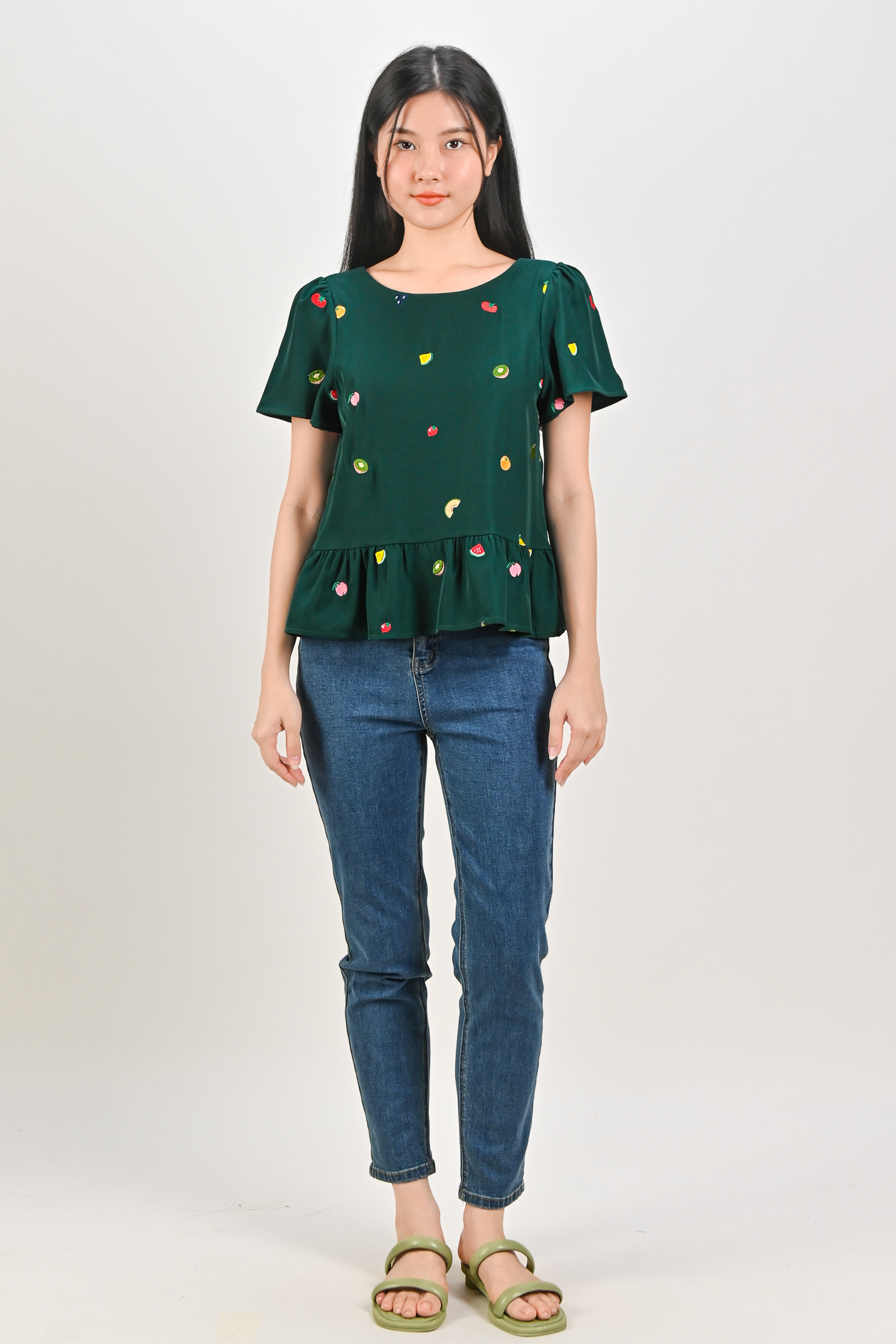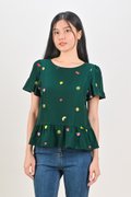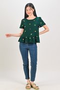 SUMMER HARVEST EMB. SLEEVED FLOUNCE TOP IN FOREST