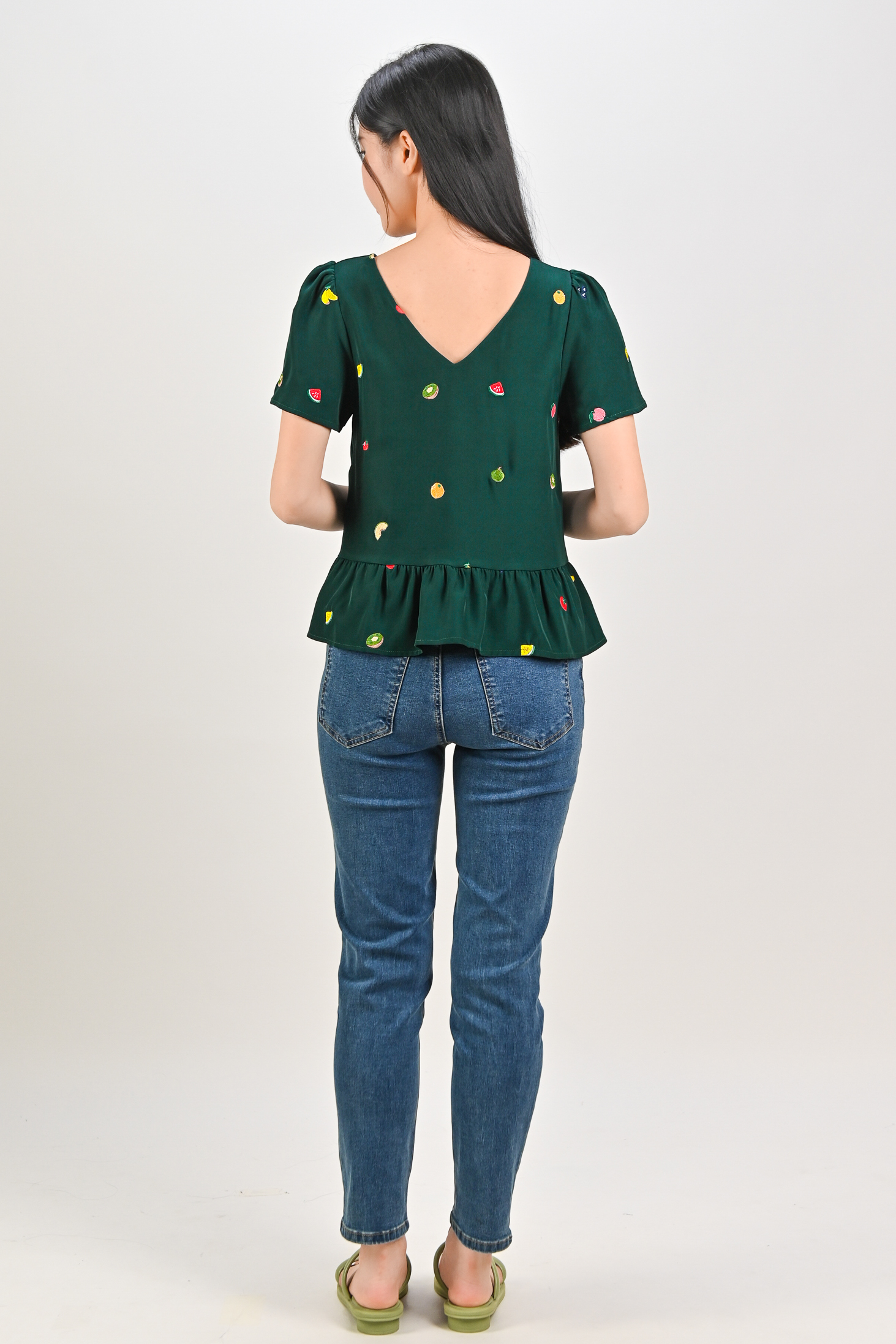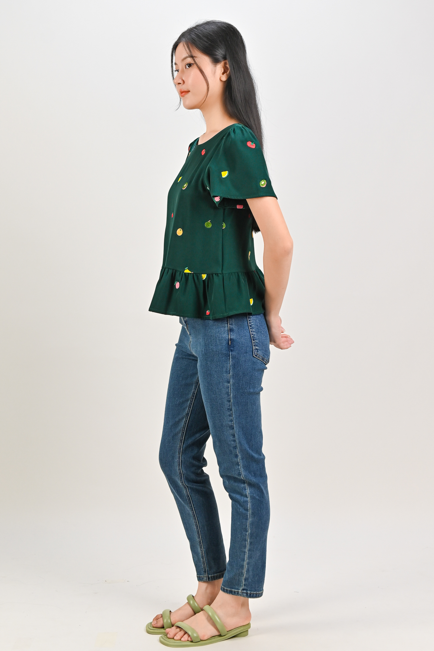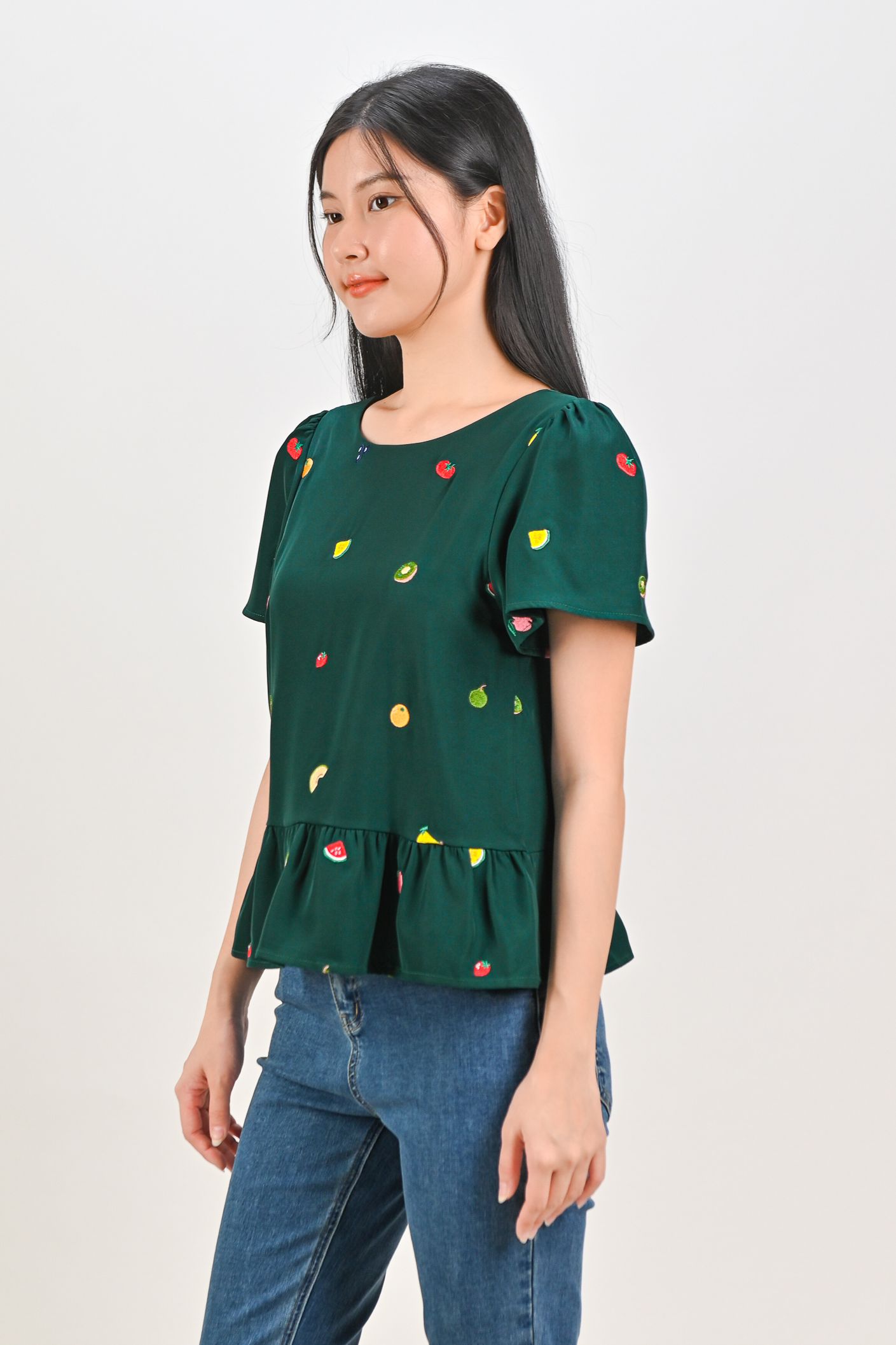 SUMMER HARVEST EMB. SLEEVED FLOUNCE TOP IN FOREST