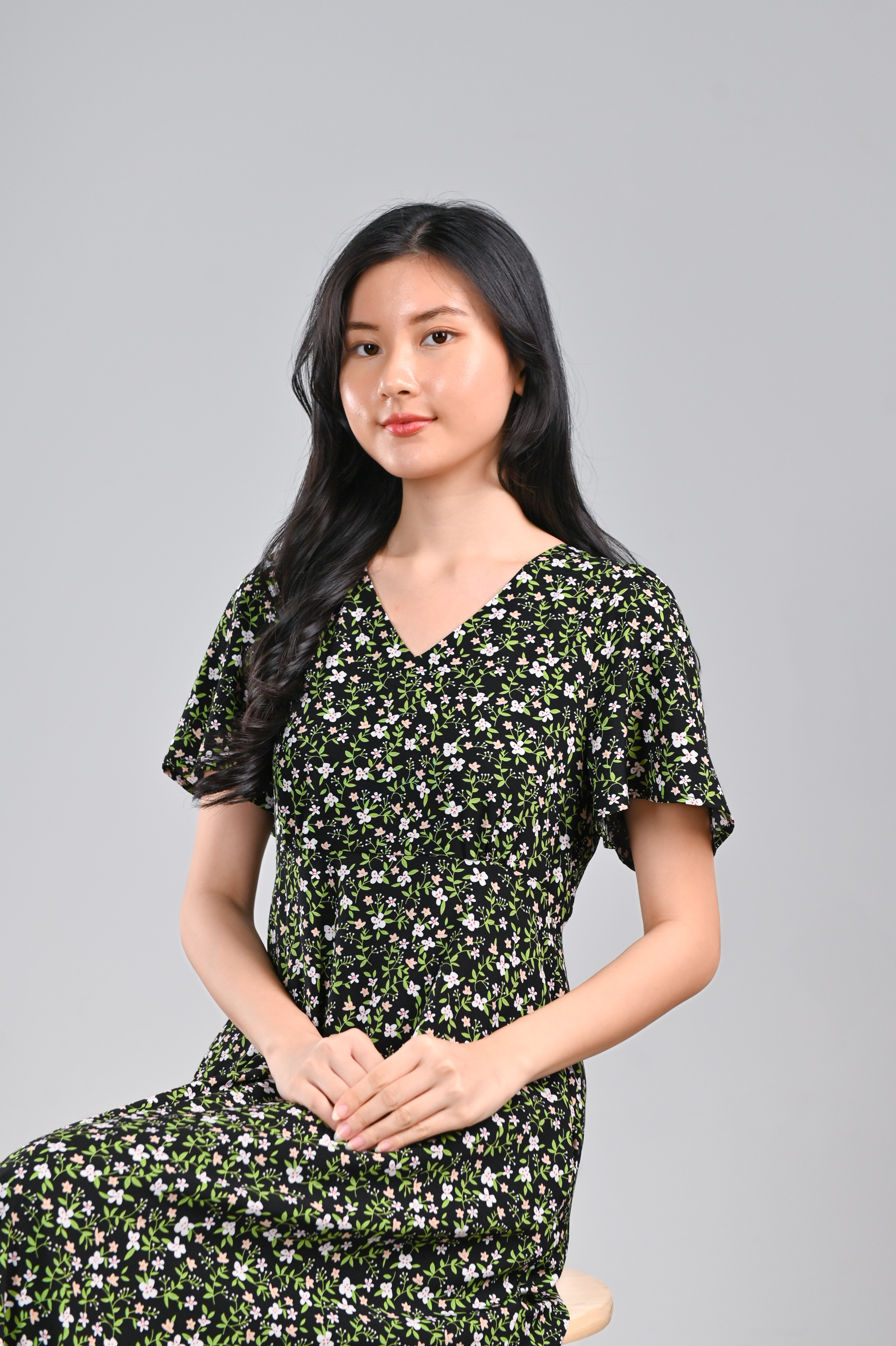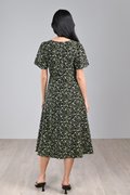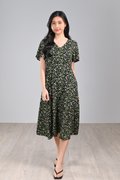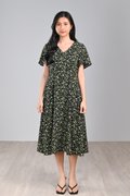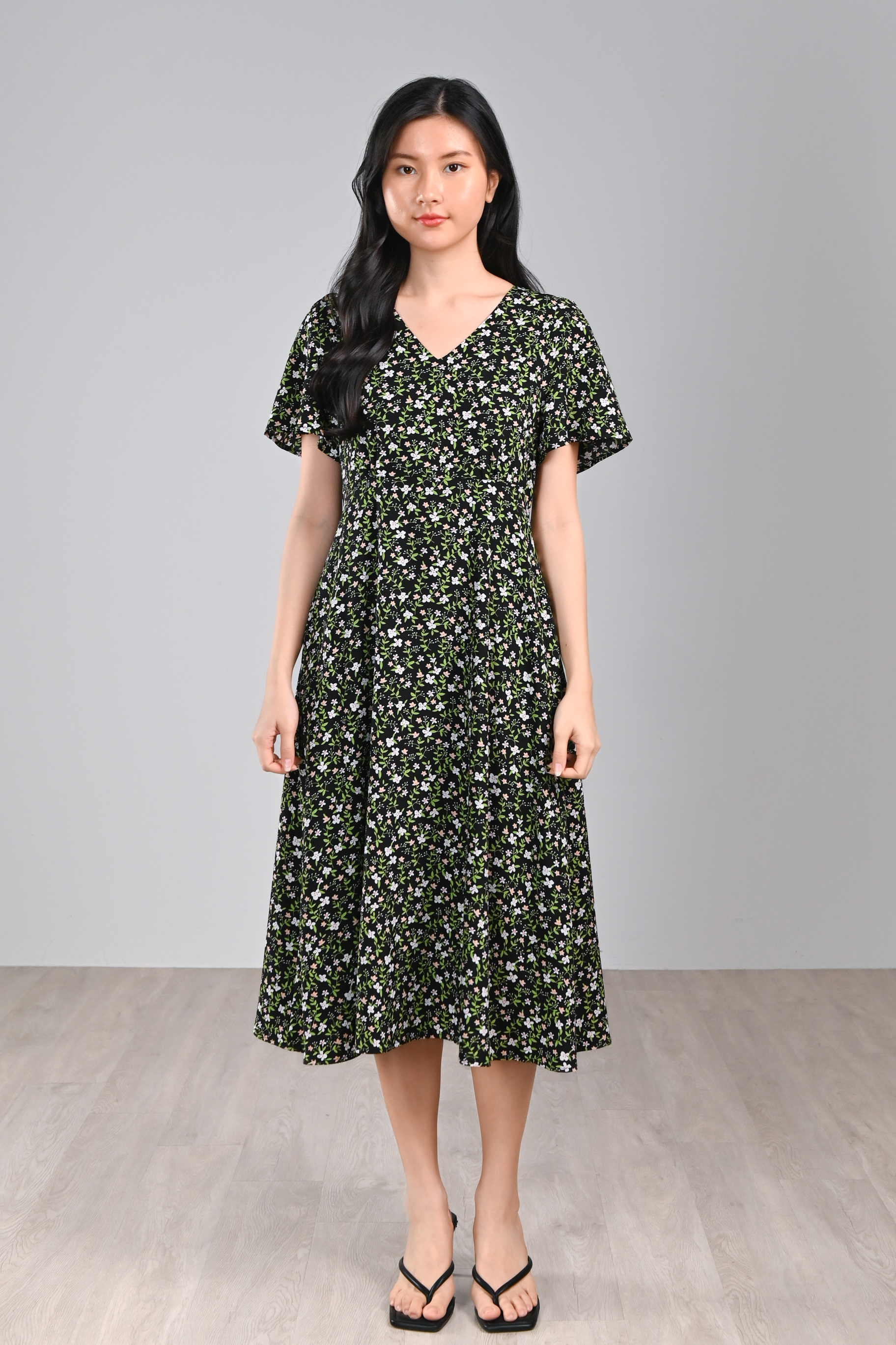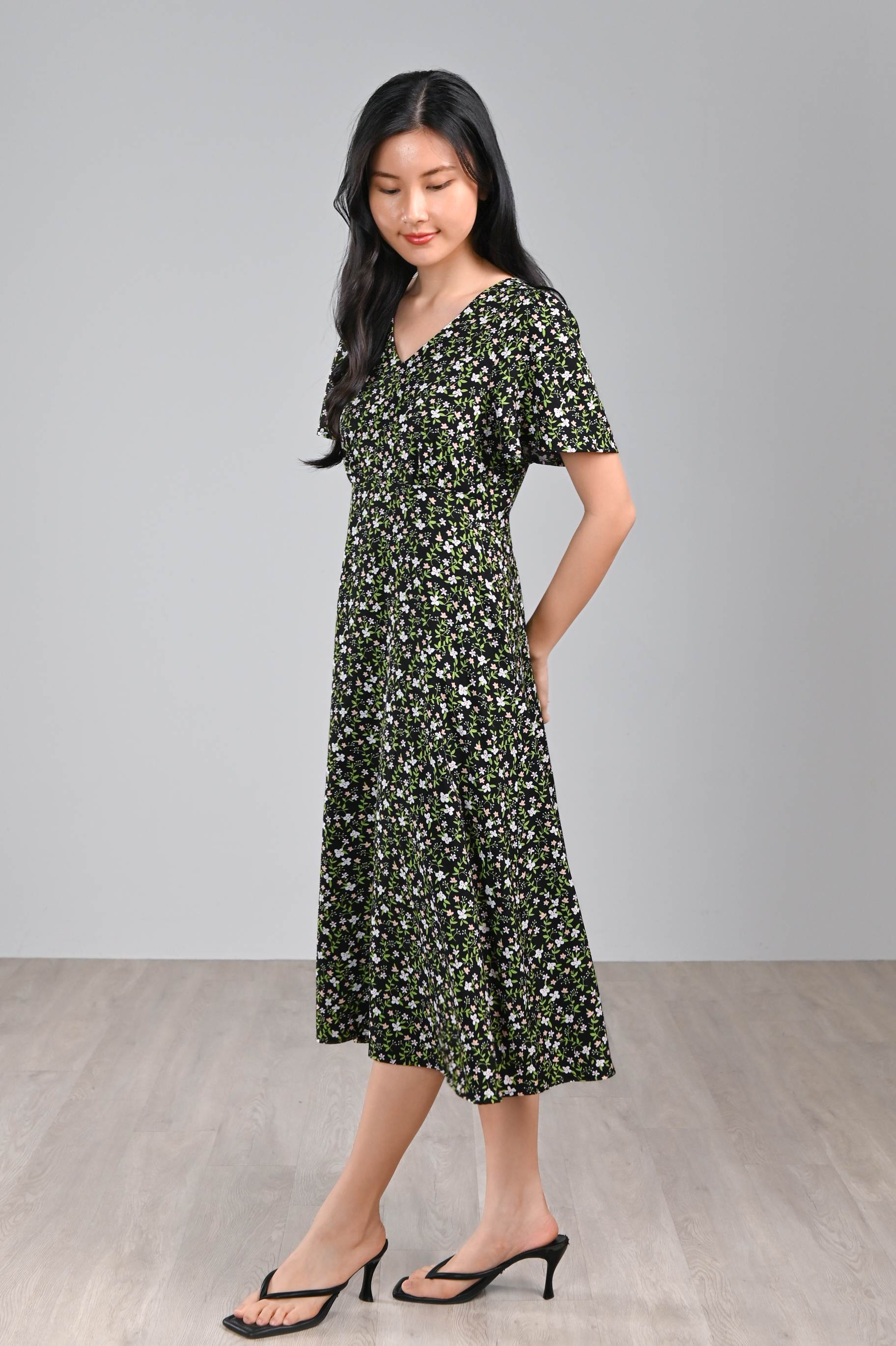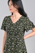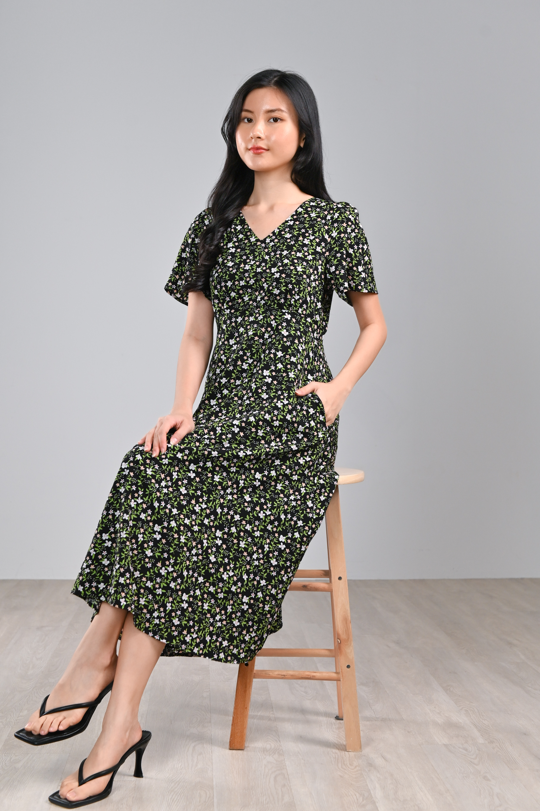 SURI SLEEVED V-NECK HIGH-WAIST DRESS IN BLACK FLORAL