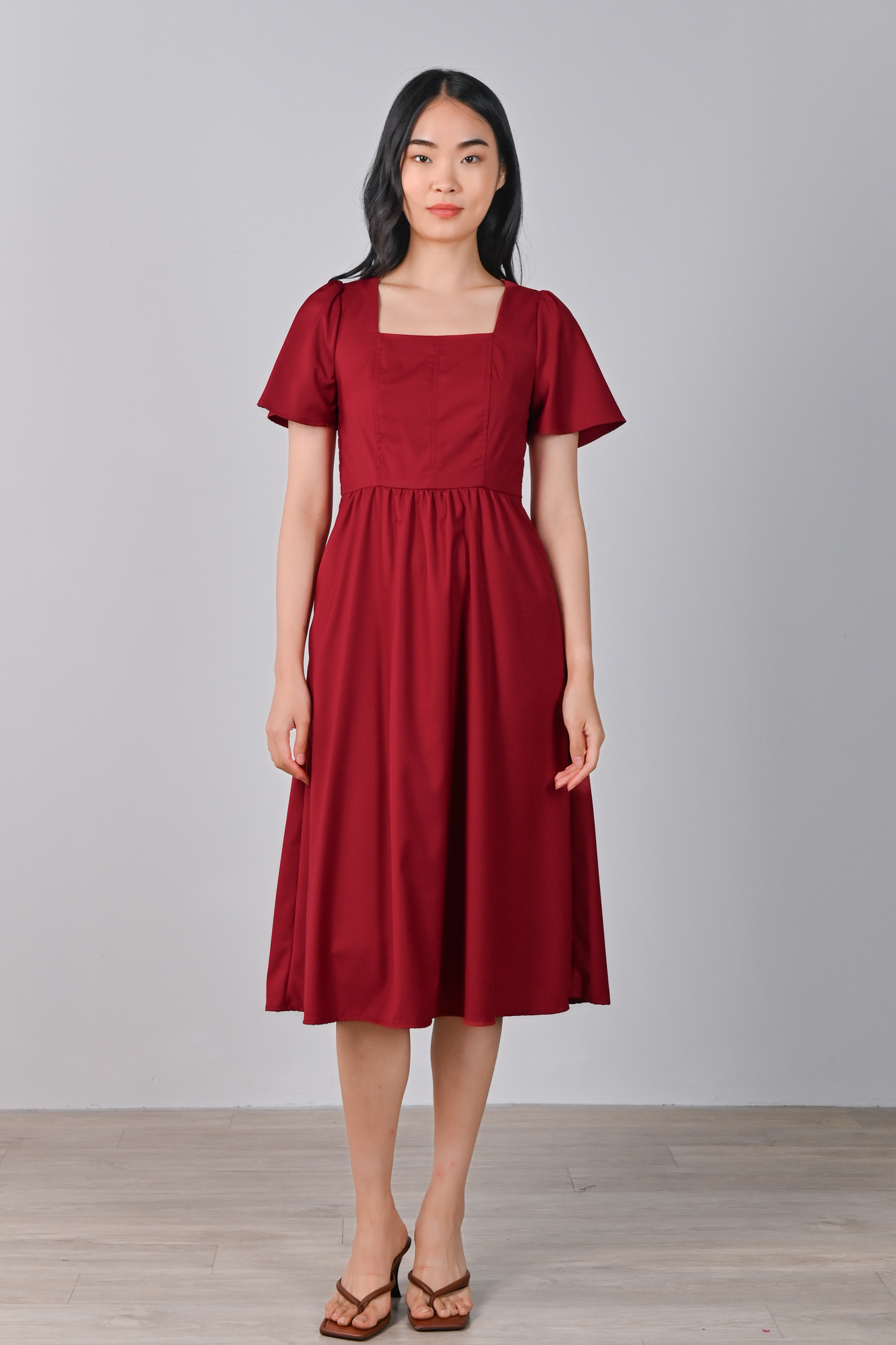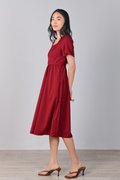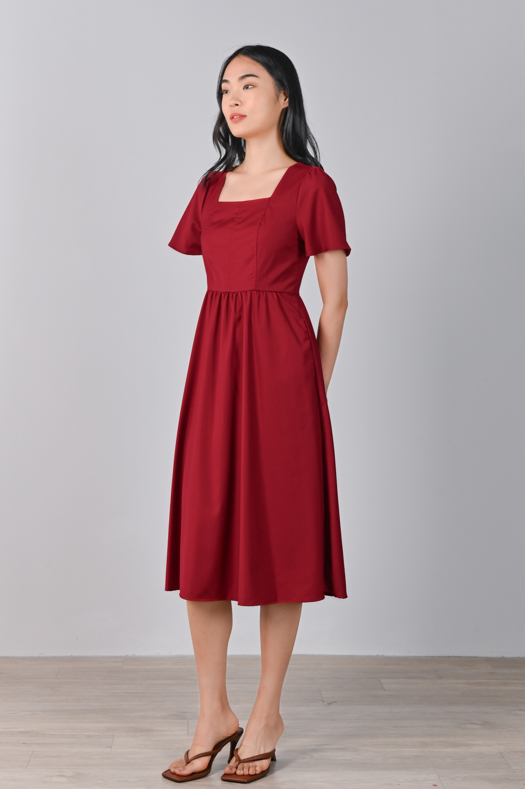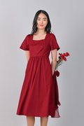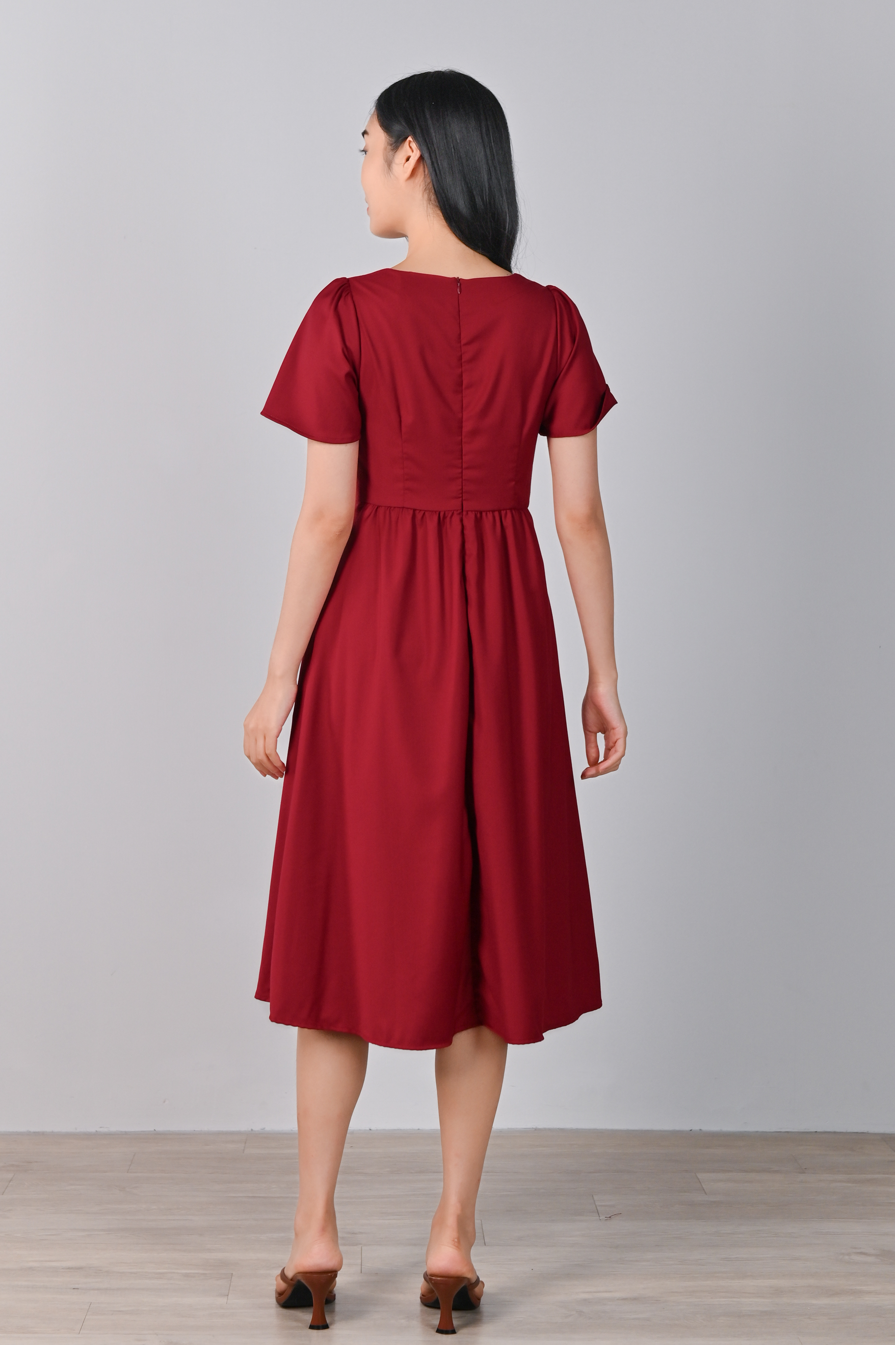 TEAGEN PANELLED SLEEVED MIDI DRESS IN RED
