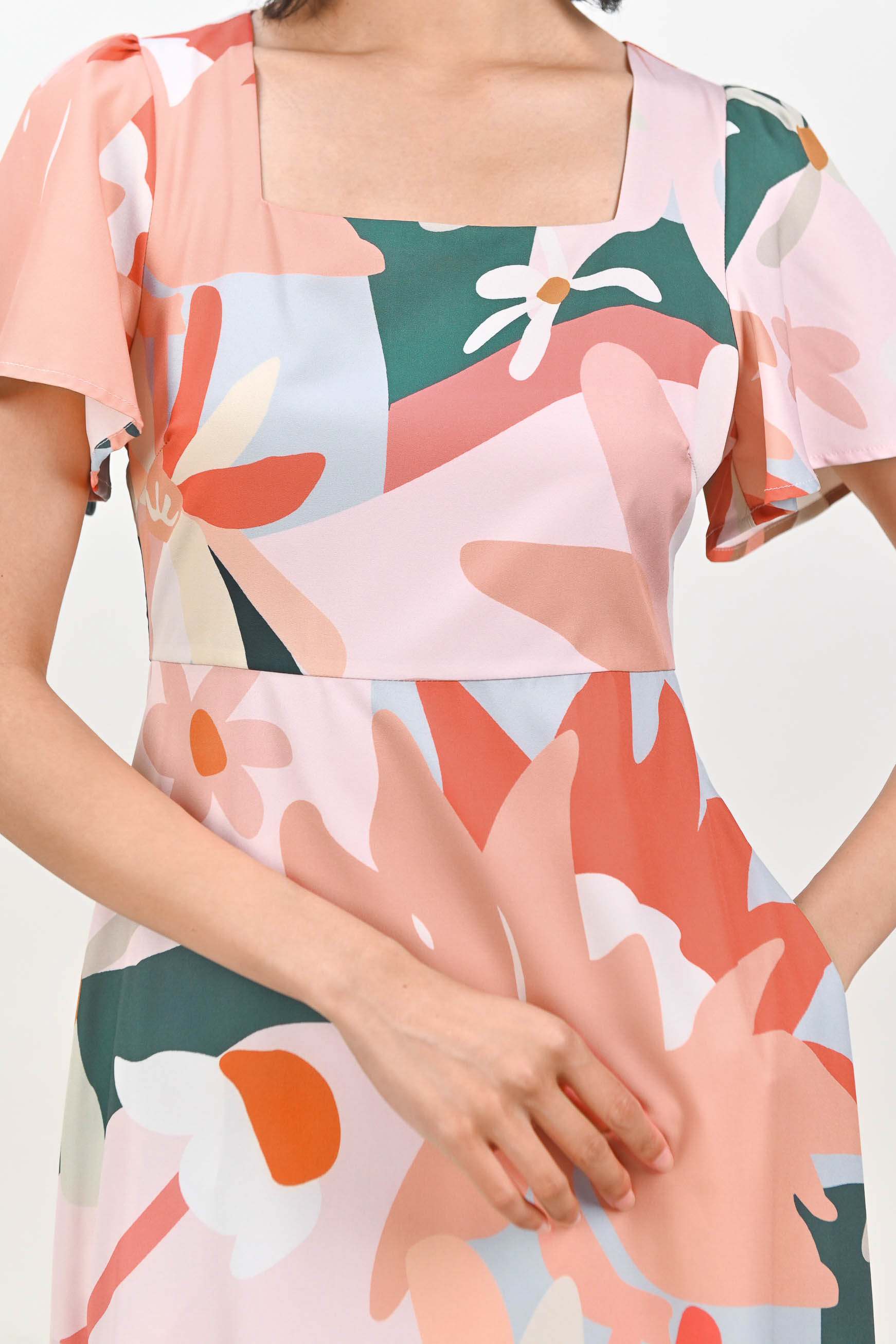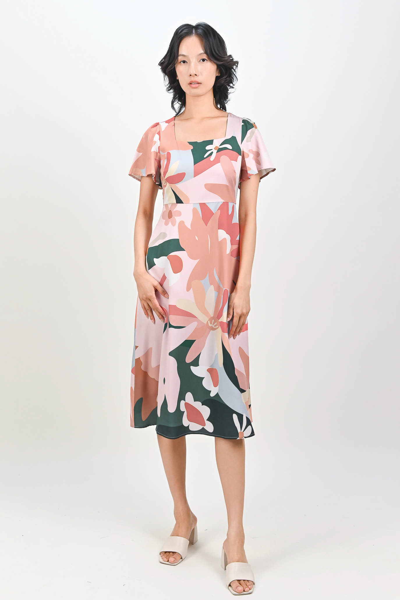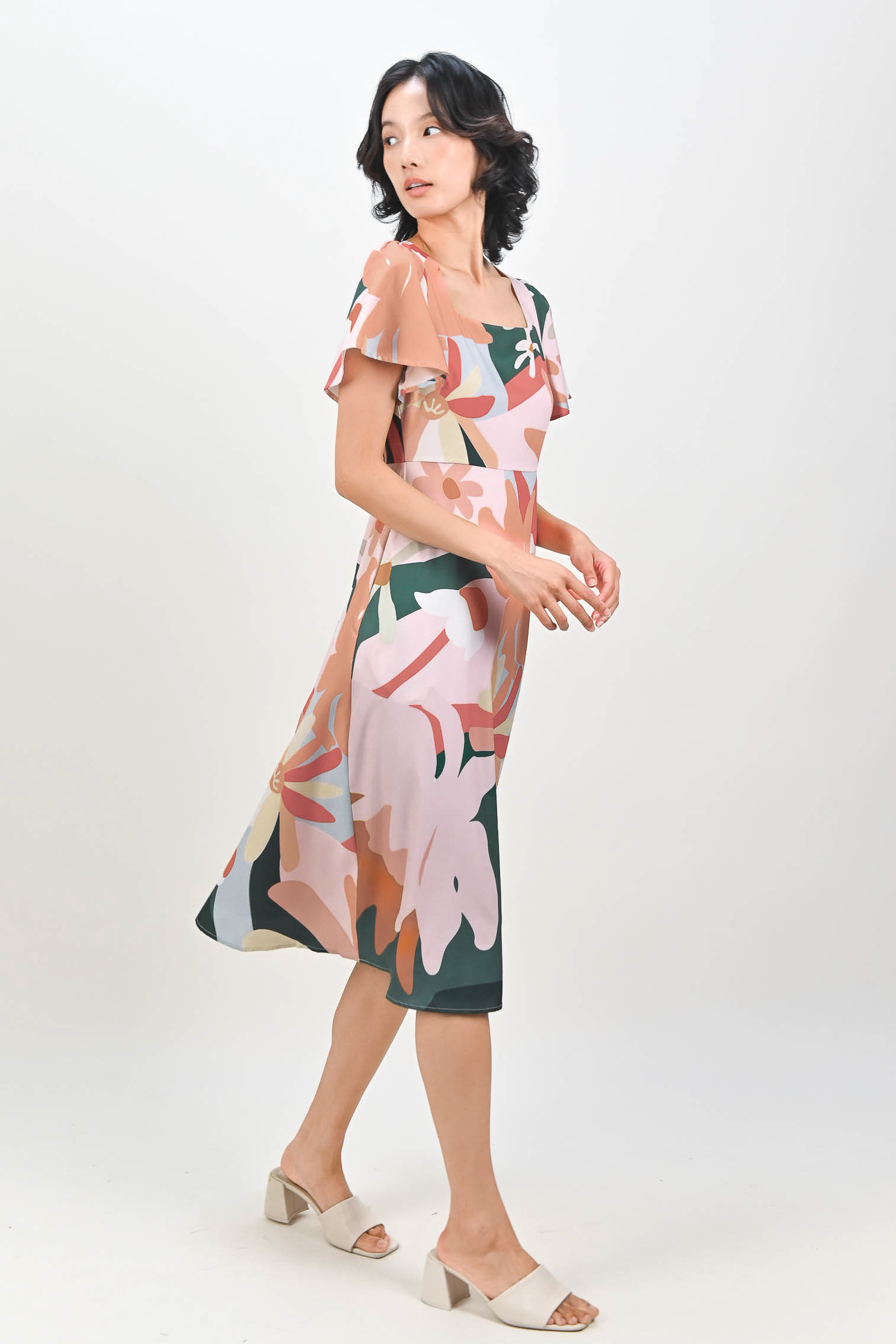 TEAL GARDENS SQUARE-NECK SLEEVED MIDI DRESS