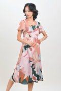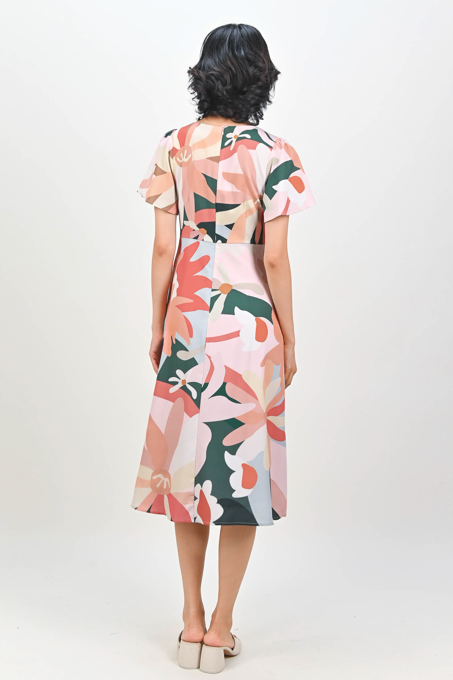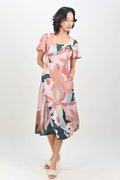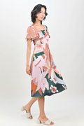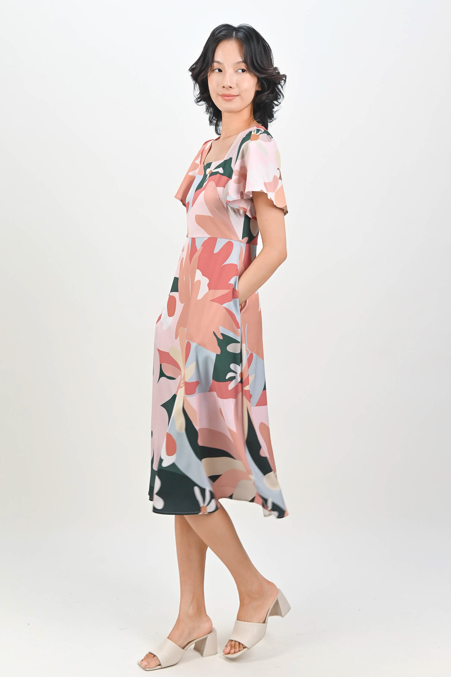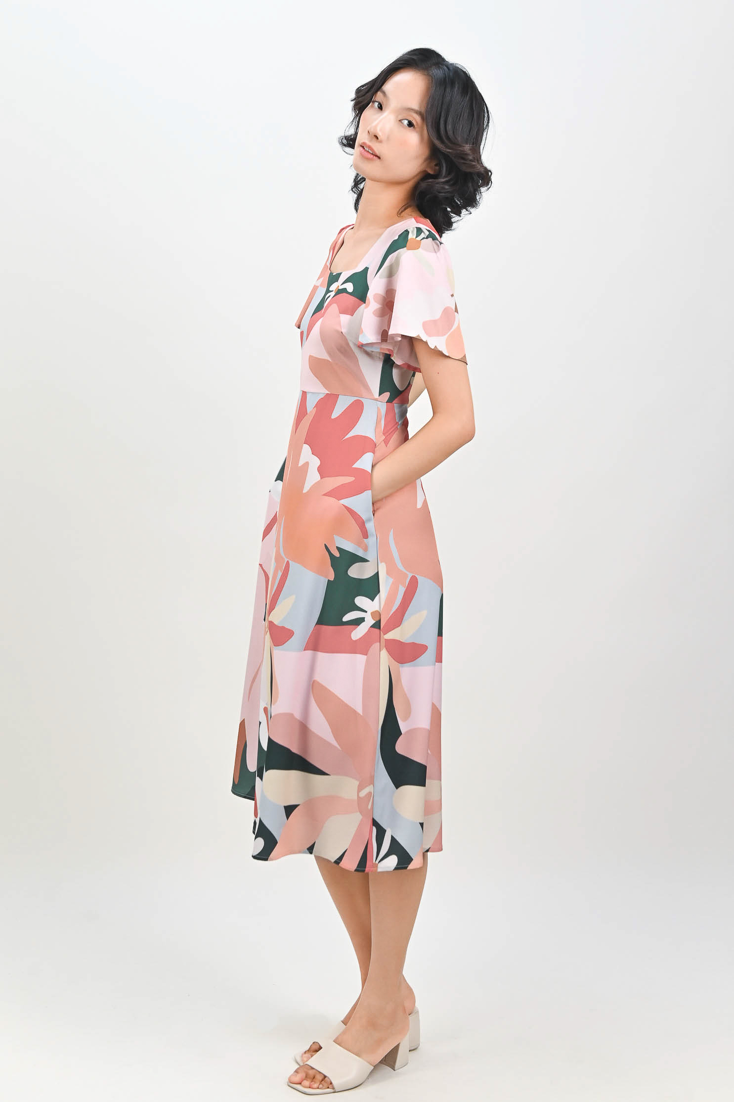 TEAL GARDENS SQUARE-NECK SLEEVED MIDI DRESS
