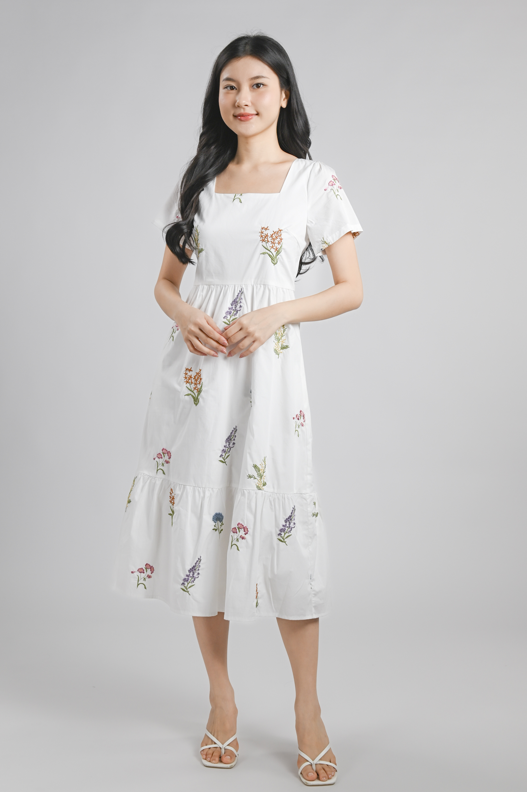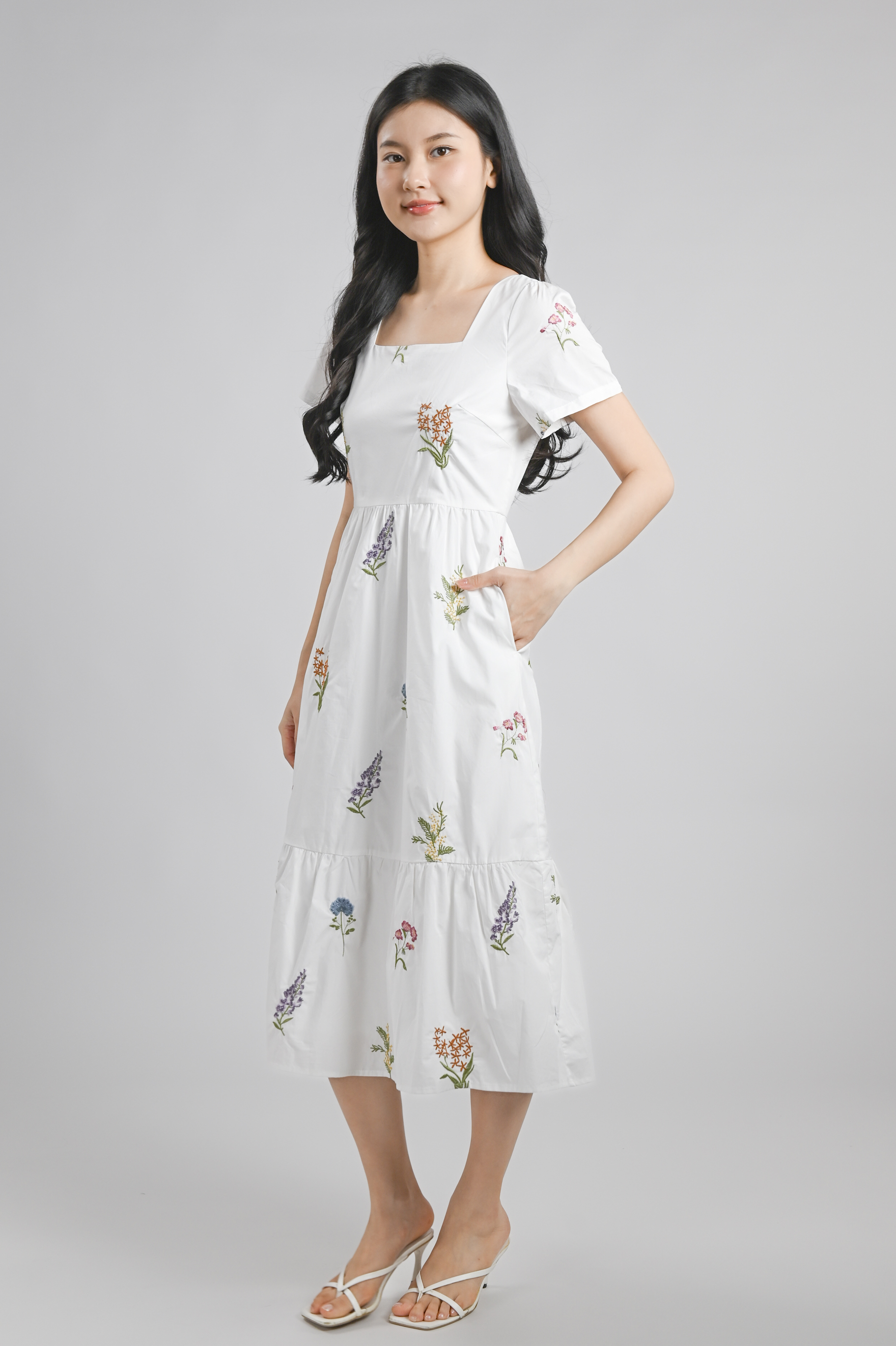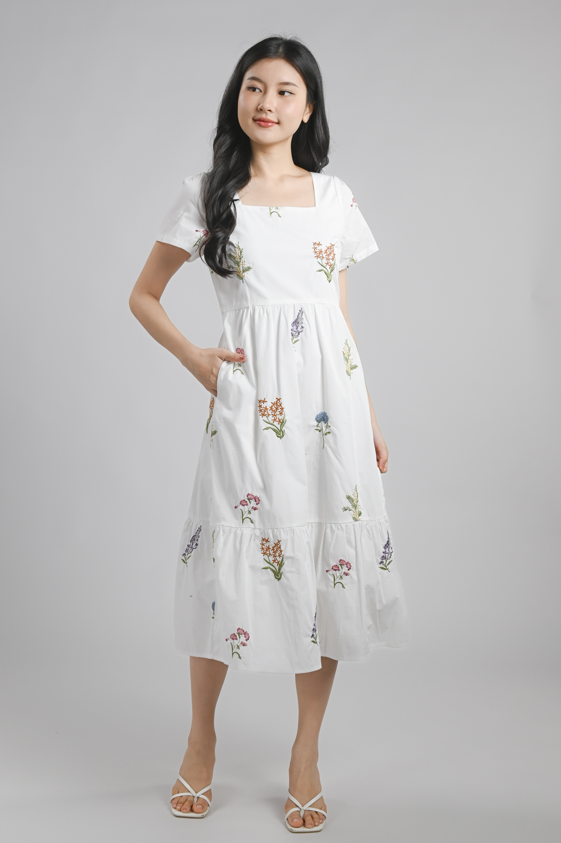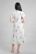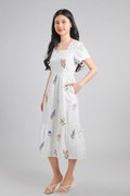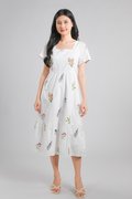 TEHULA EMB. FLORAL SQUARE-NECK SLEEVED DRESS IN WHITE