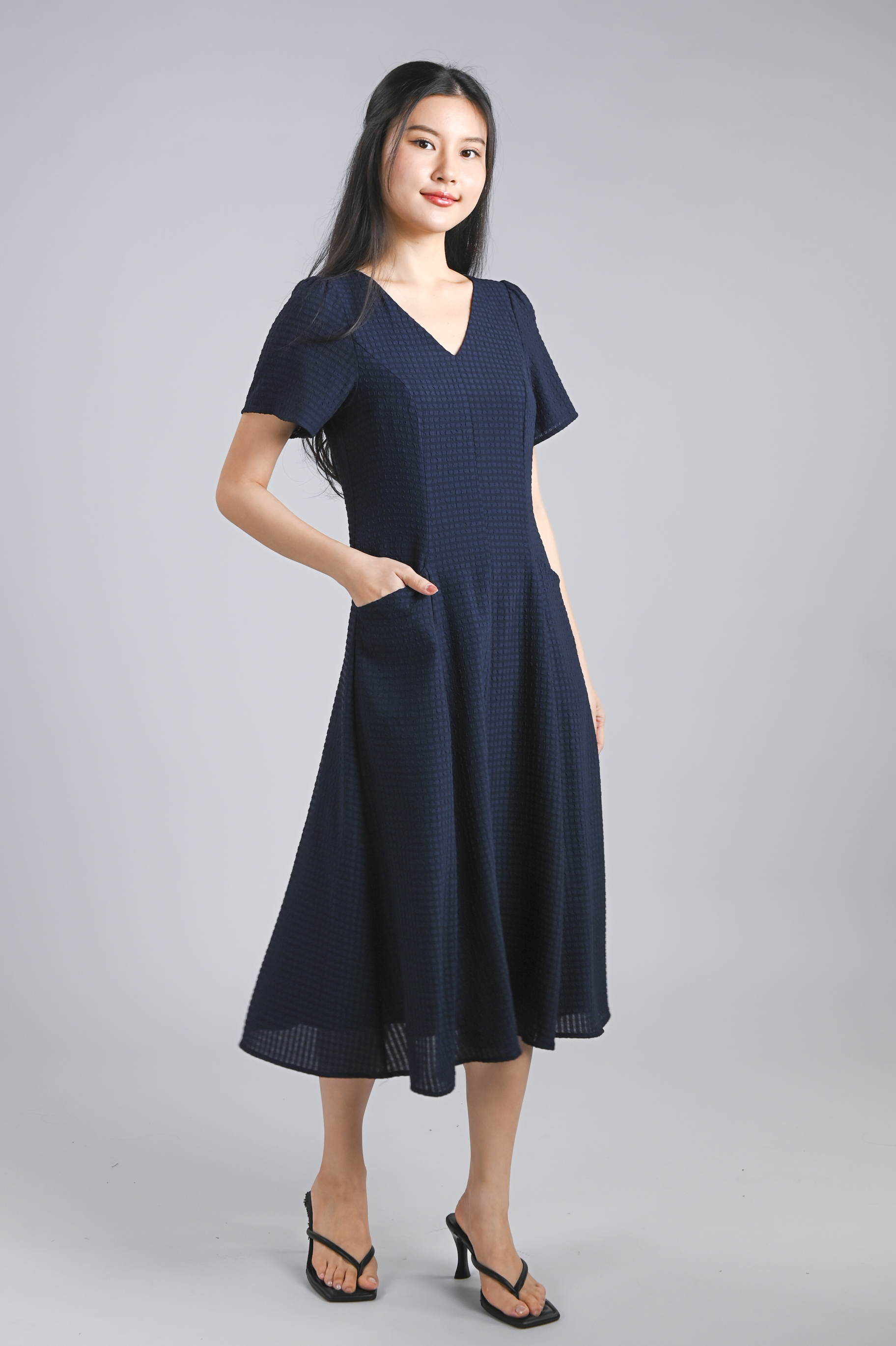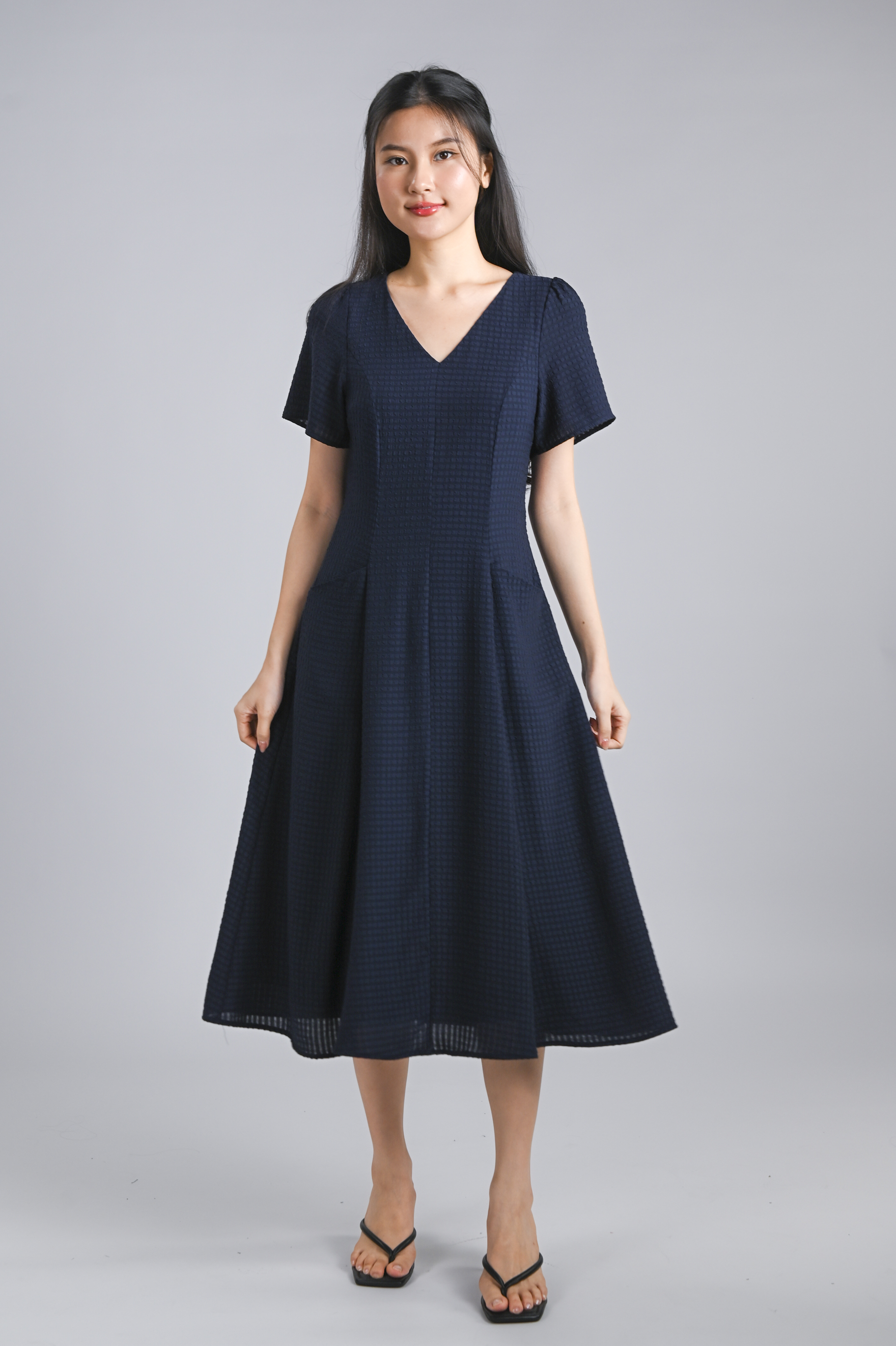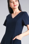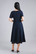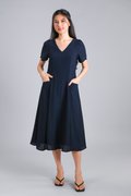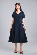 THELIA V-NECK SLEEVED PANELLED MIDI DRESS IN NAVY