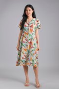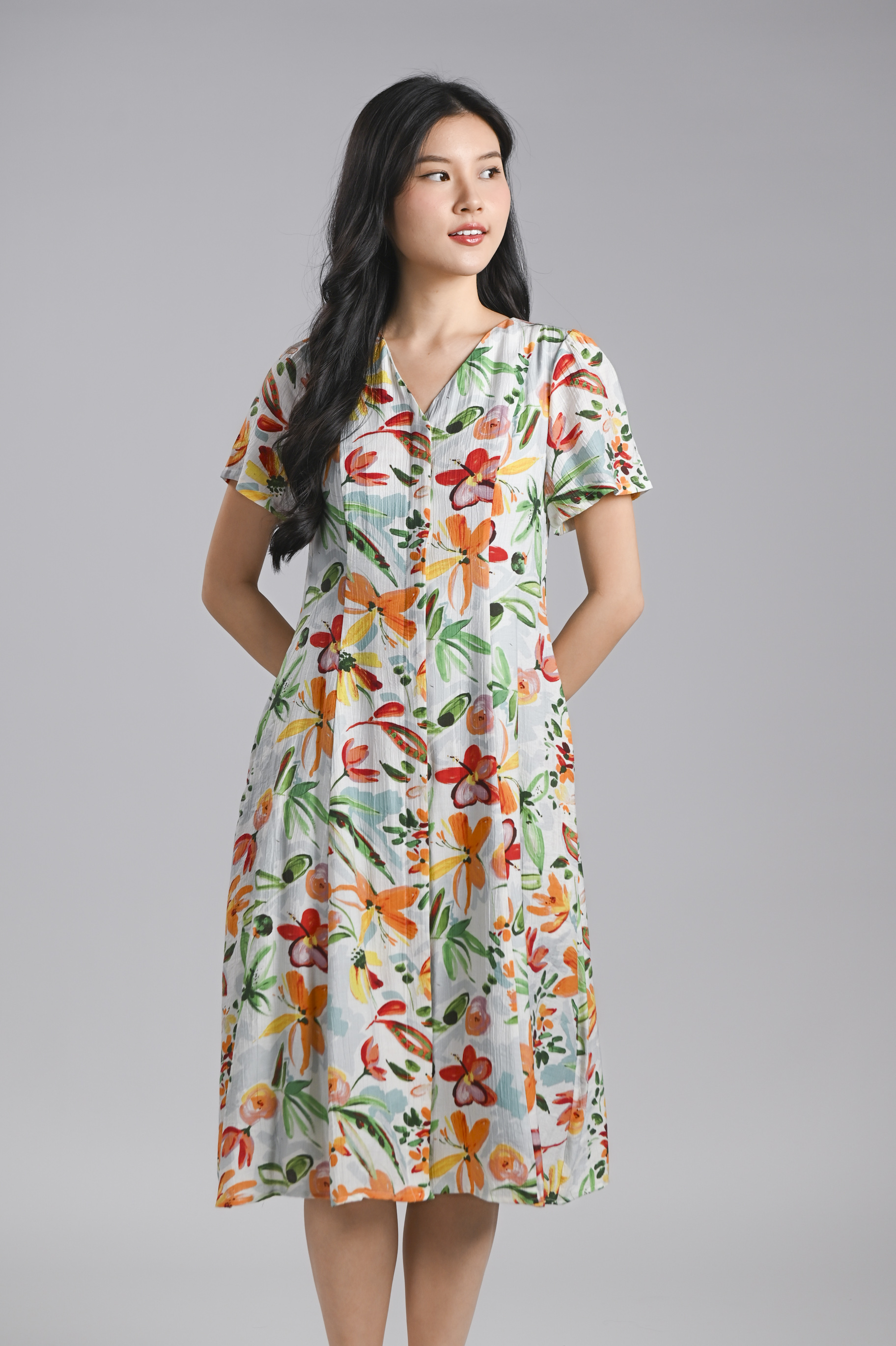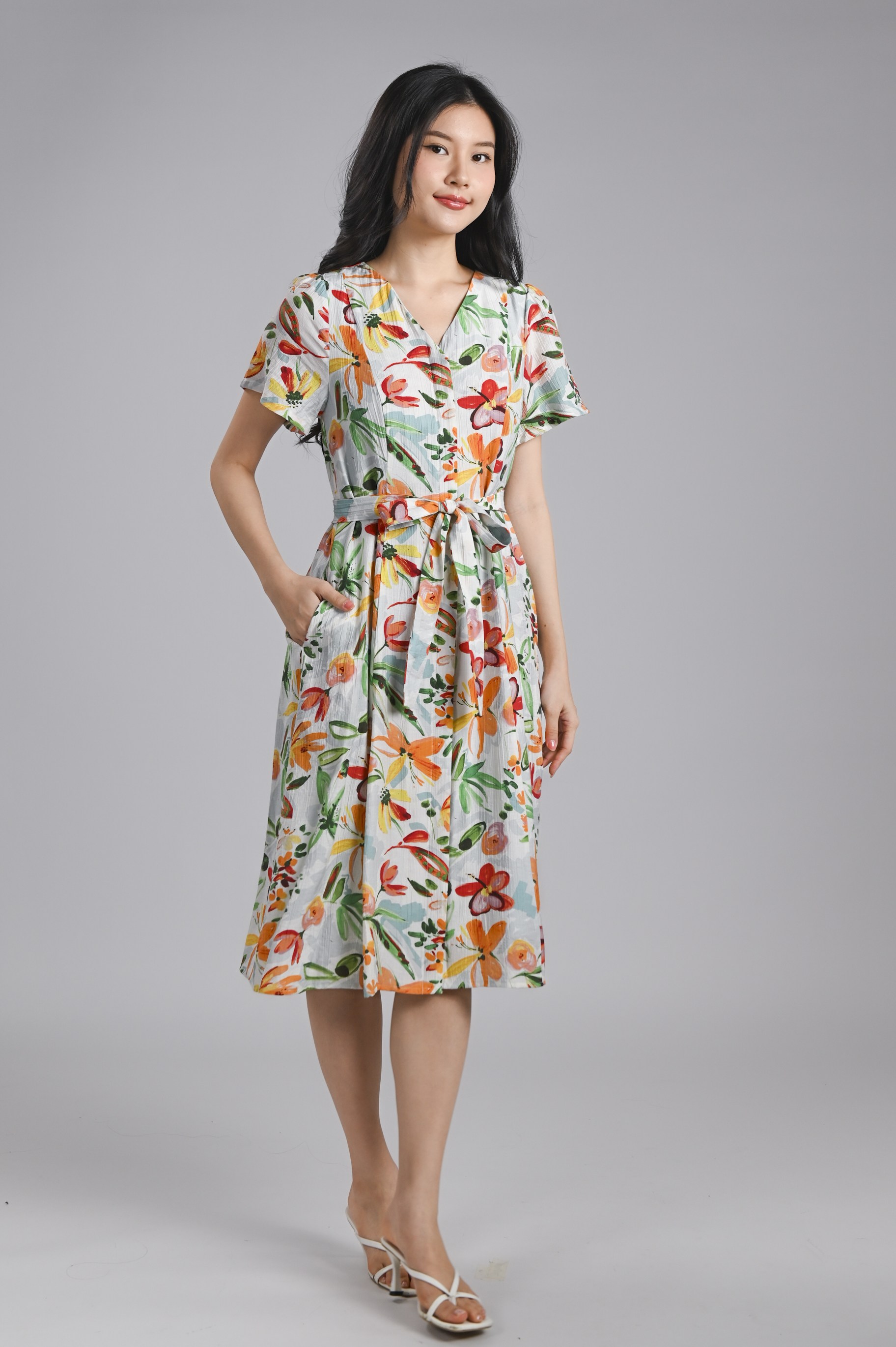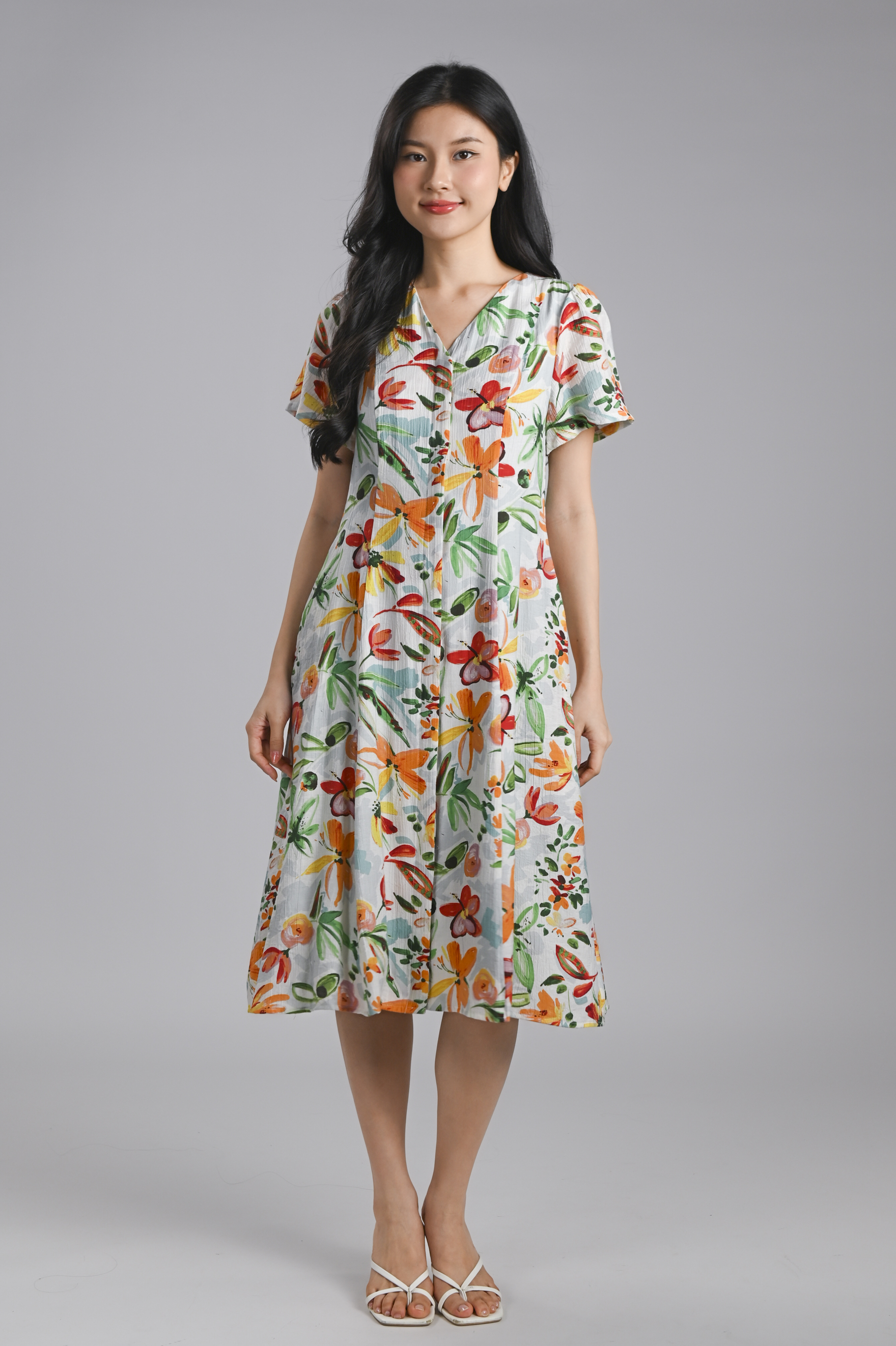 TORIA FLORAL SLEEVED BUTTON MIDI DRESS