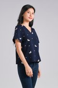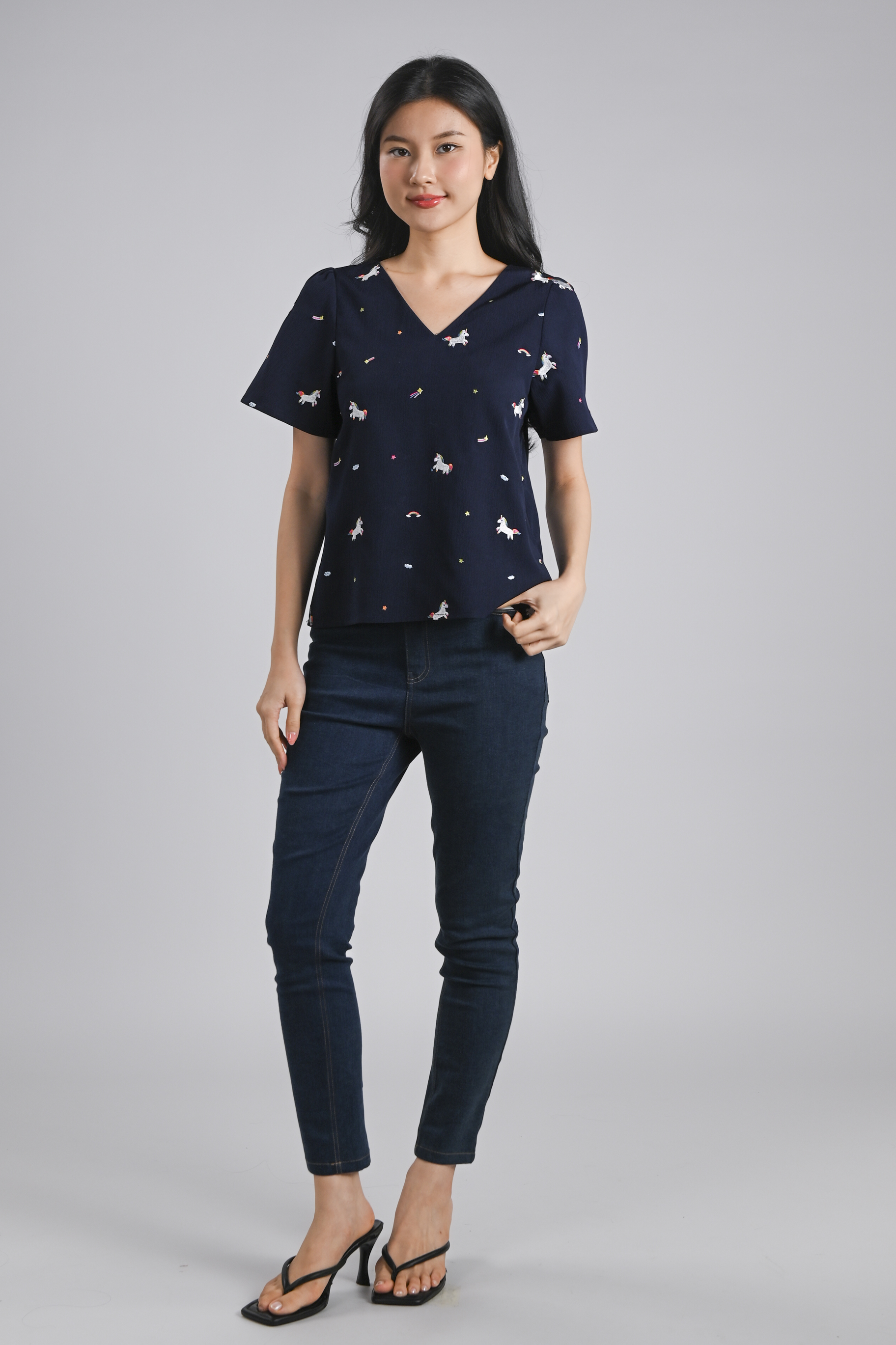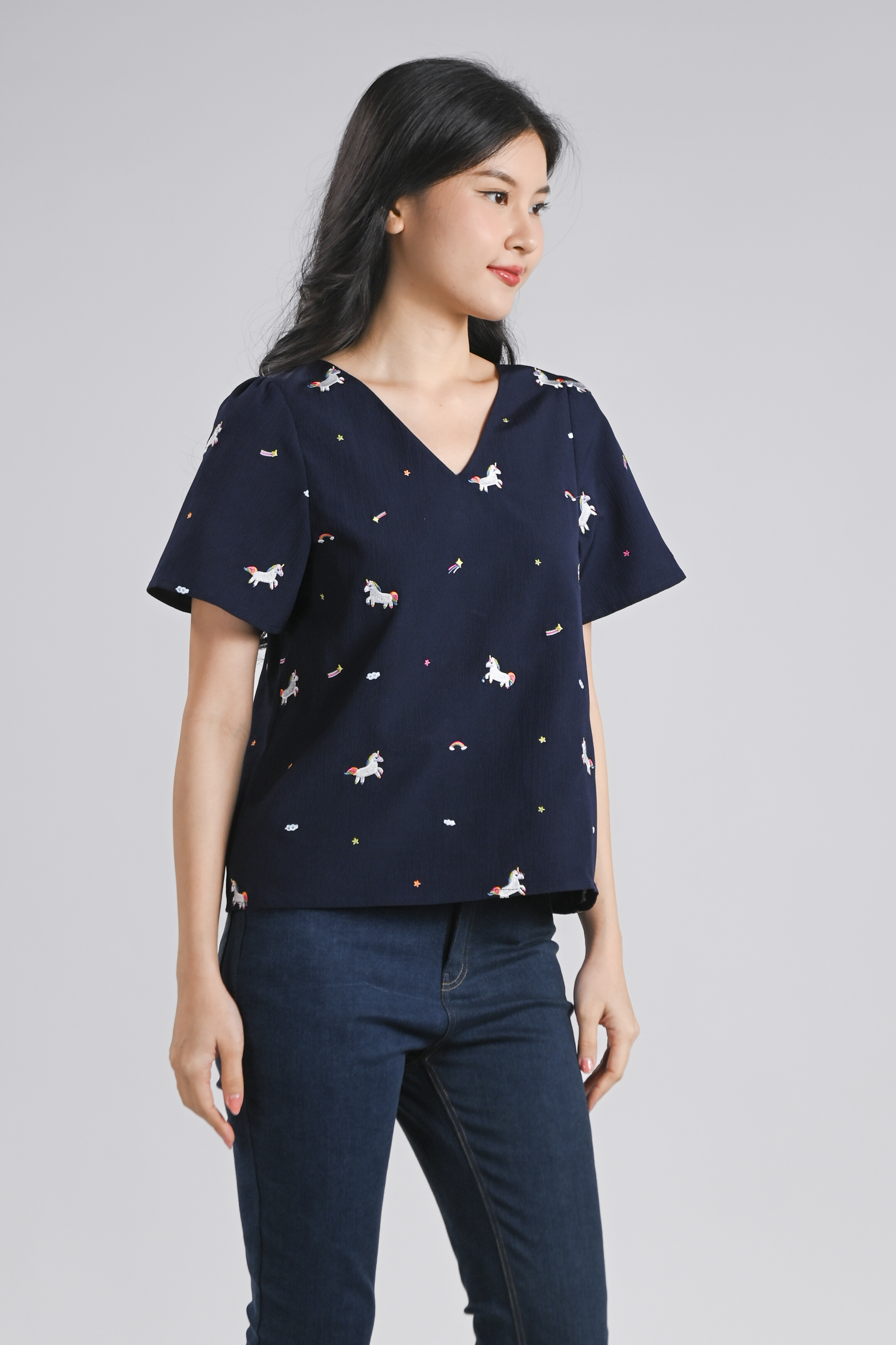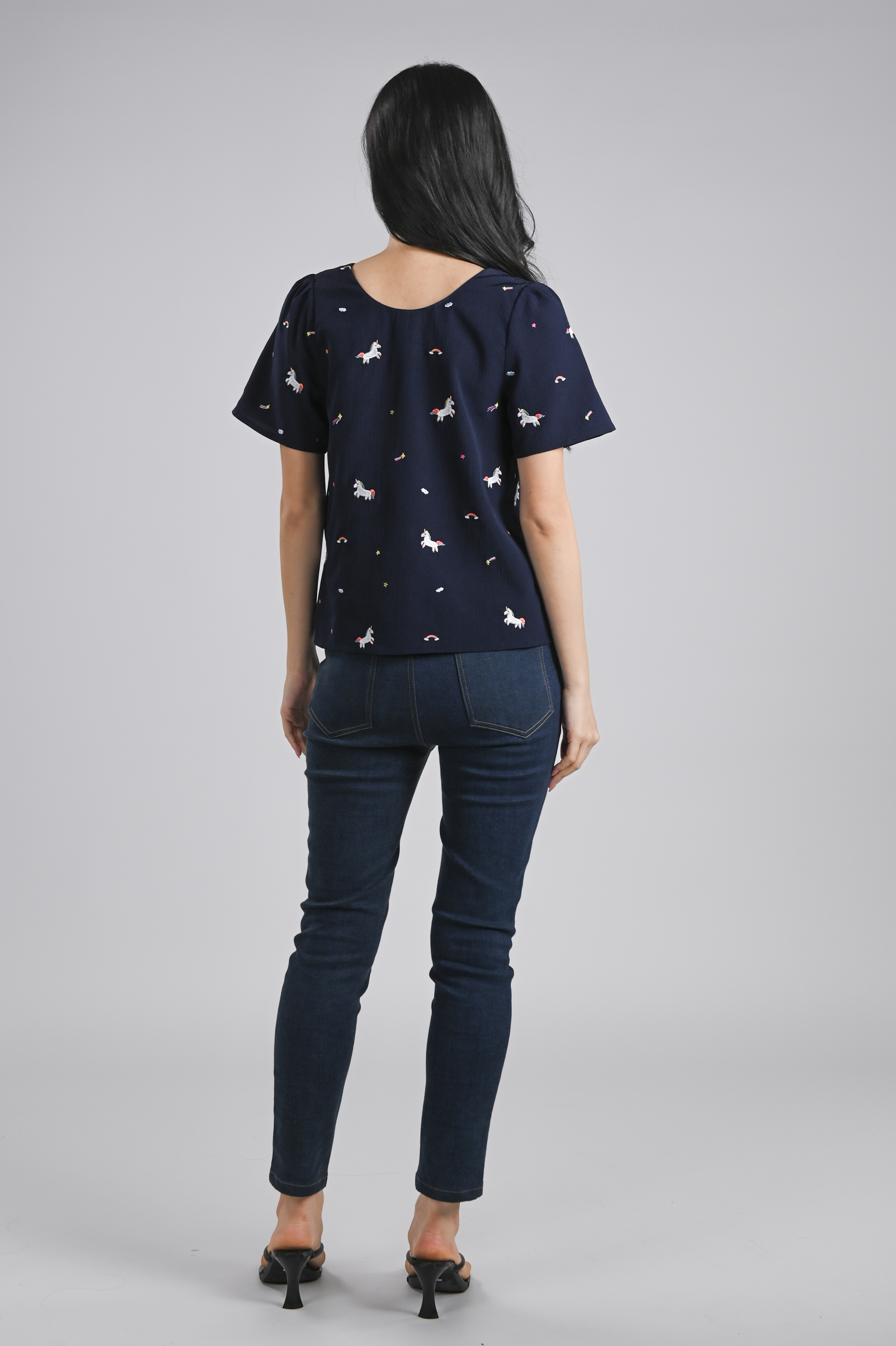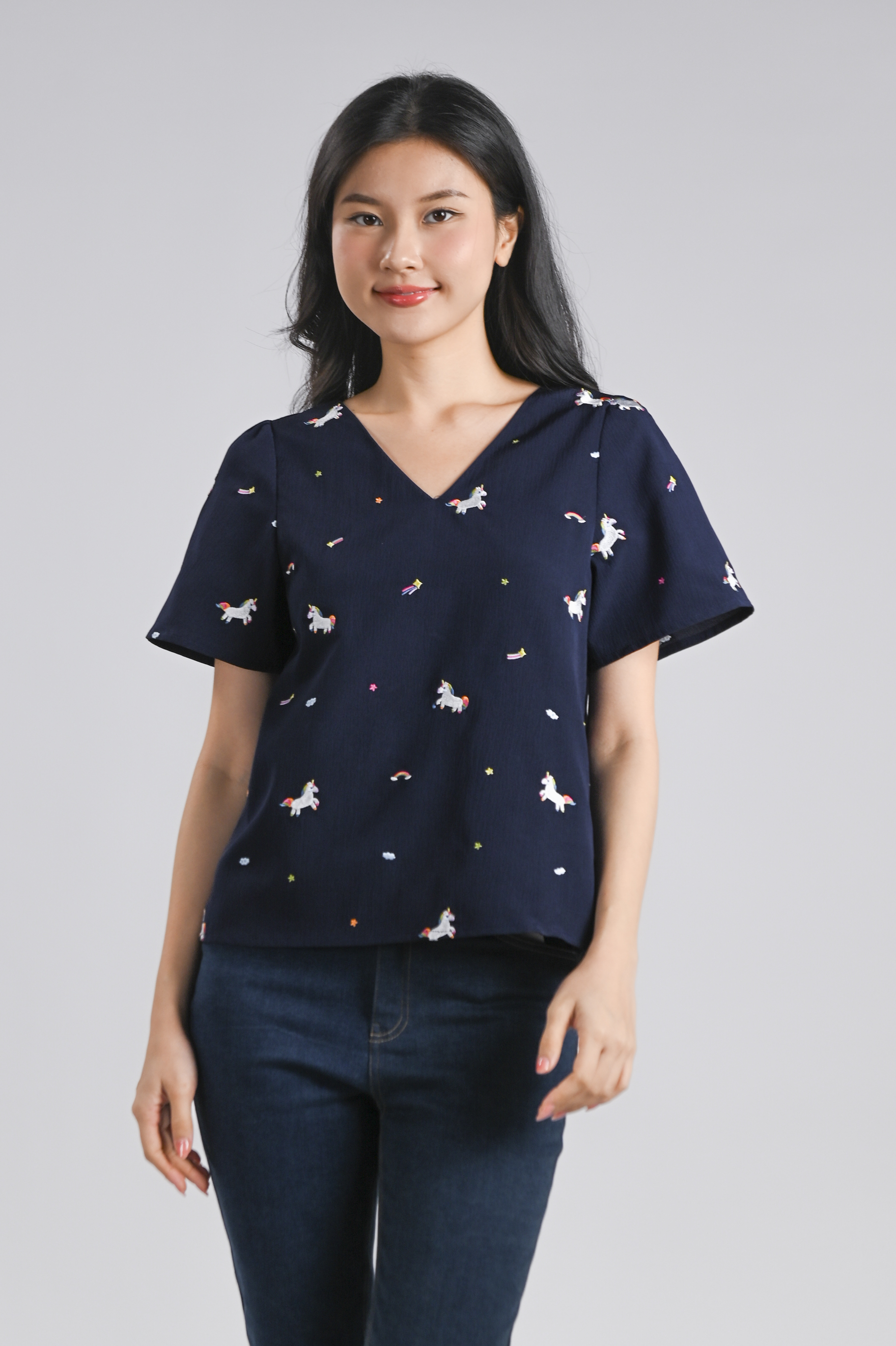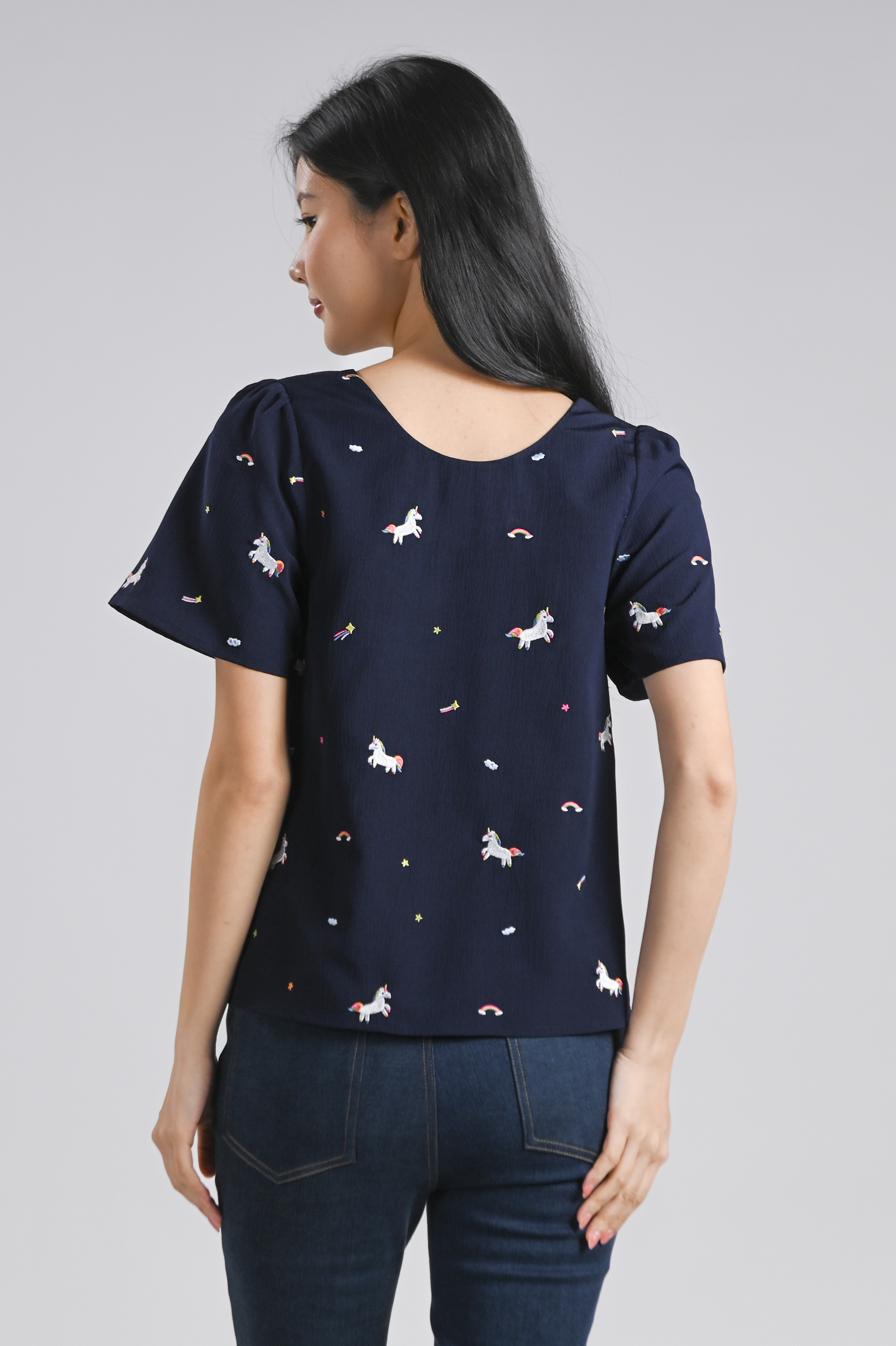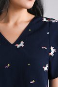 UNICORN NAVY EMB. SLEEVED TOP