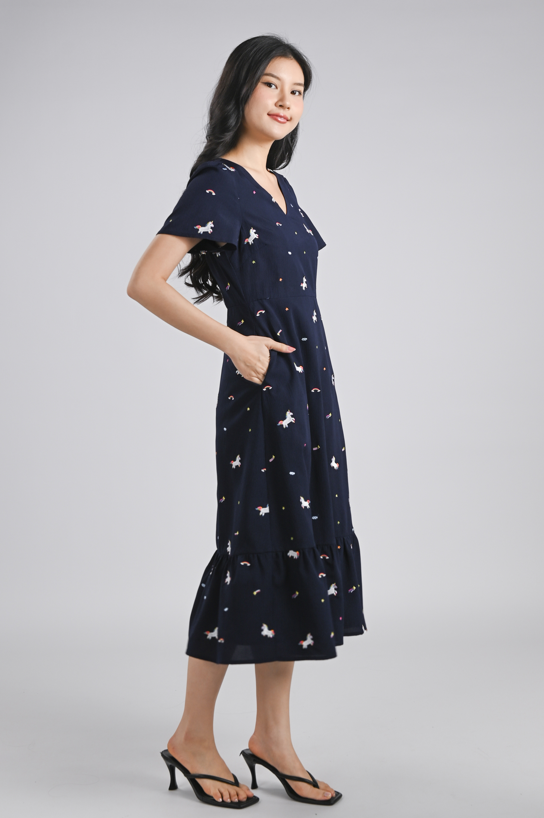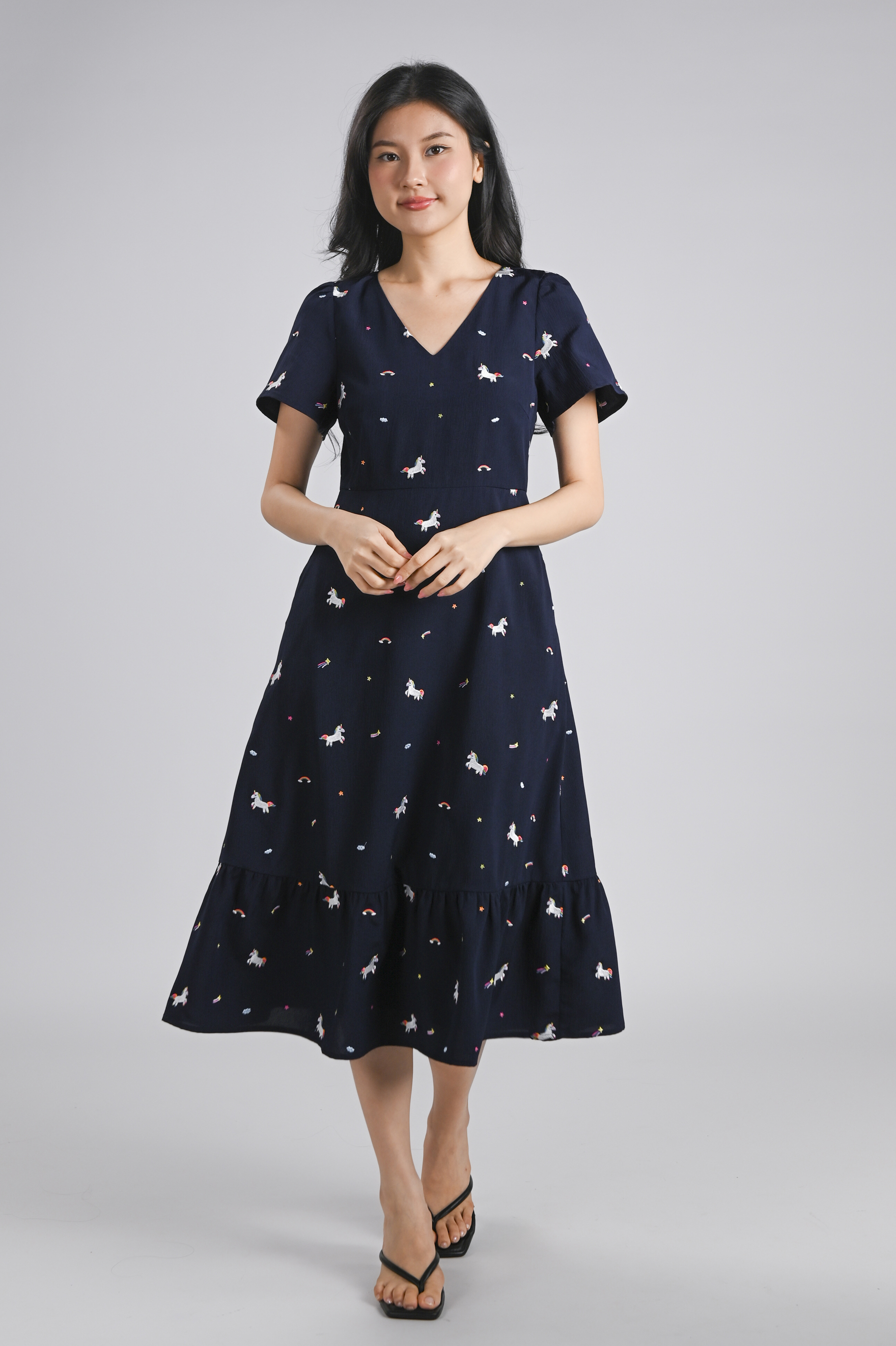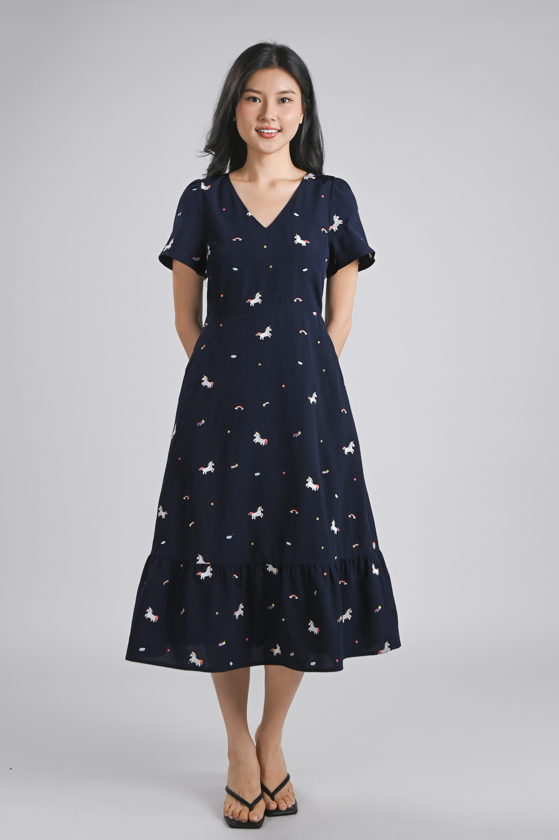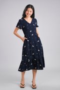 UNICORN NAVY EMB. V-NECK SLEEVED MIDI DRESS