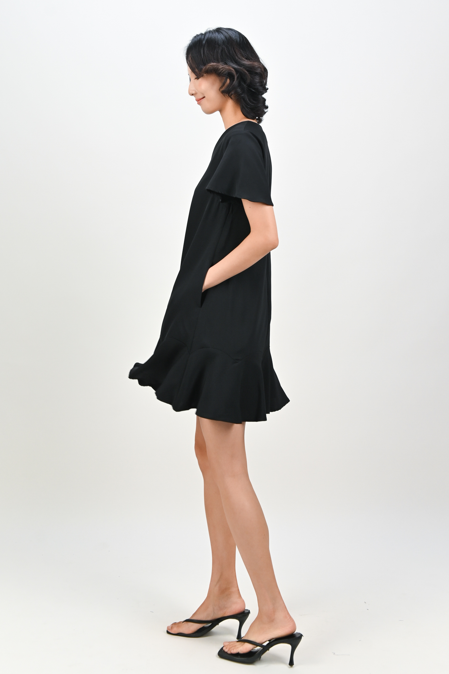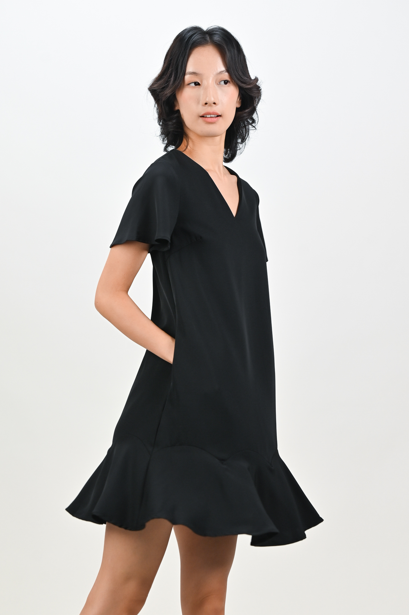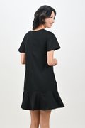 VANA SLEEVED SCALLOP-FLOUNCE DRESS IN BLACK
