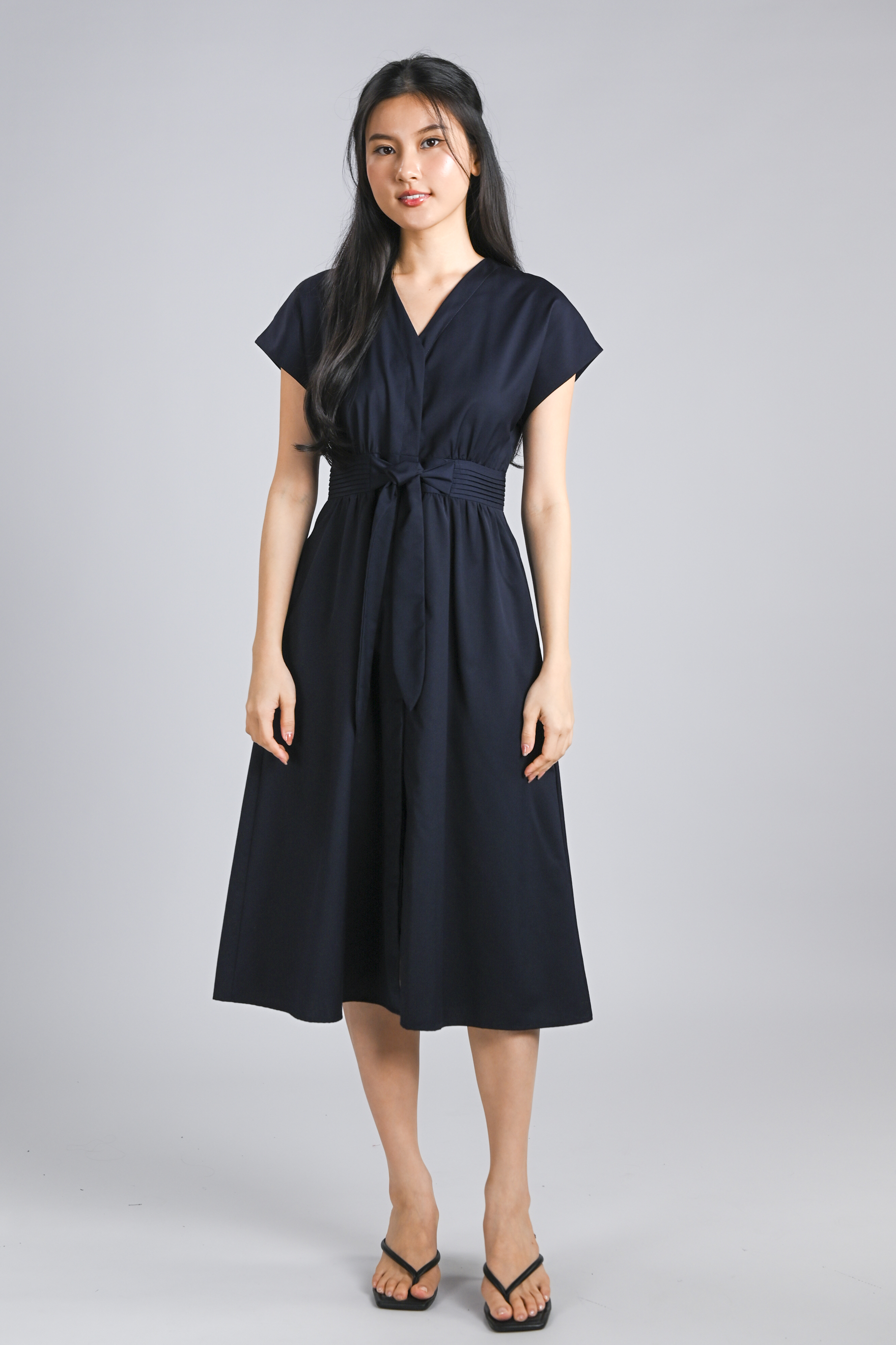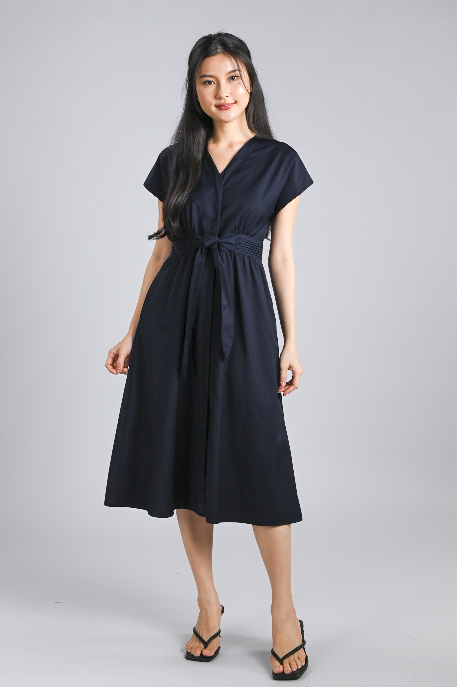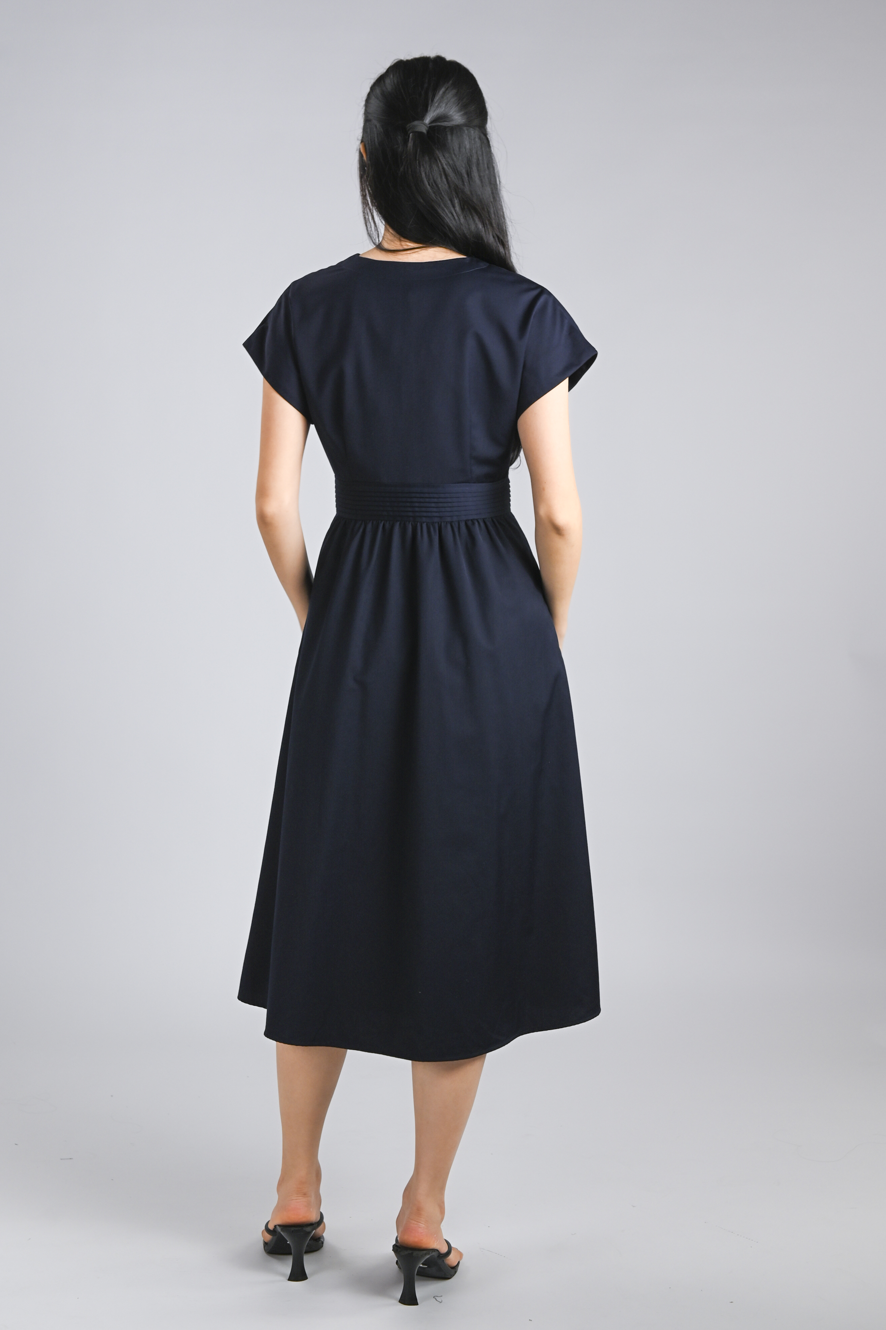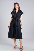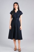 VERLIS PINTUCK-WAIST SLEEVED MIDI DRESS IN NAVY