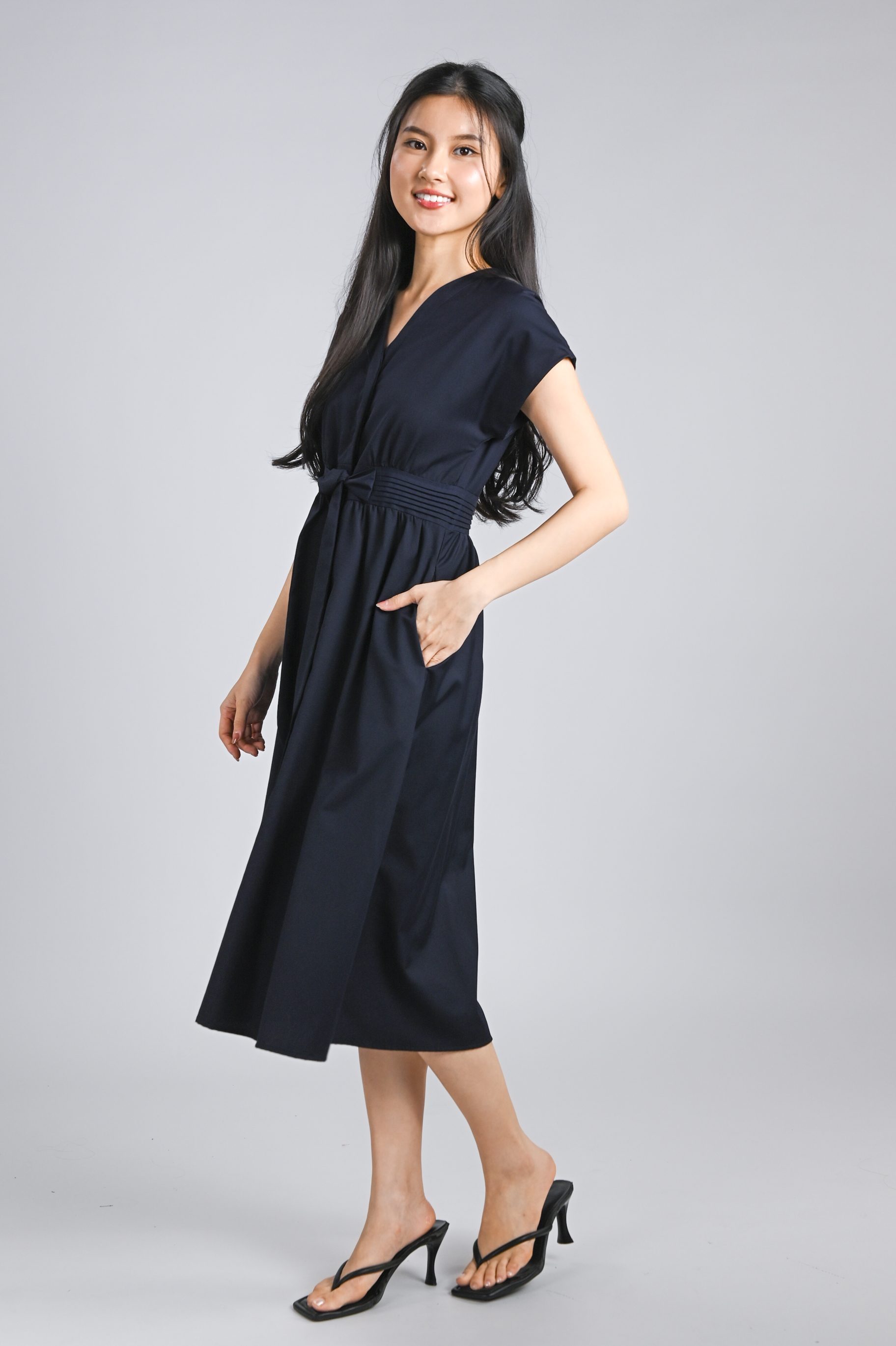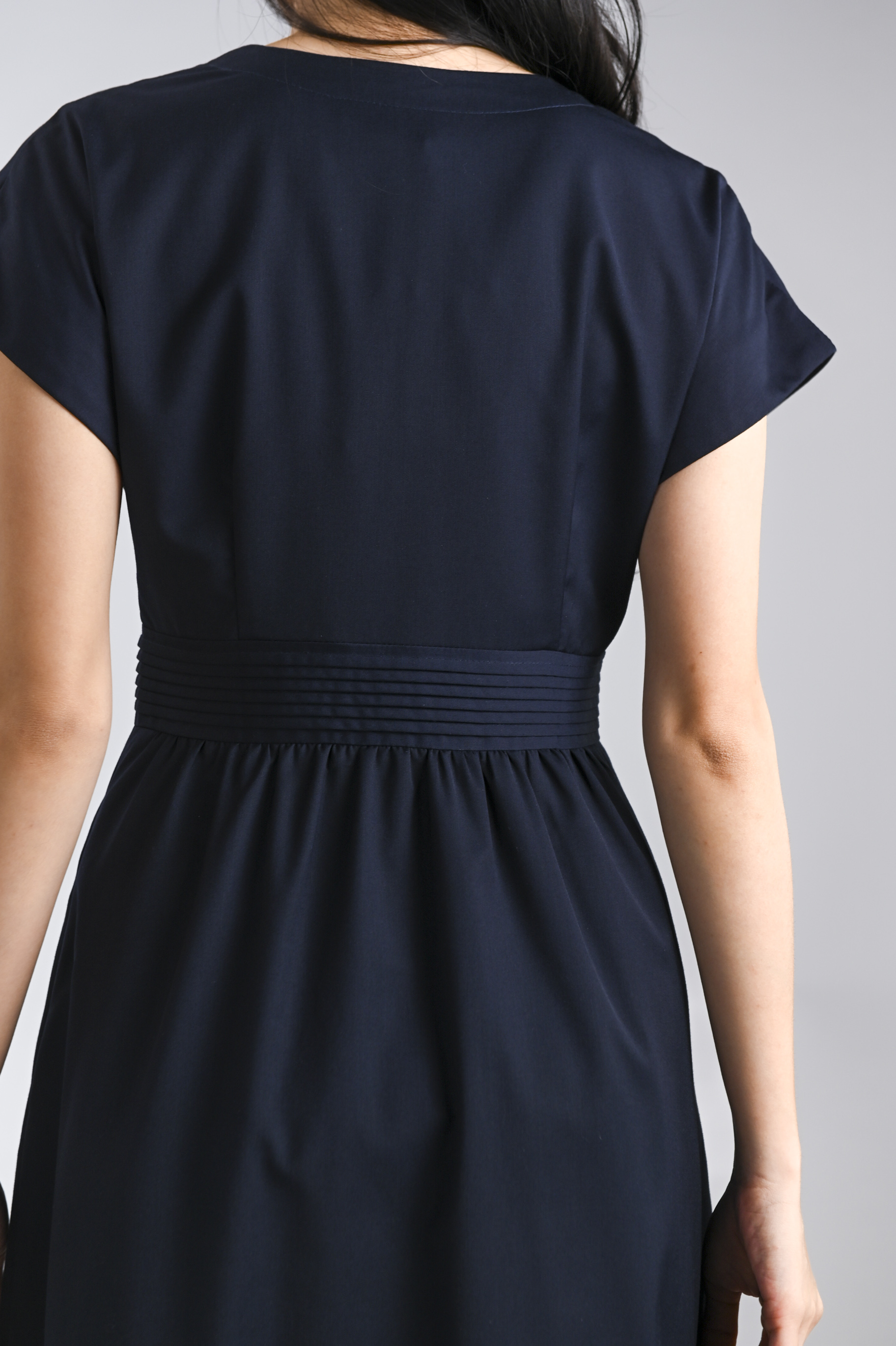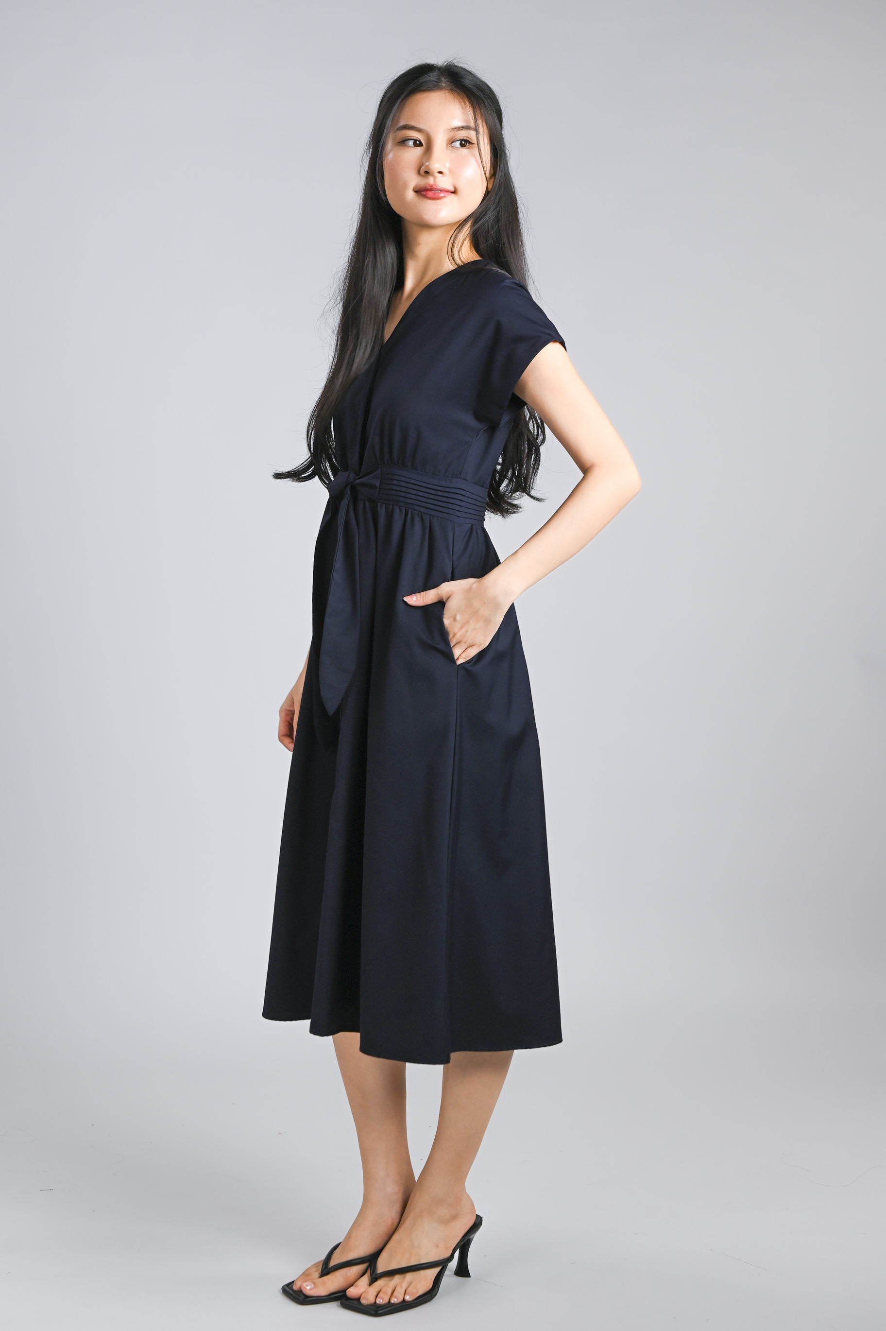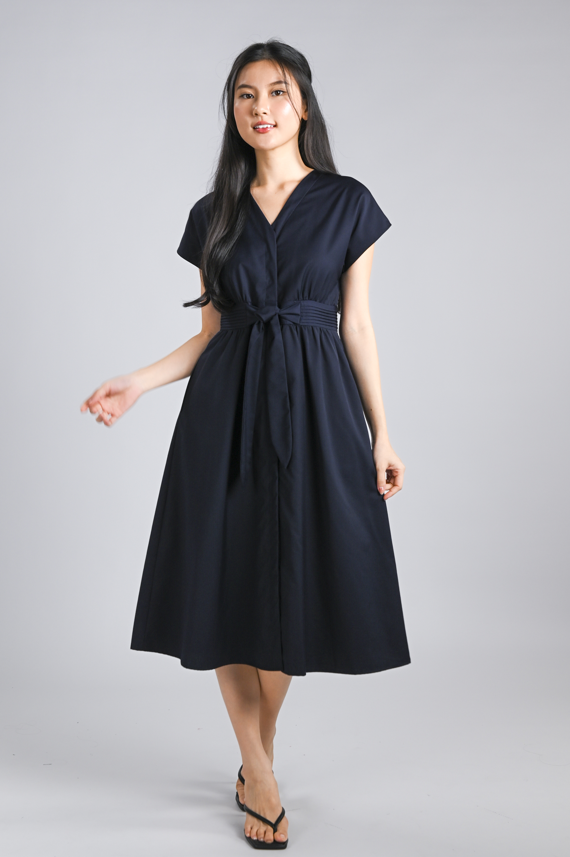 VERLIS PINTUCK-WAIST SLEEVED MIDI DRESS IN NAVY