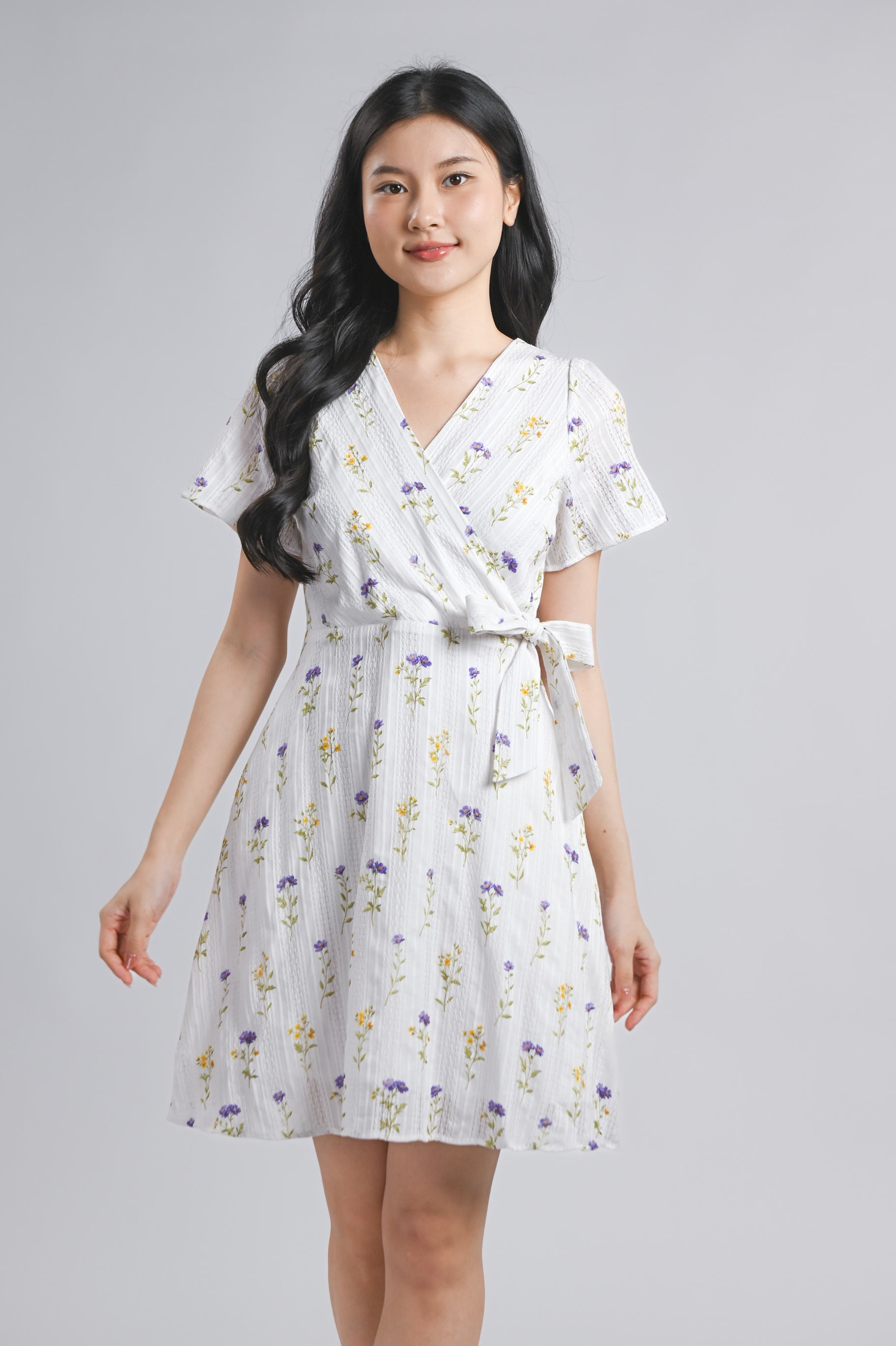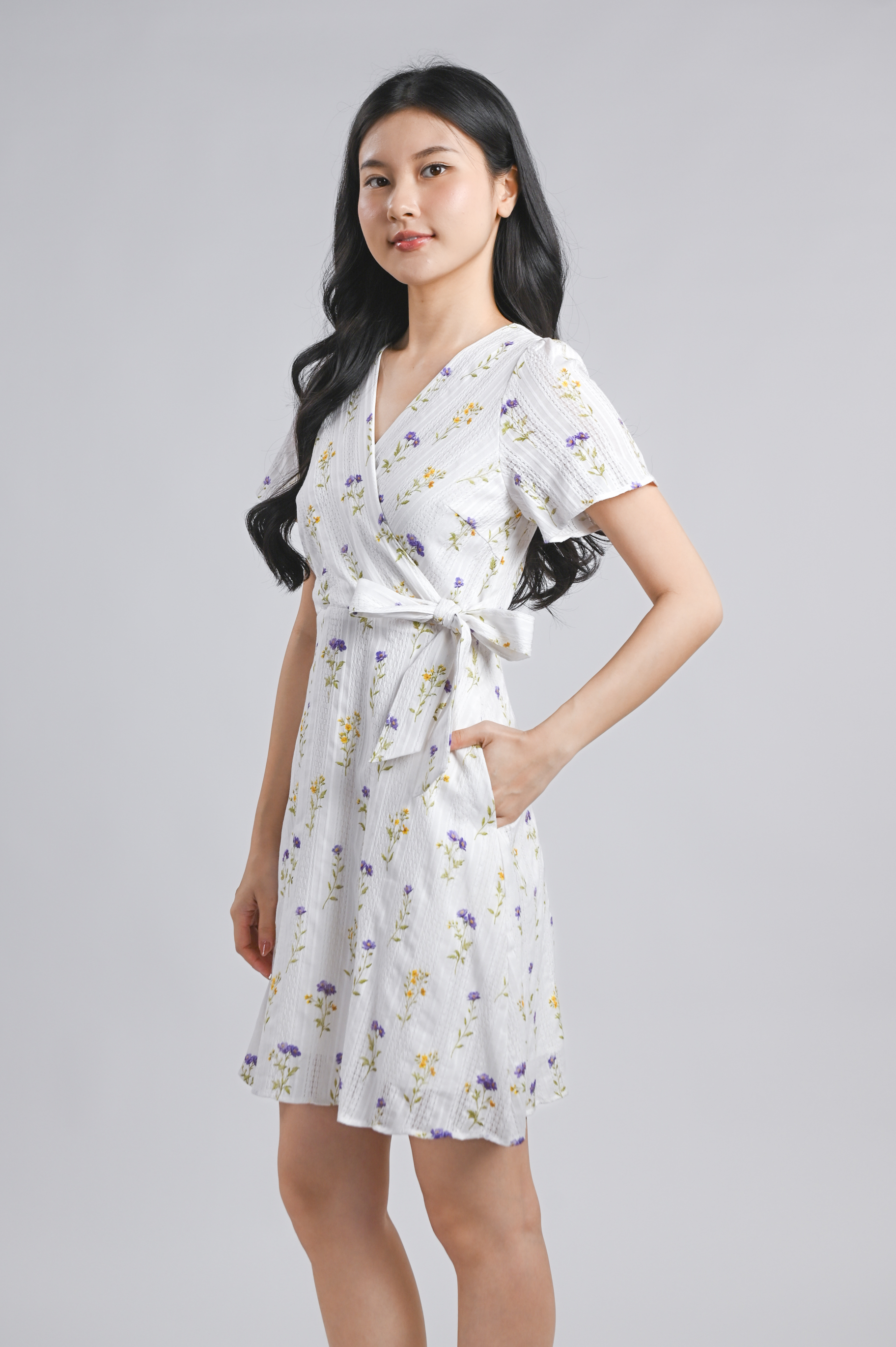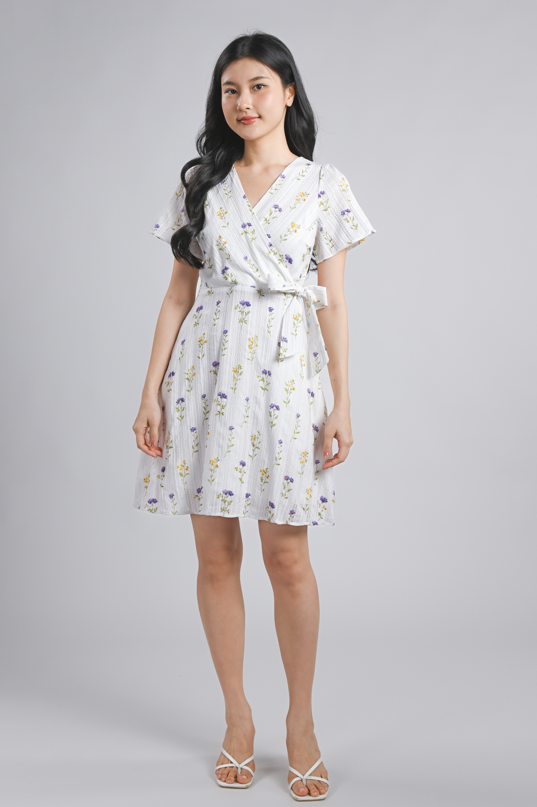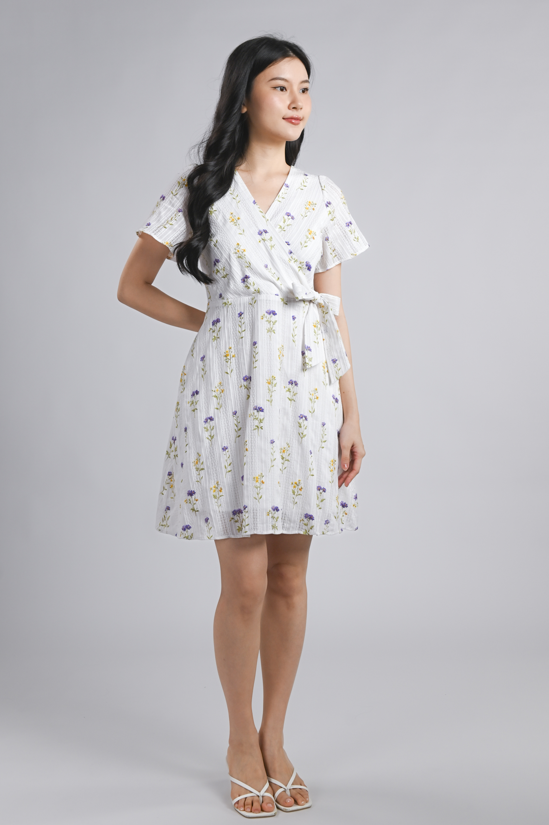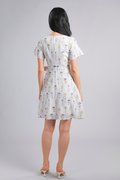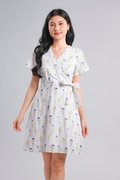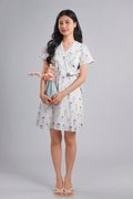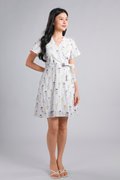 VINARA FAUX-WRAP SLEEVED DRESS IN WHITE FLORAL