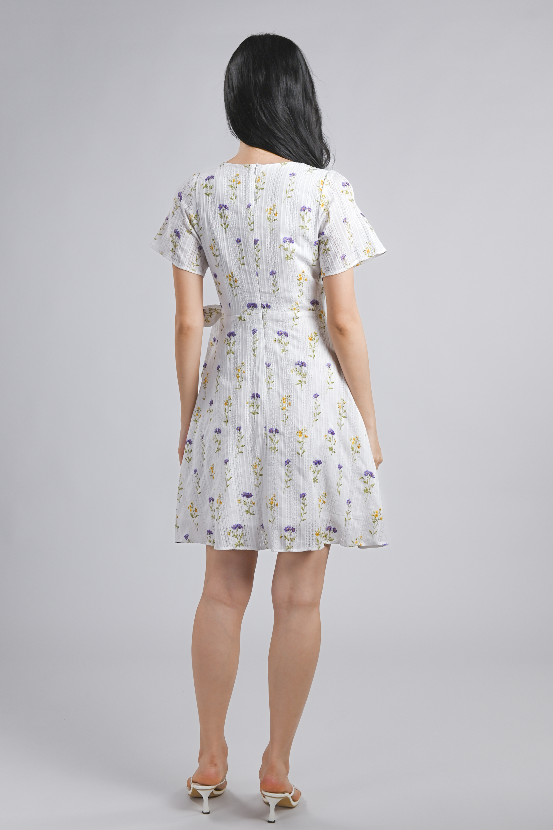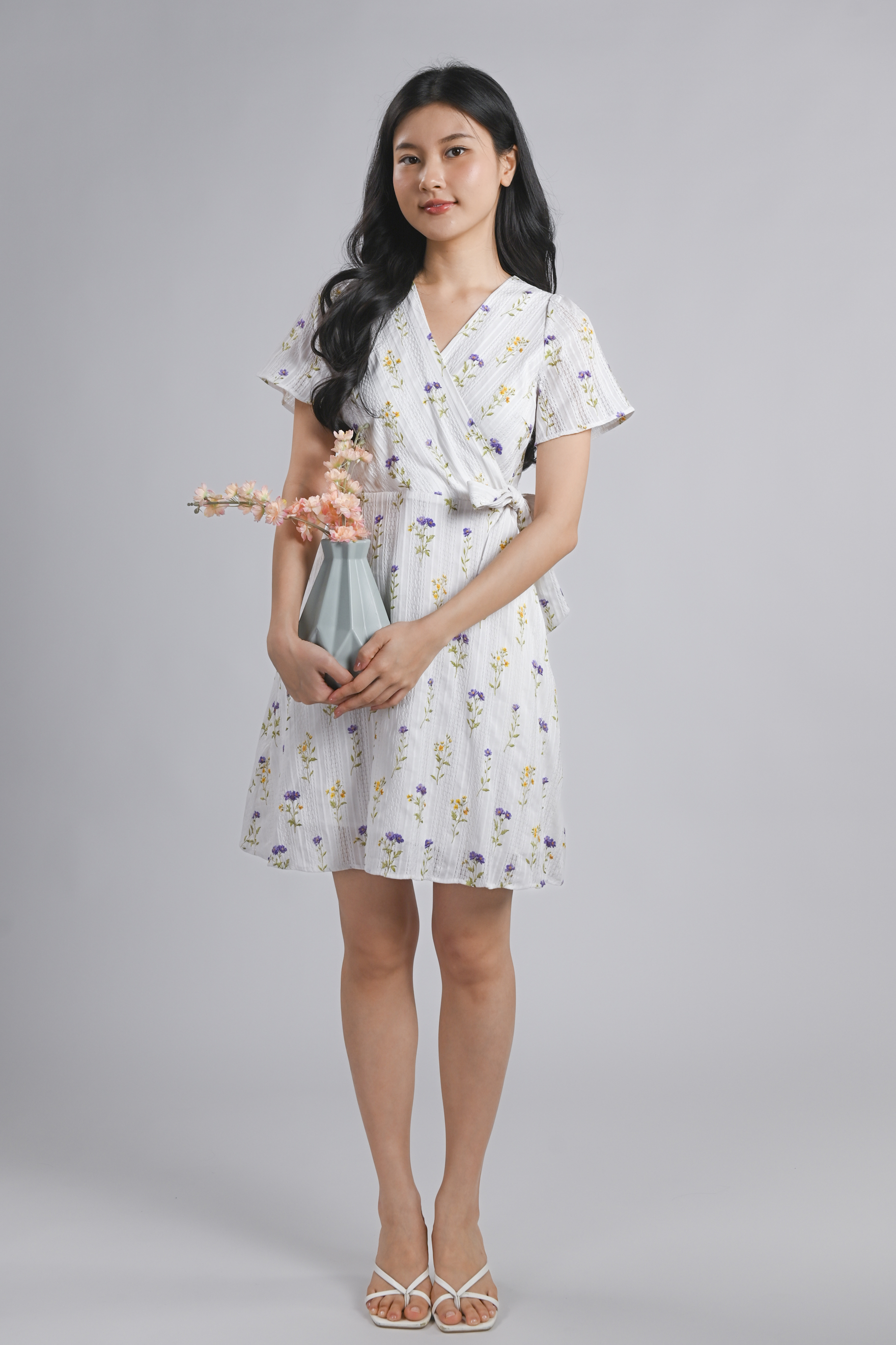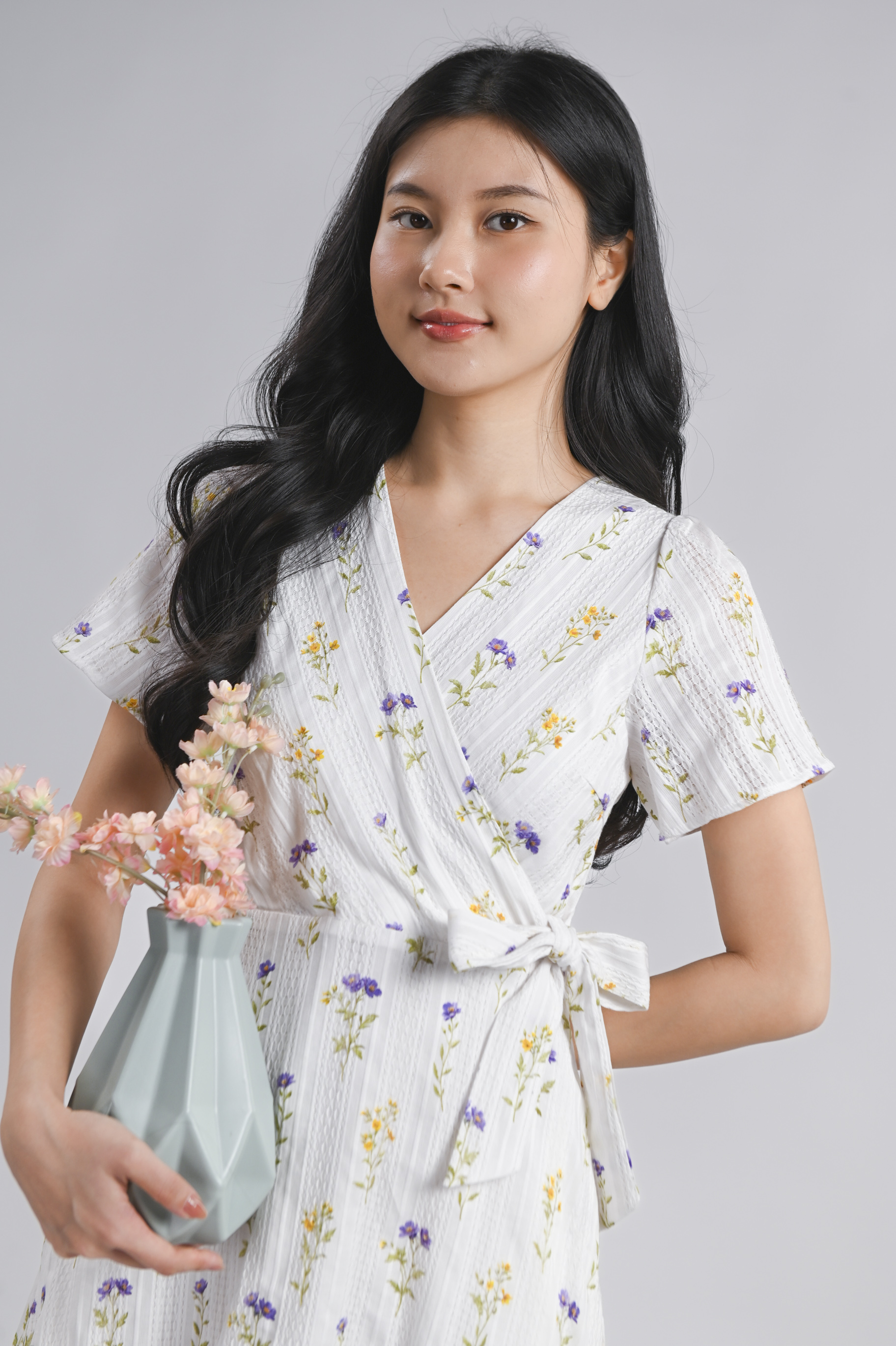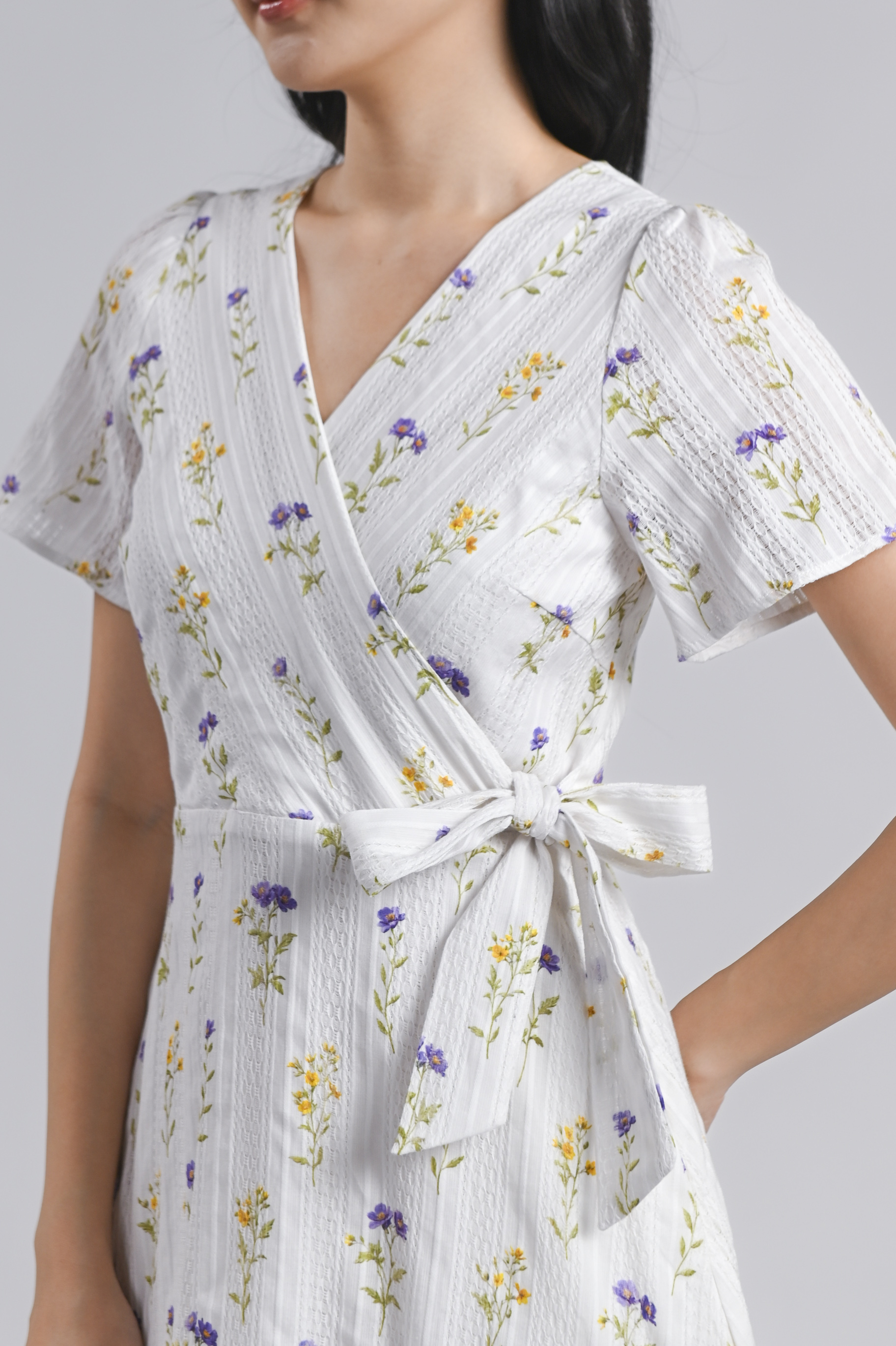 - Faux-wrap design with attached sashes at waist