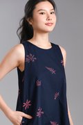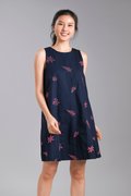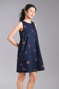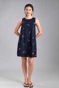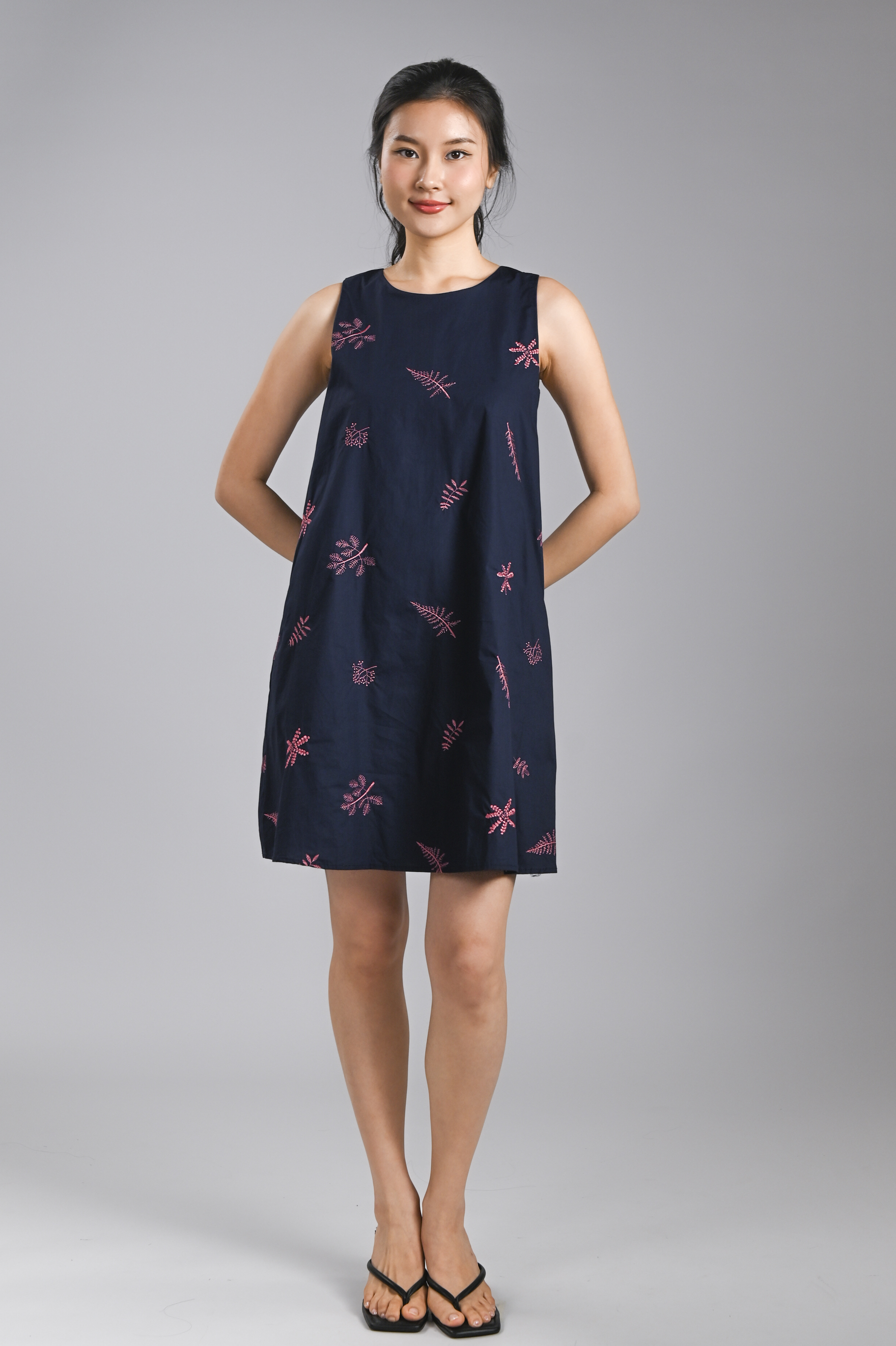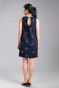 WENYAN EMB. A-LINE KEYHOLE-BACK DRESS IN NAVY