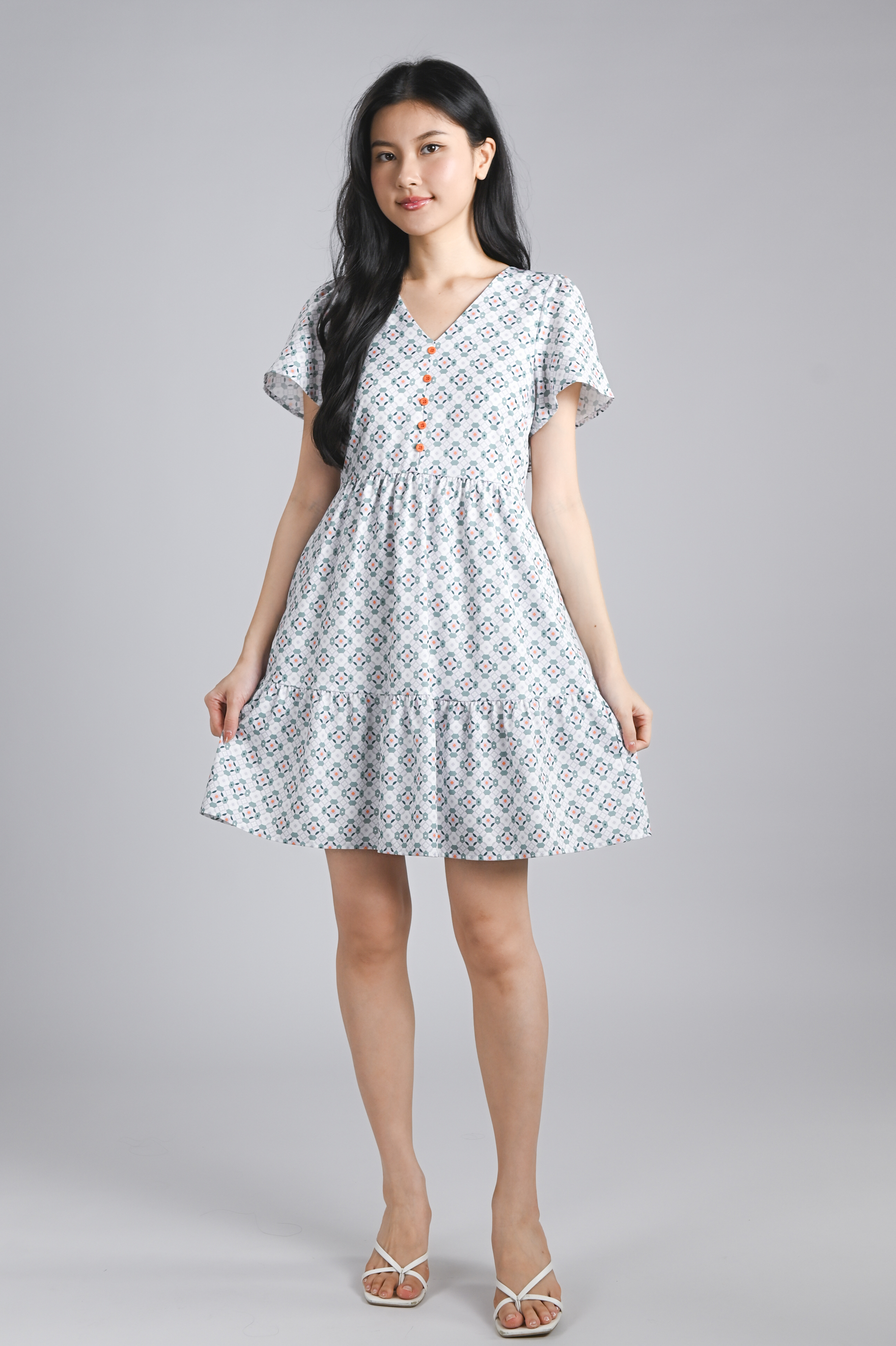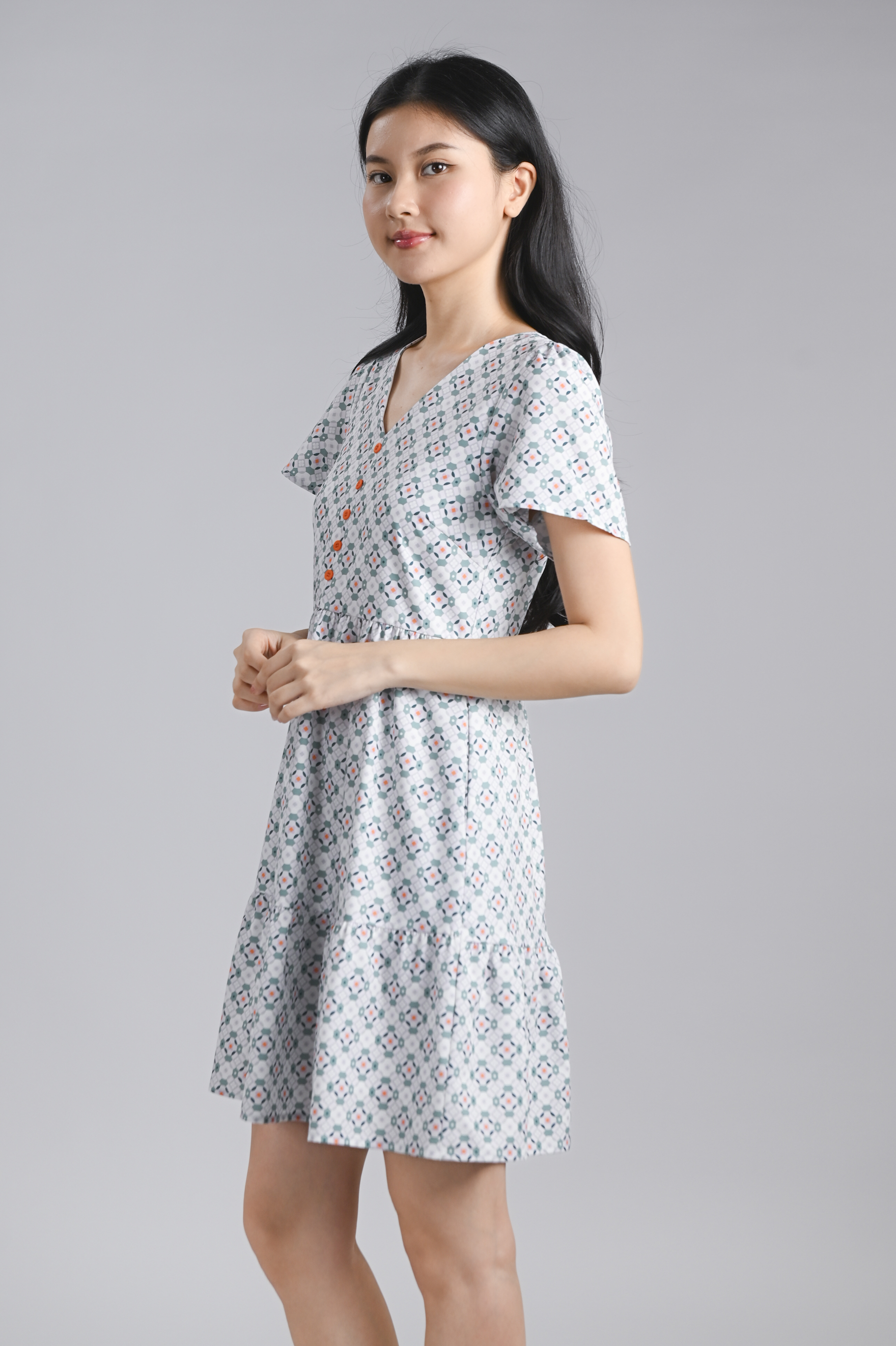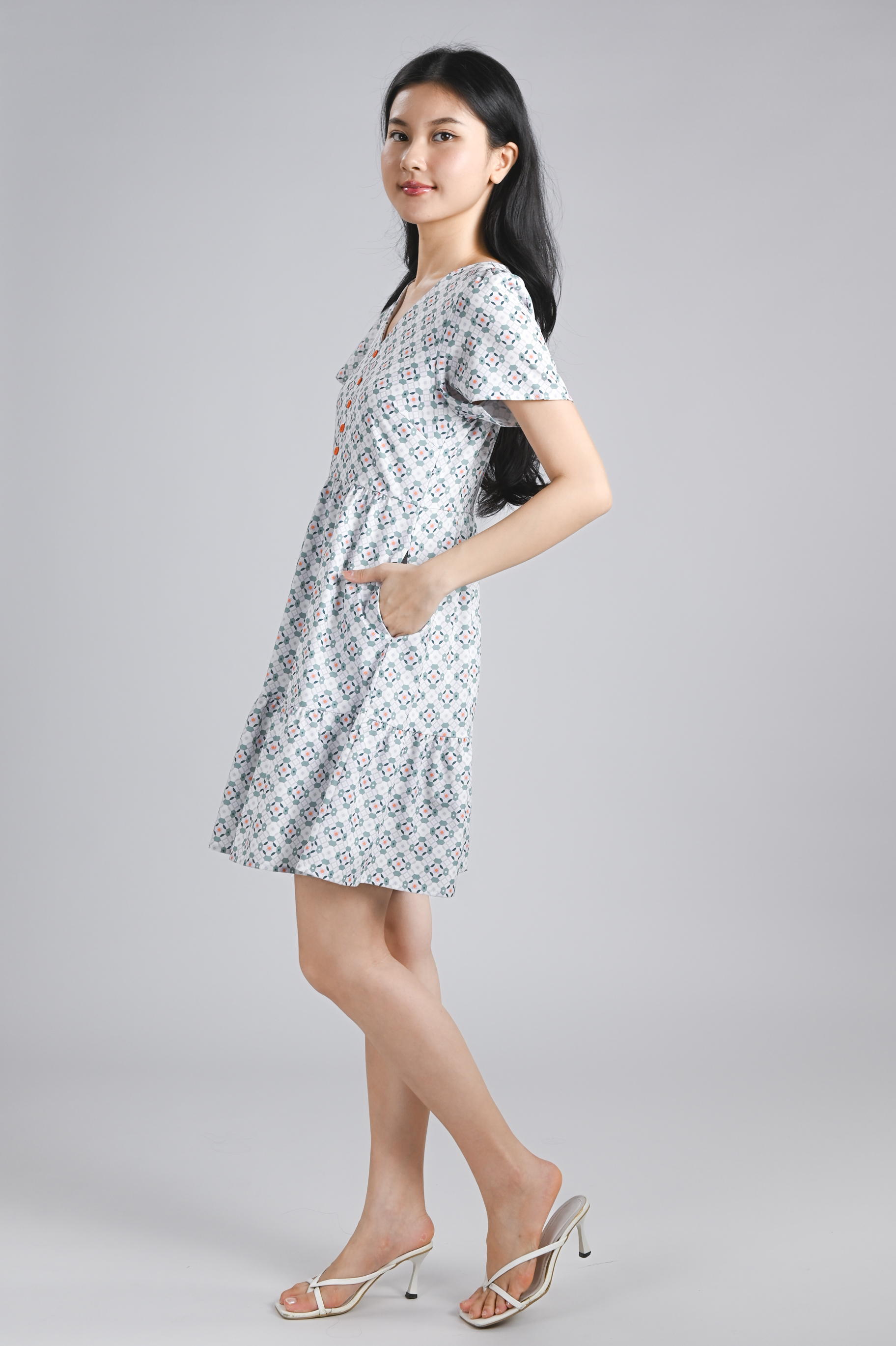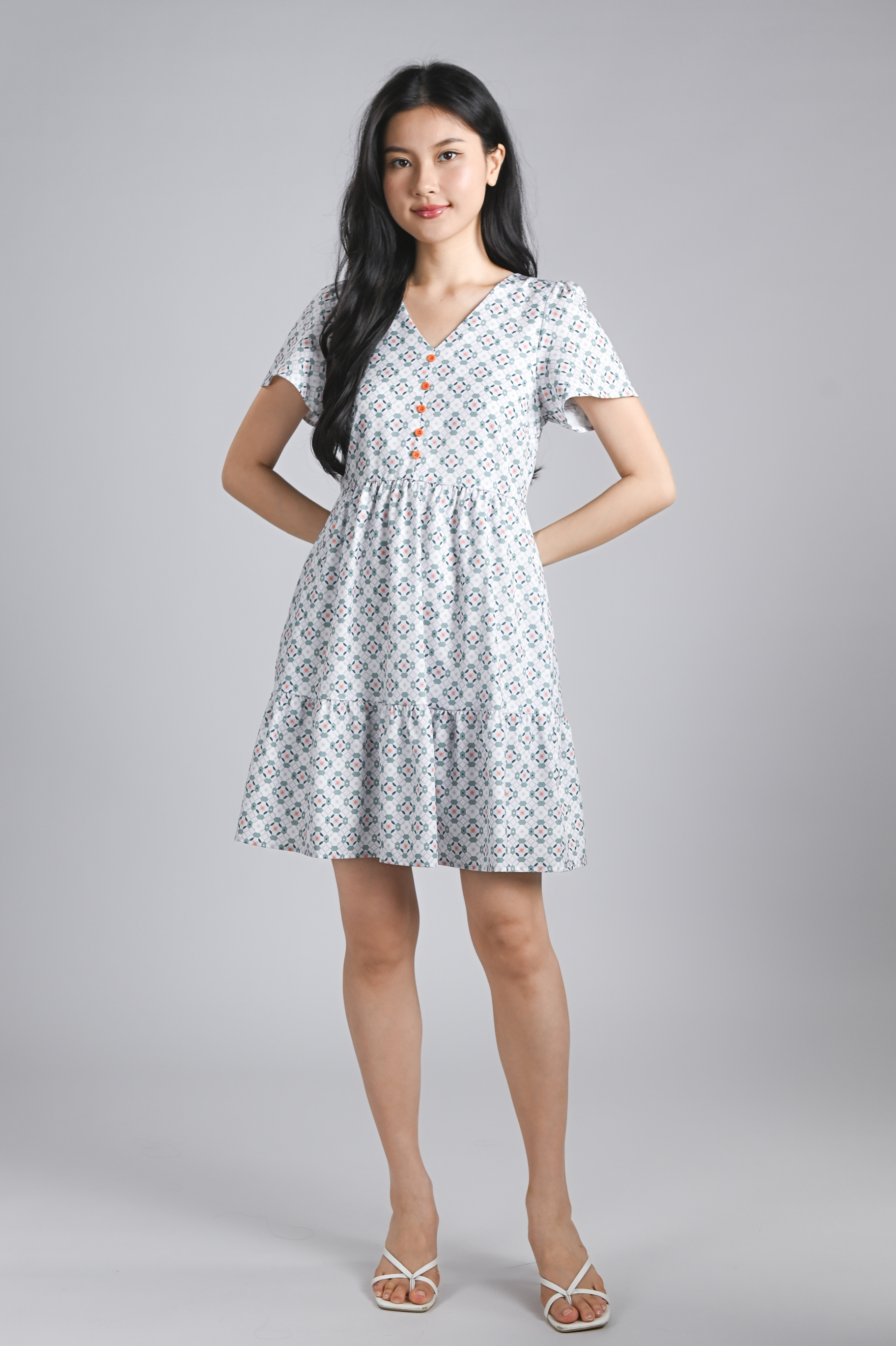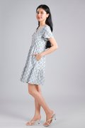 WHITE JADE SLEEVED BUTTON FLOUNCE DRESS