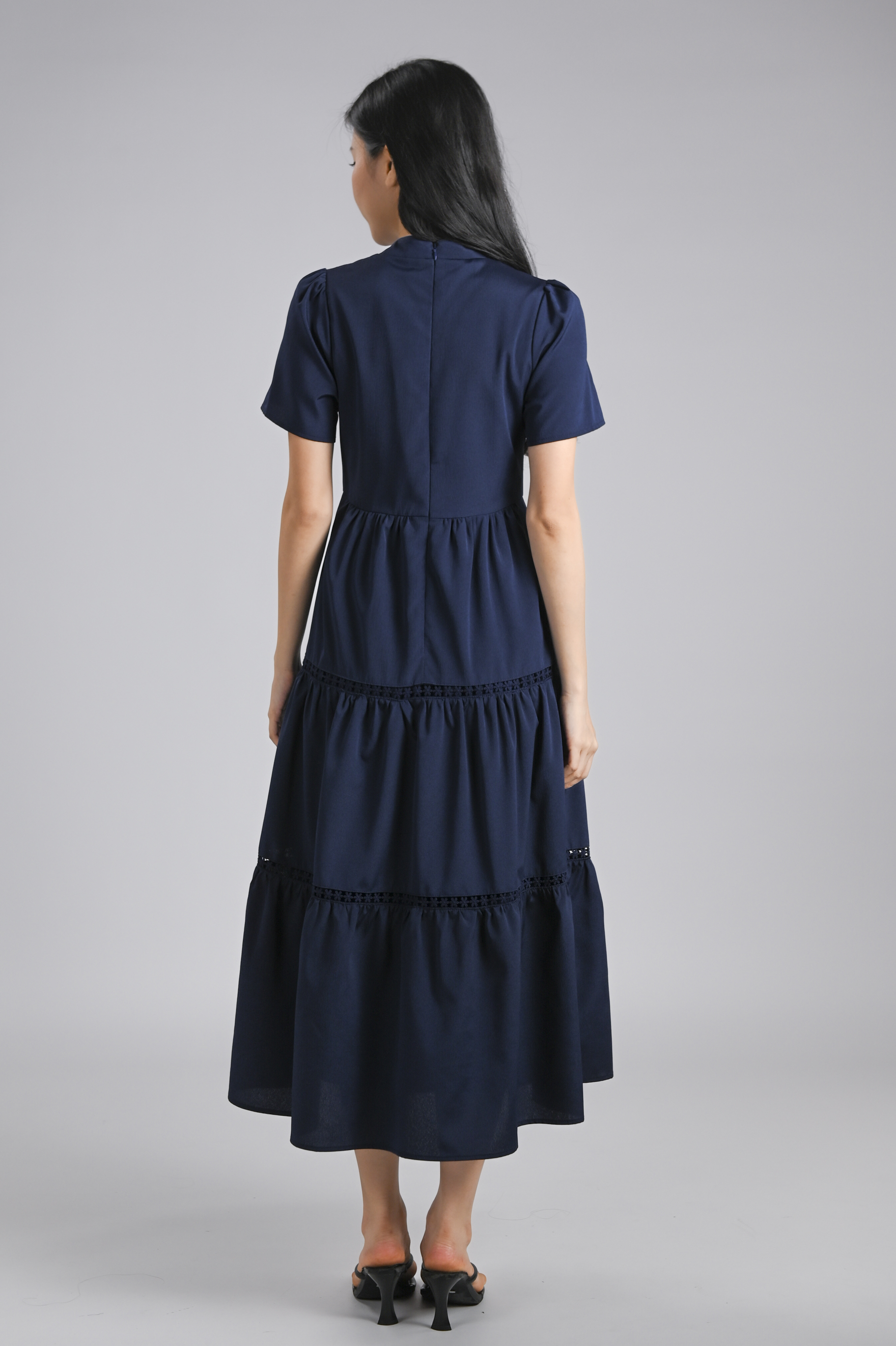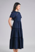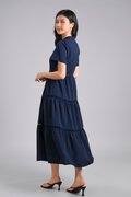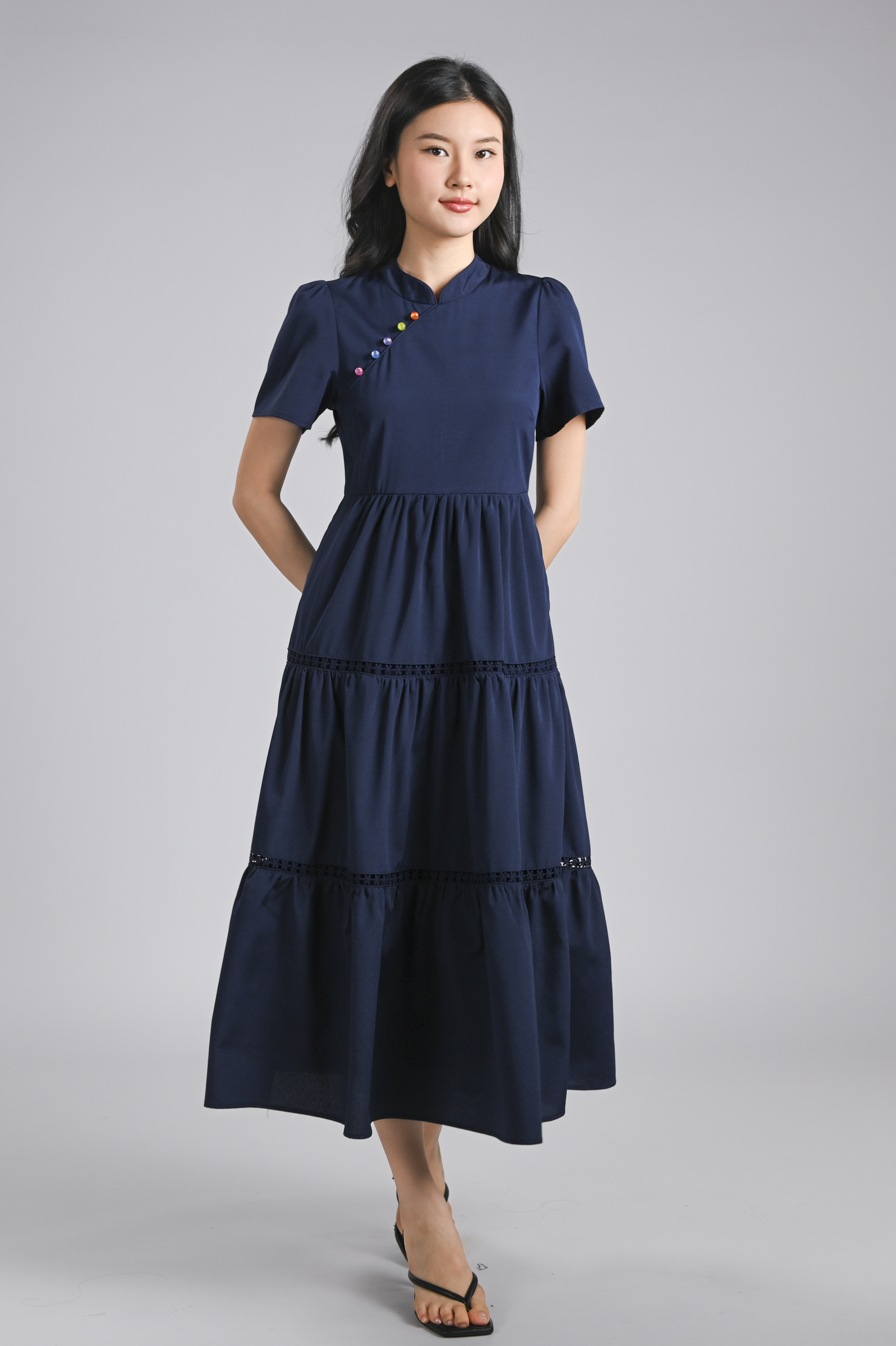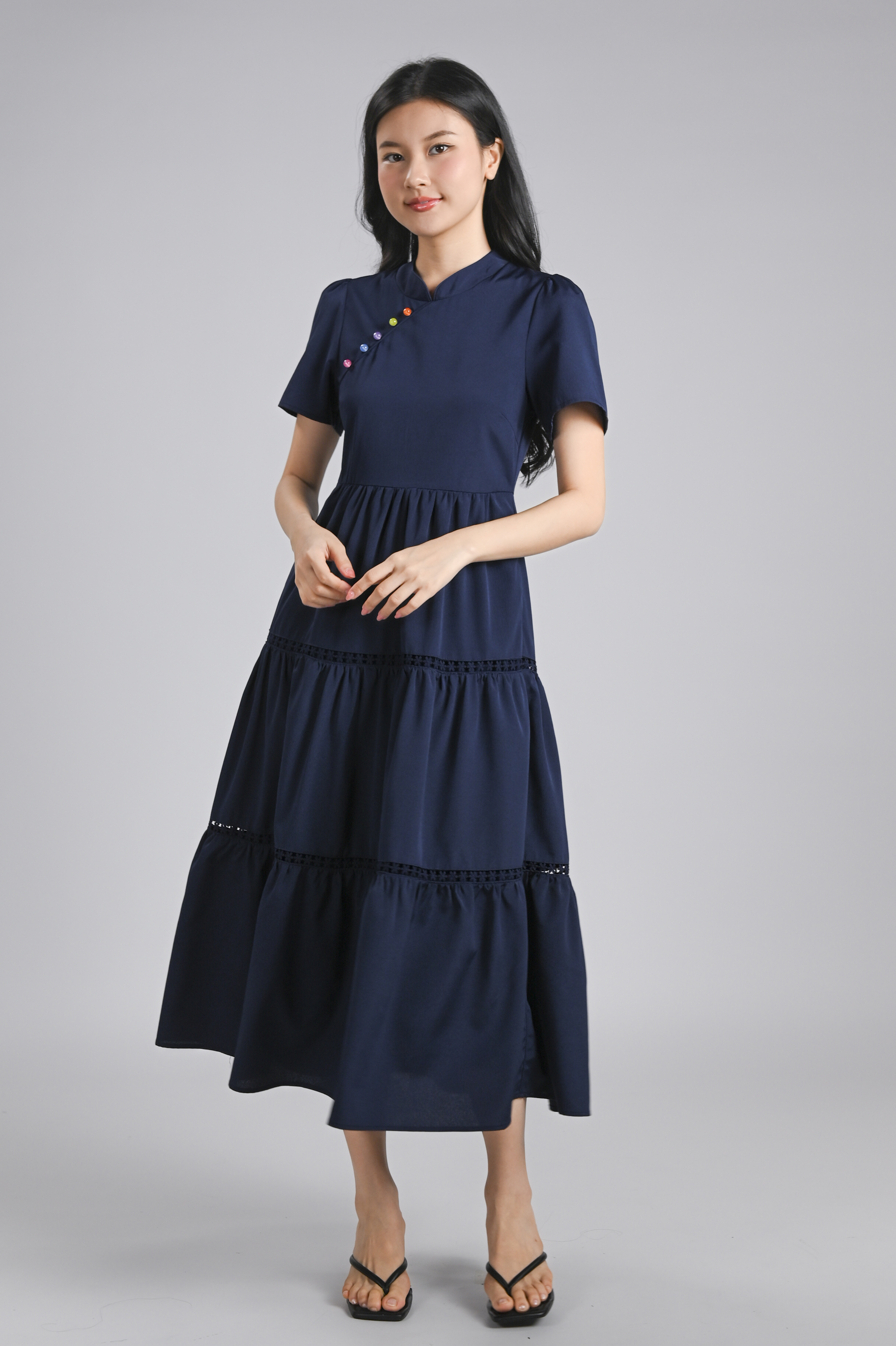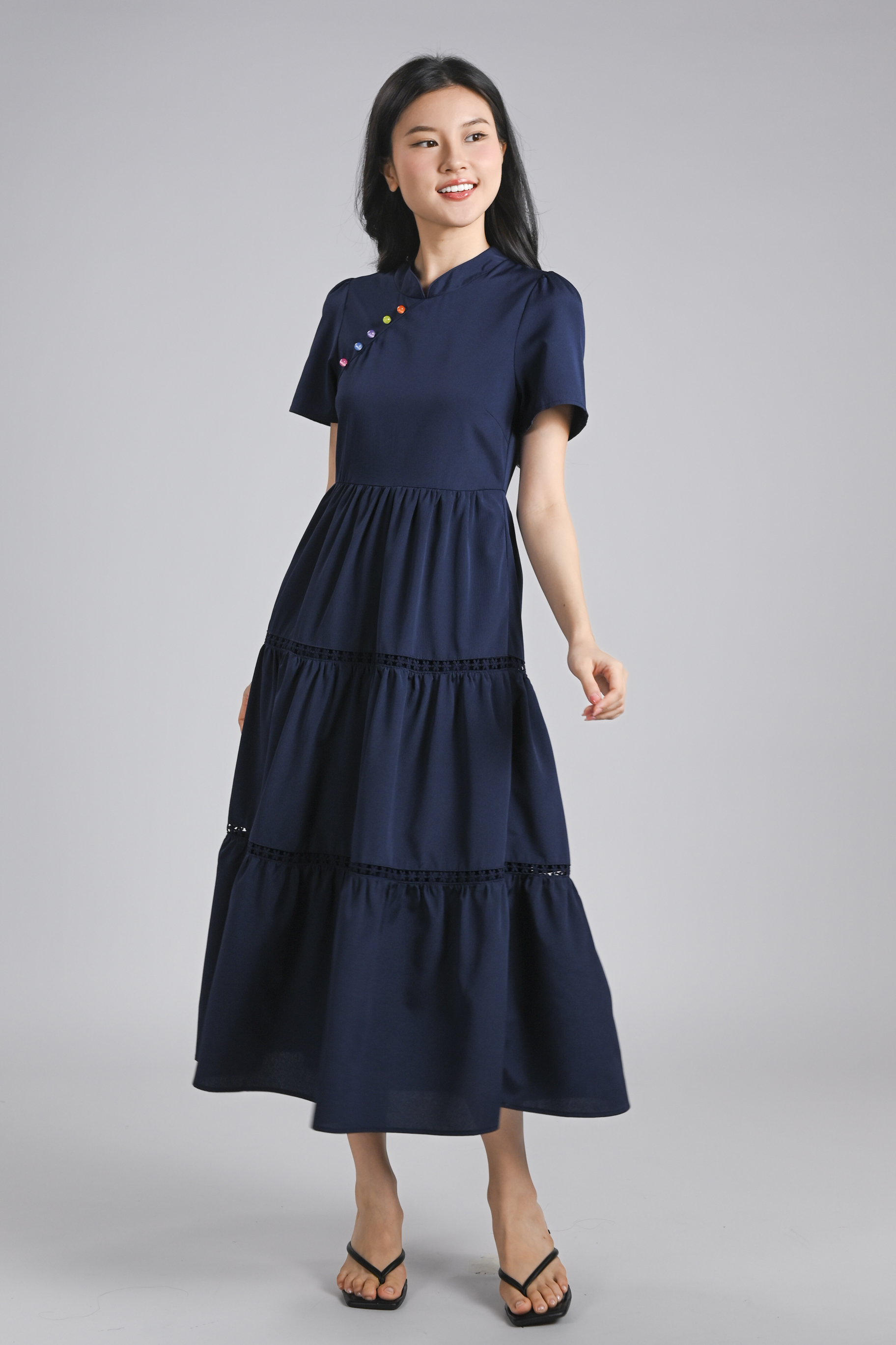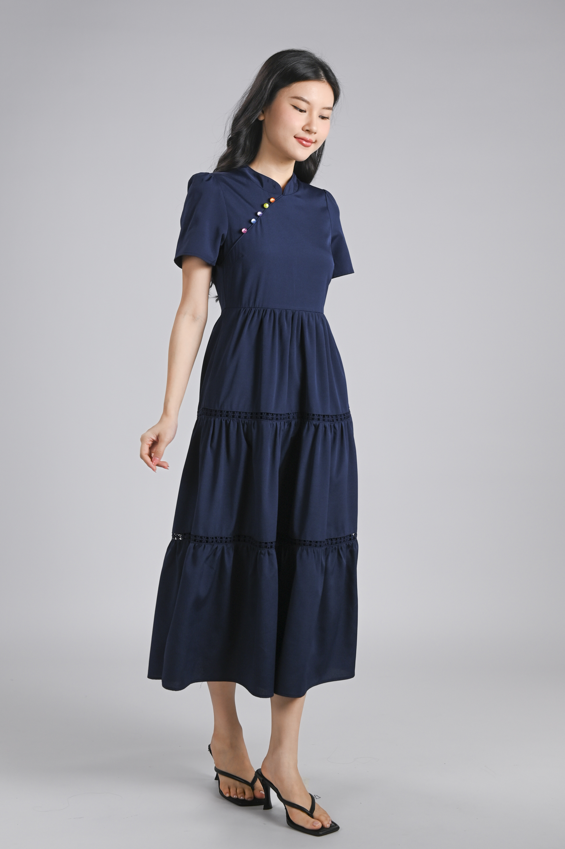 XIAOYANZI CHEONGSAM TIERED MIDAXI DRESS IN NAVY