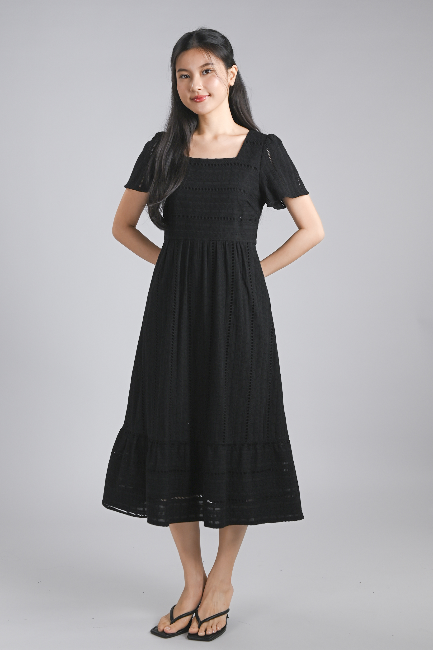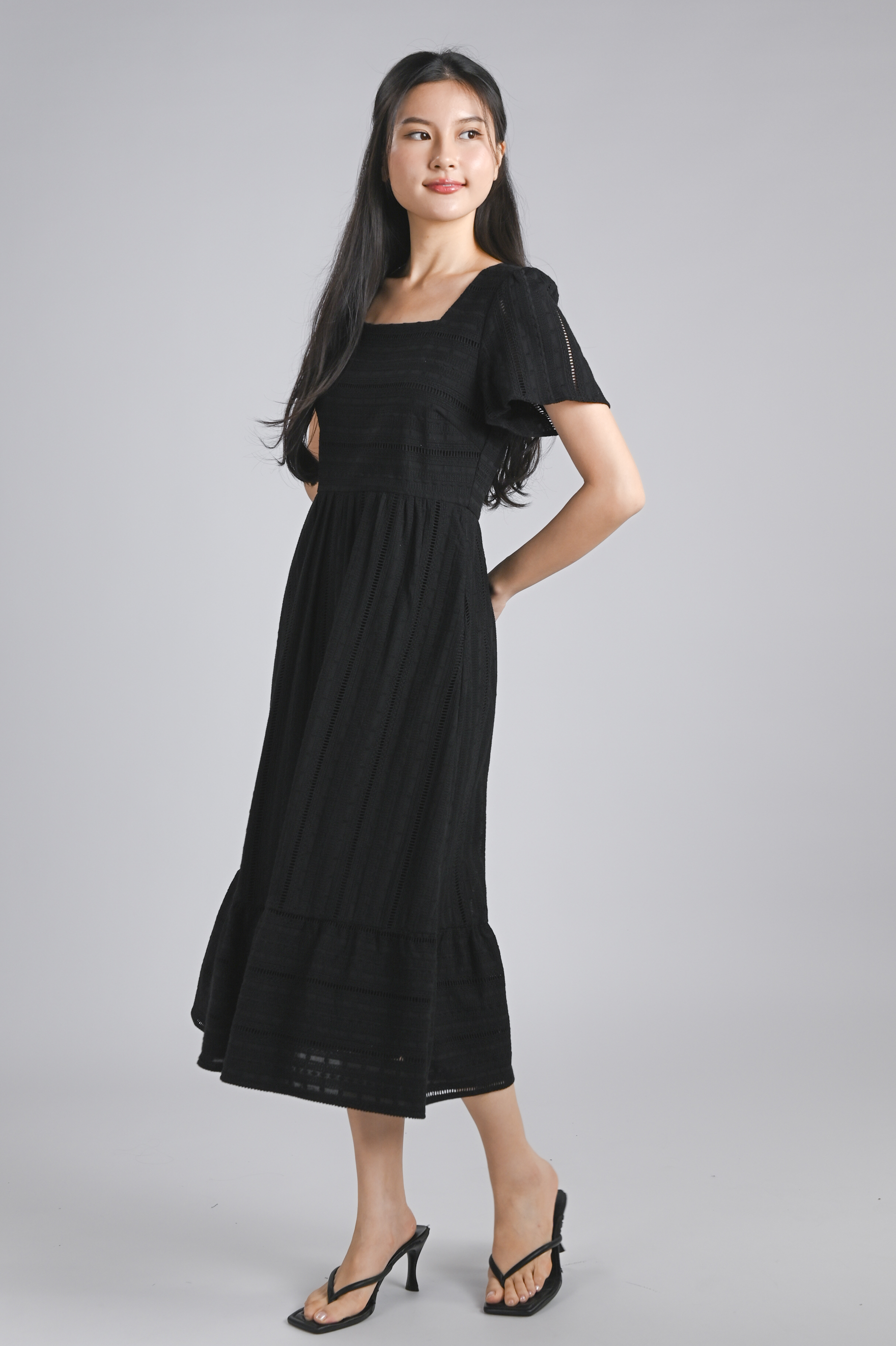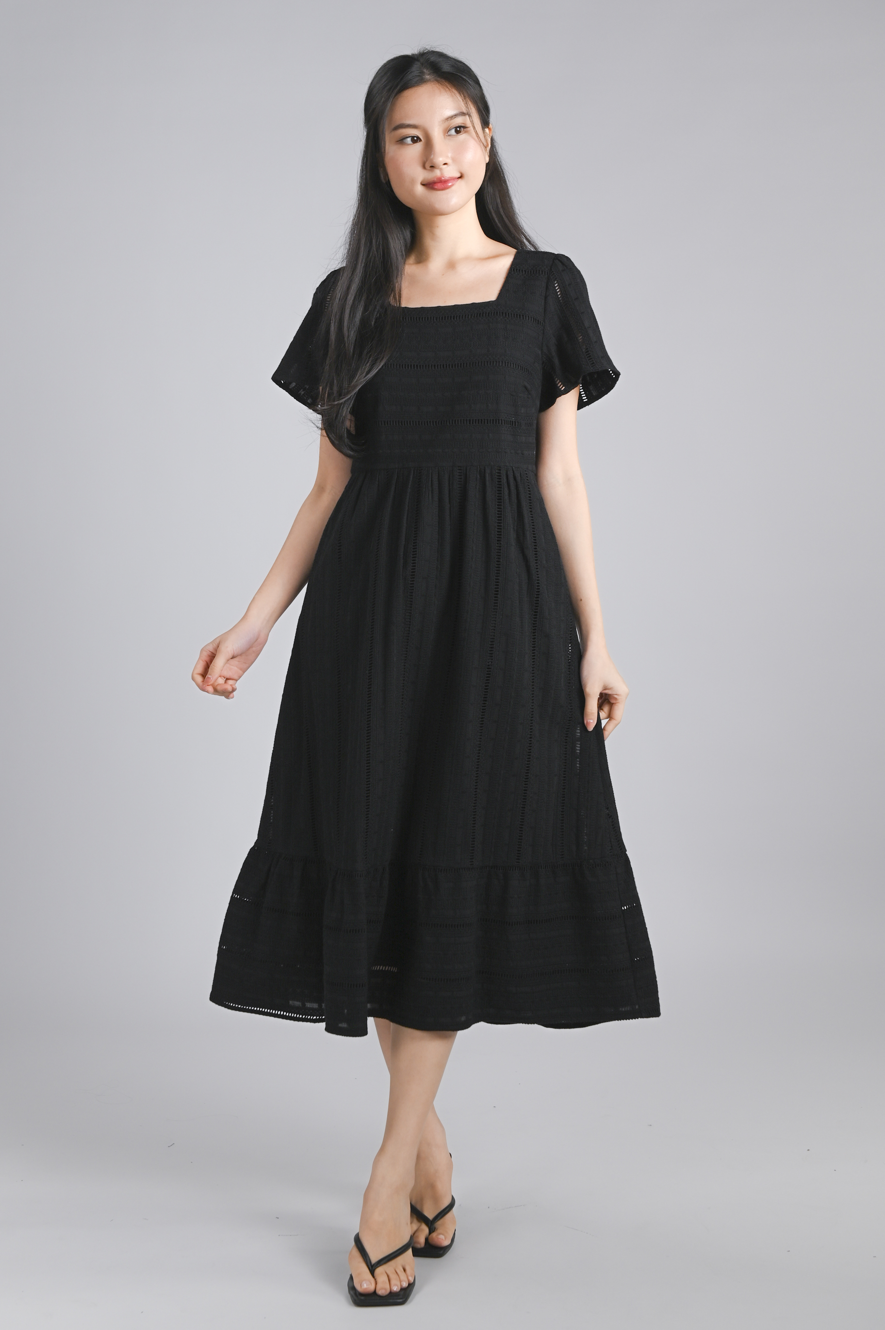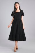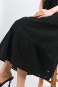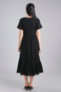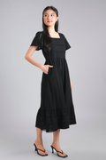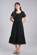 YORK EYELET SQUARE-NECK SLEEVED MIDI DRESS IN BLACK