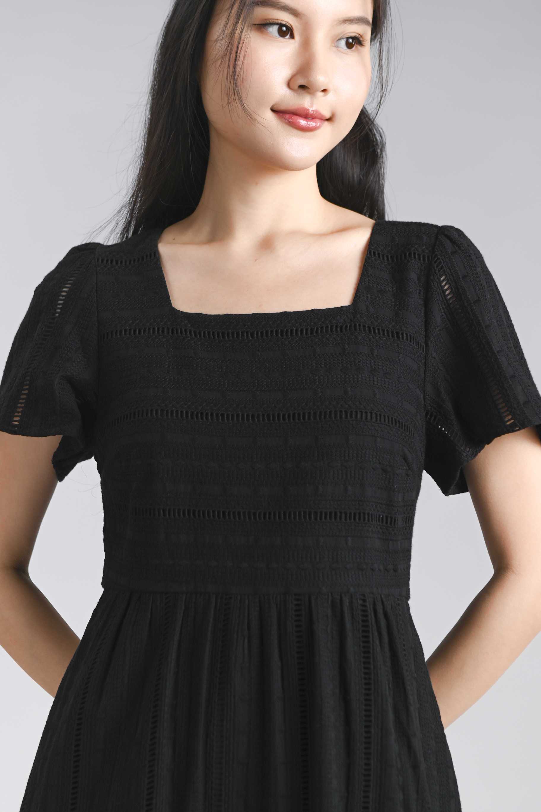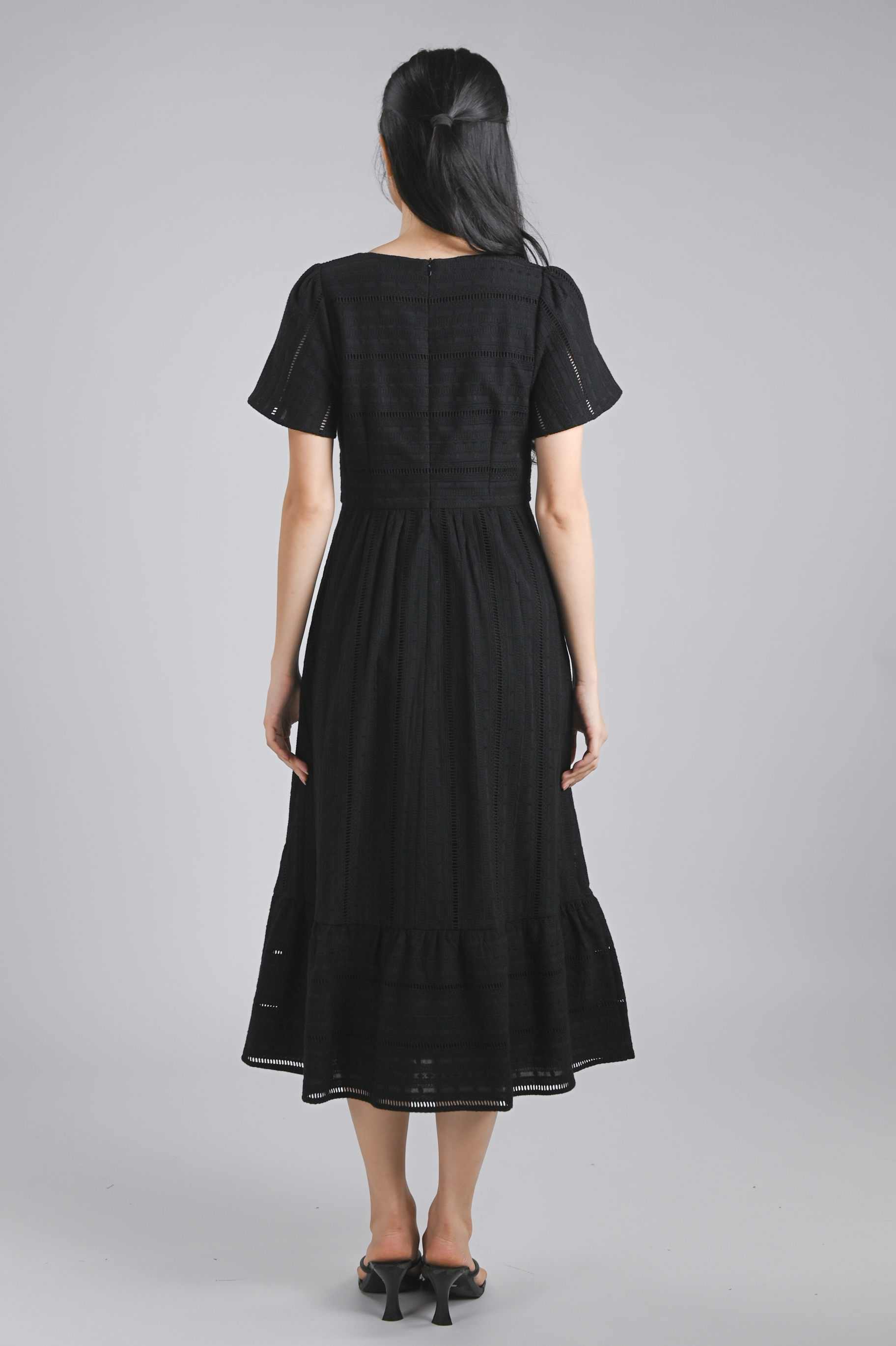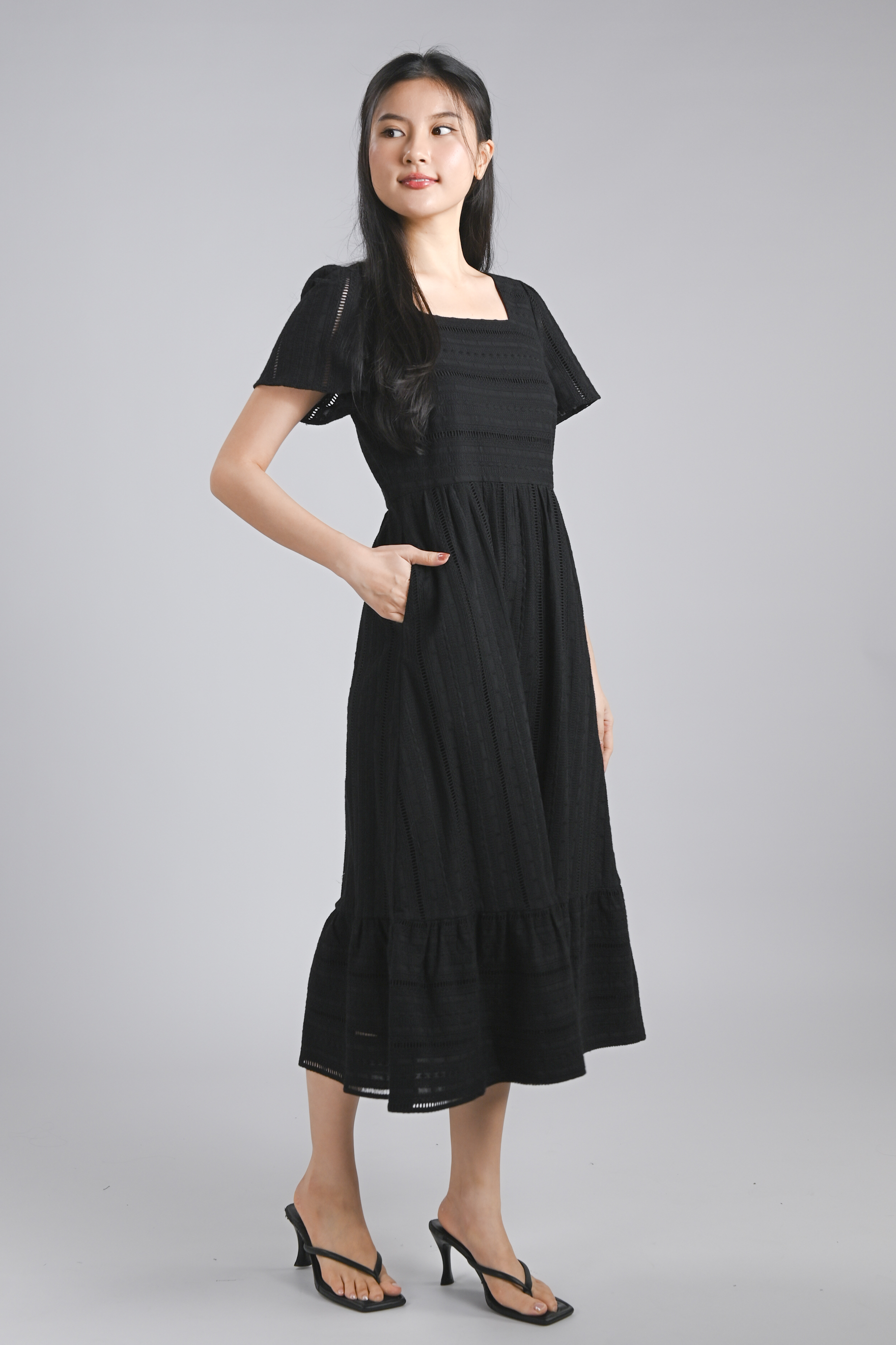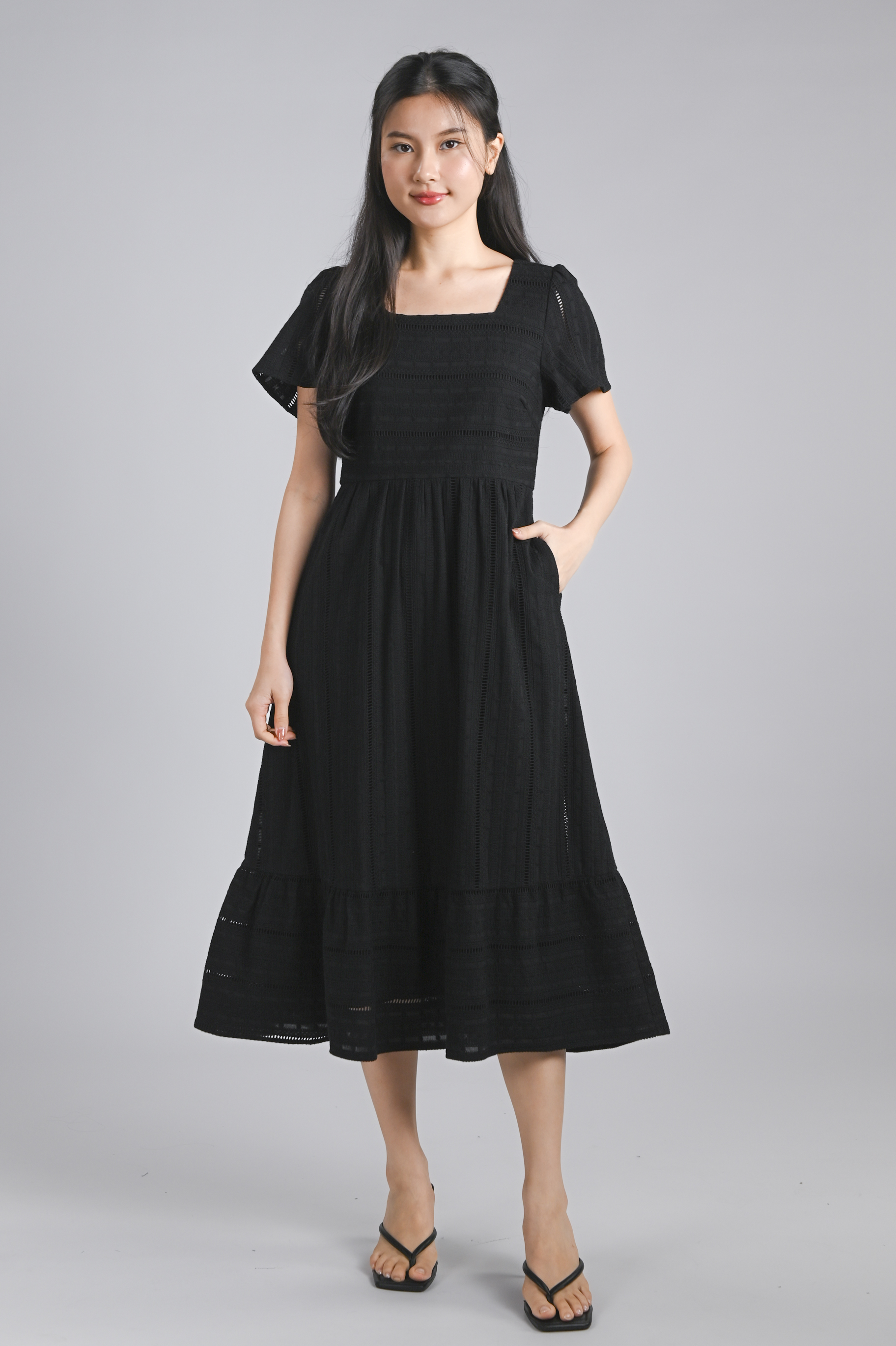 YORK EYELET SQUARE-NECK SLEEVED MIDI DRESS IN BLACK