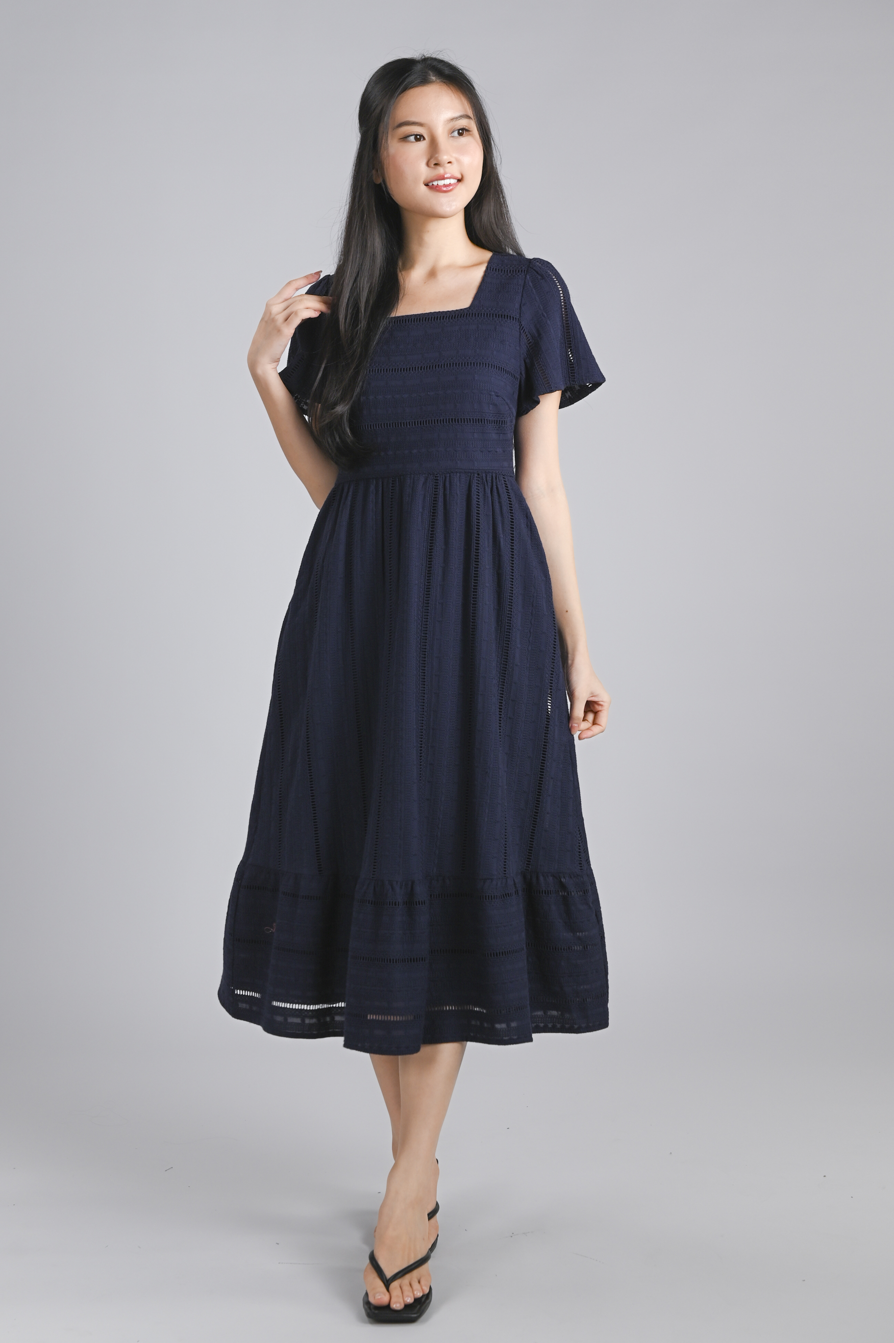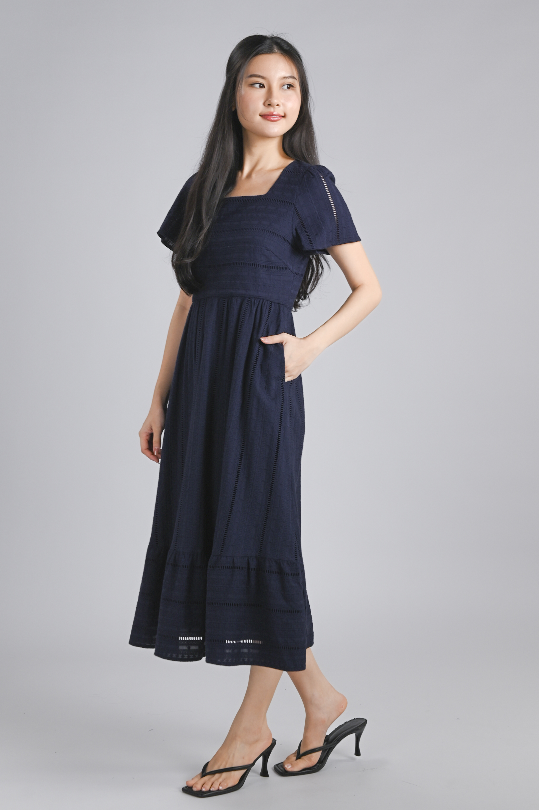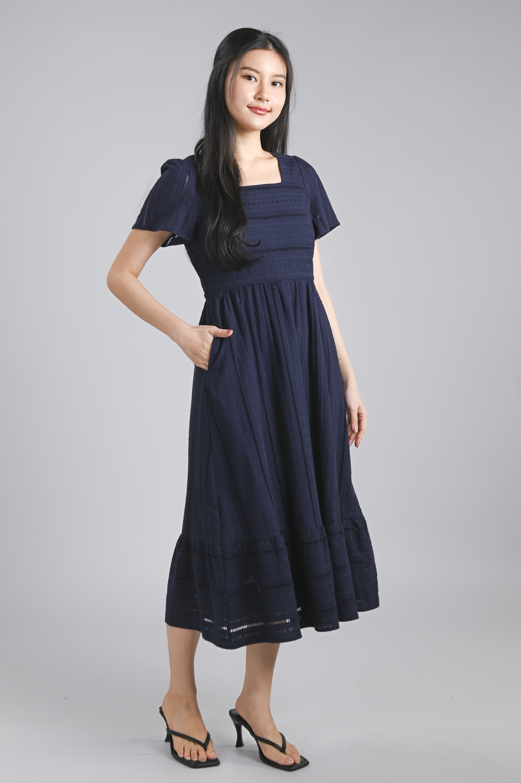 YORK EYELET SQUARE-NECK SLEEVED MIDI DRESS IN NAVY