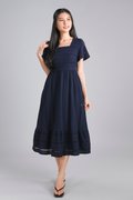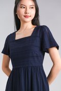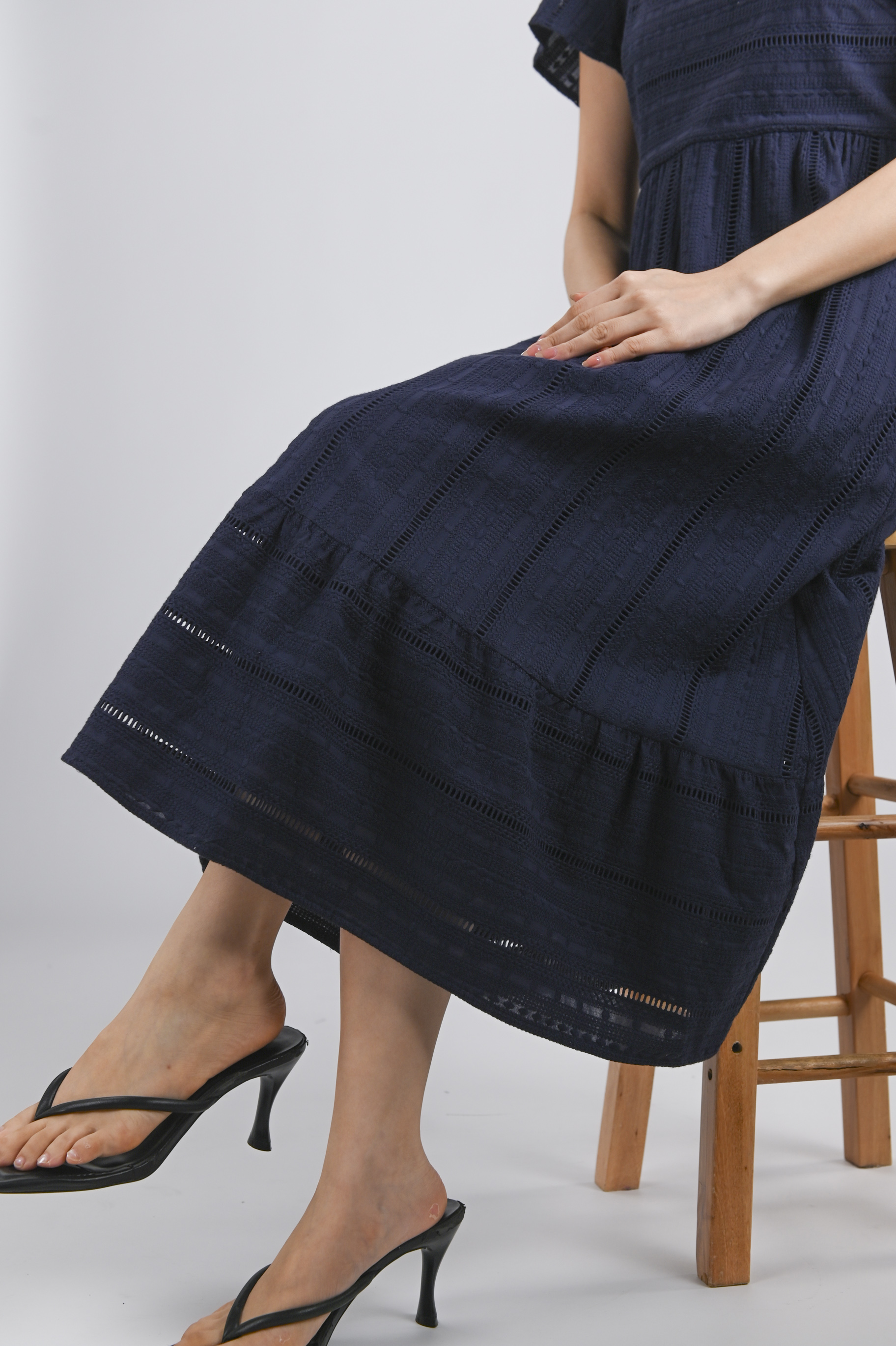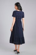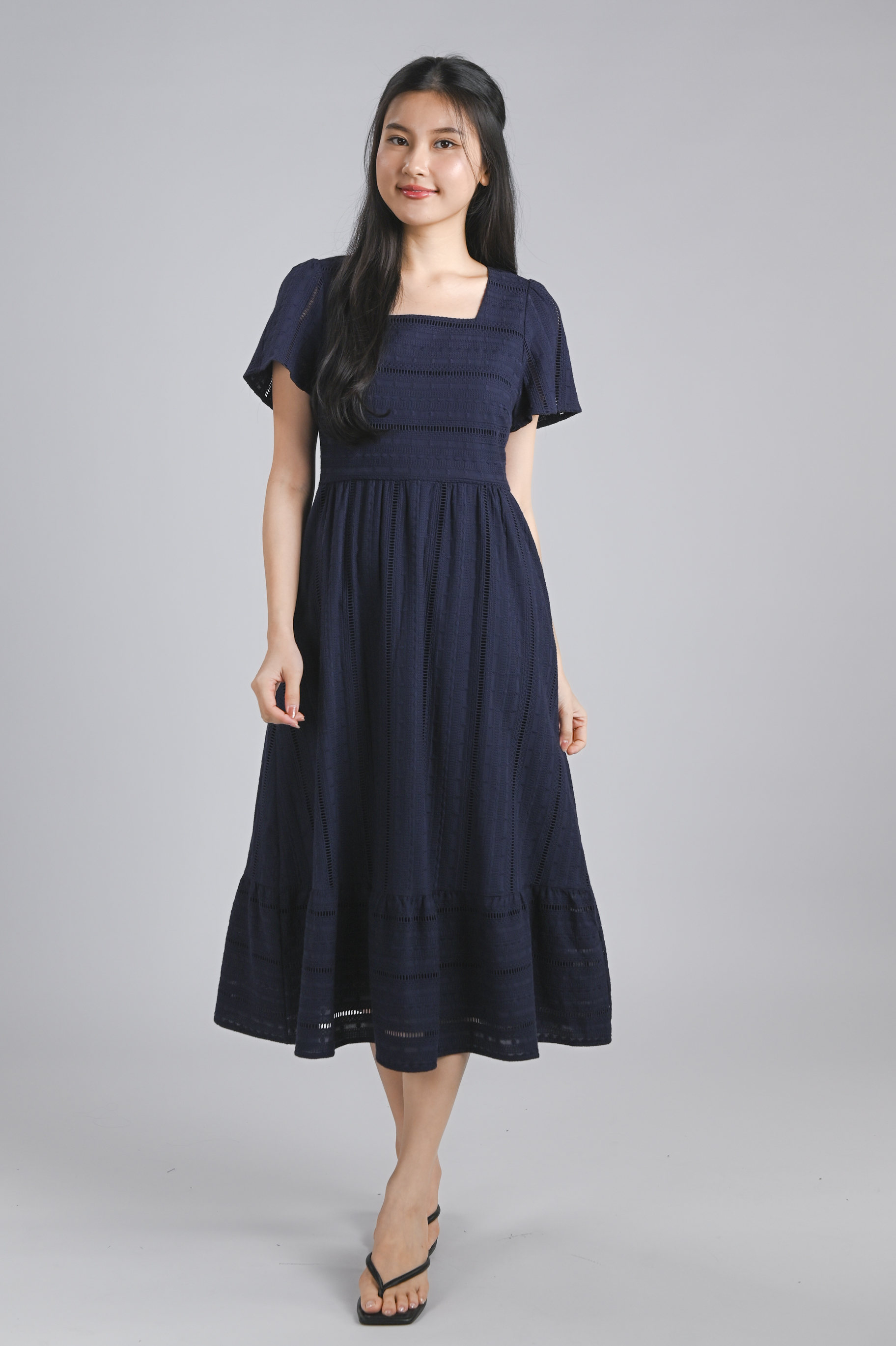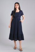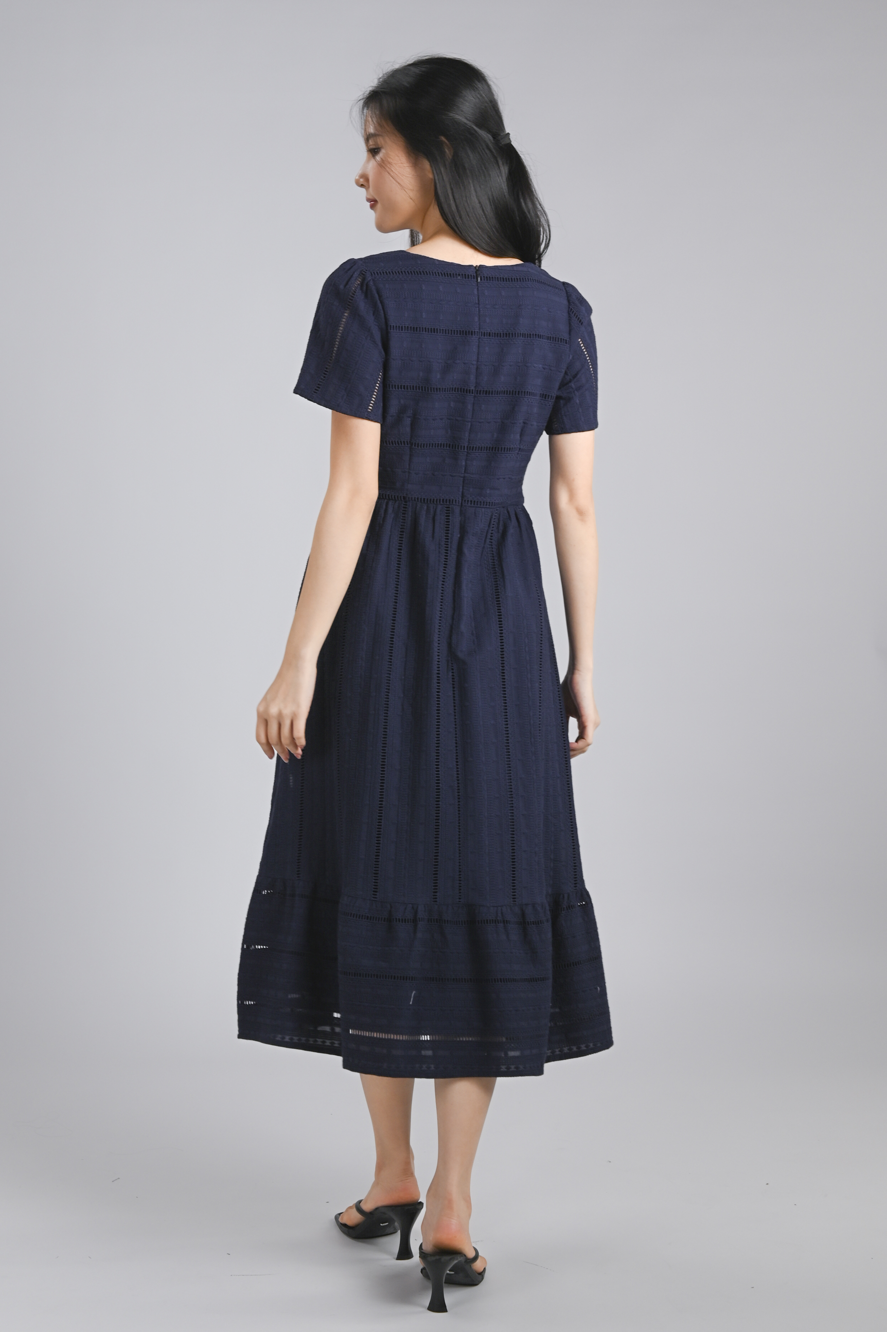 YORK EYELET SQUARE-NECK SLEEVED MIDI DRESS IN NAVY
