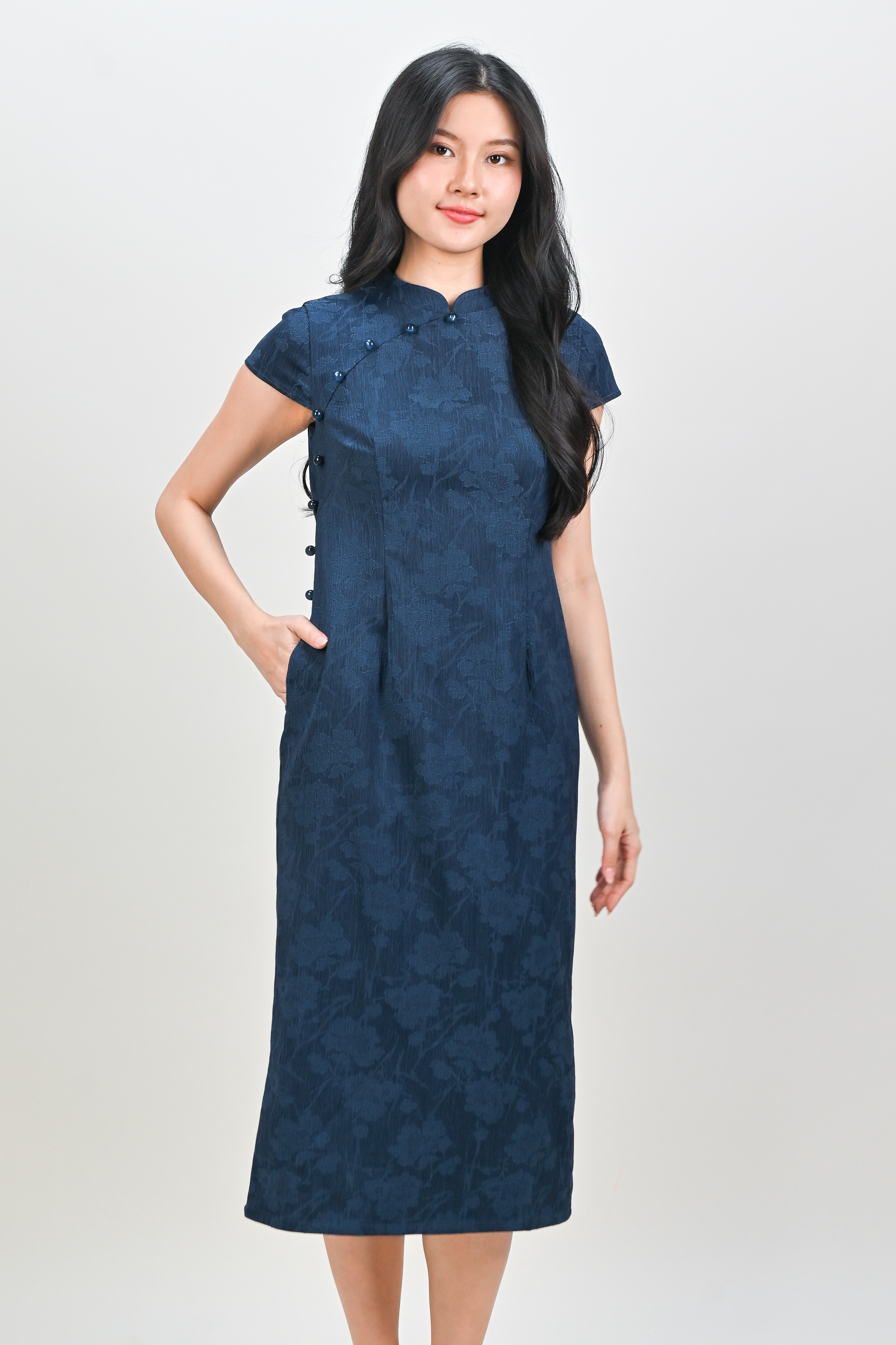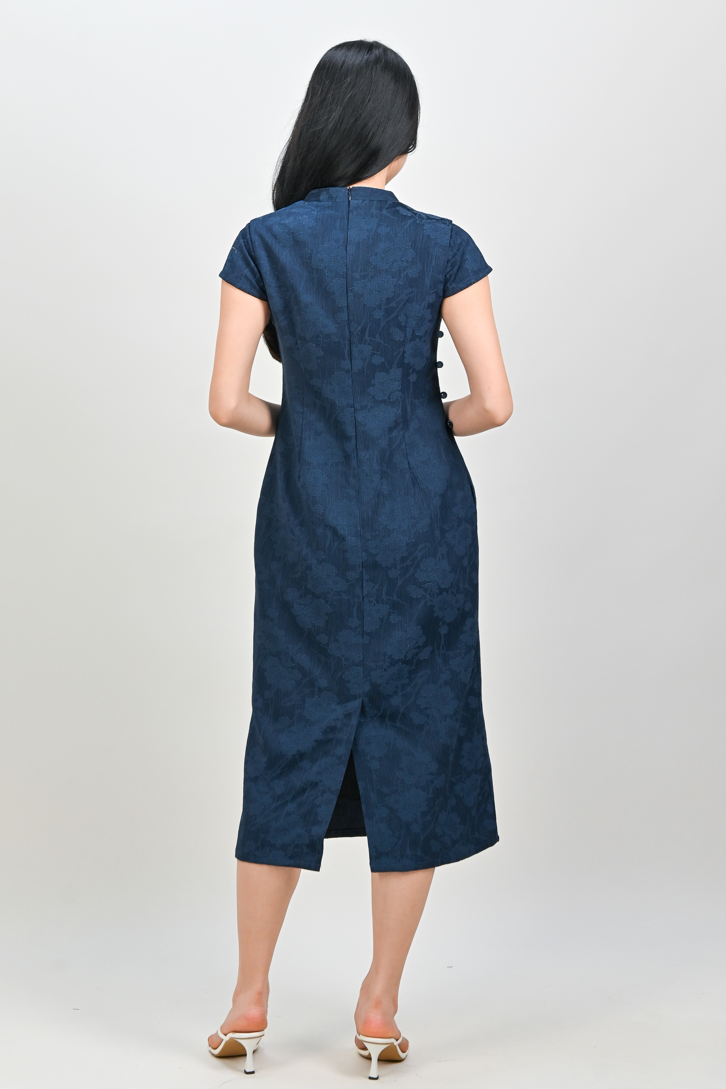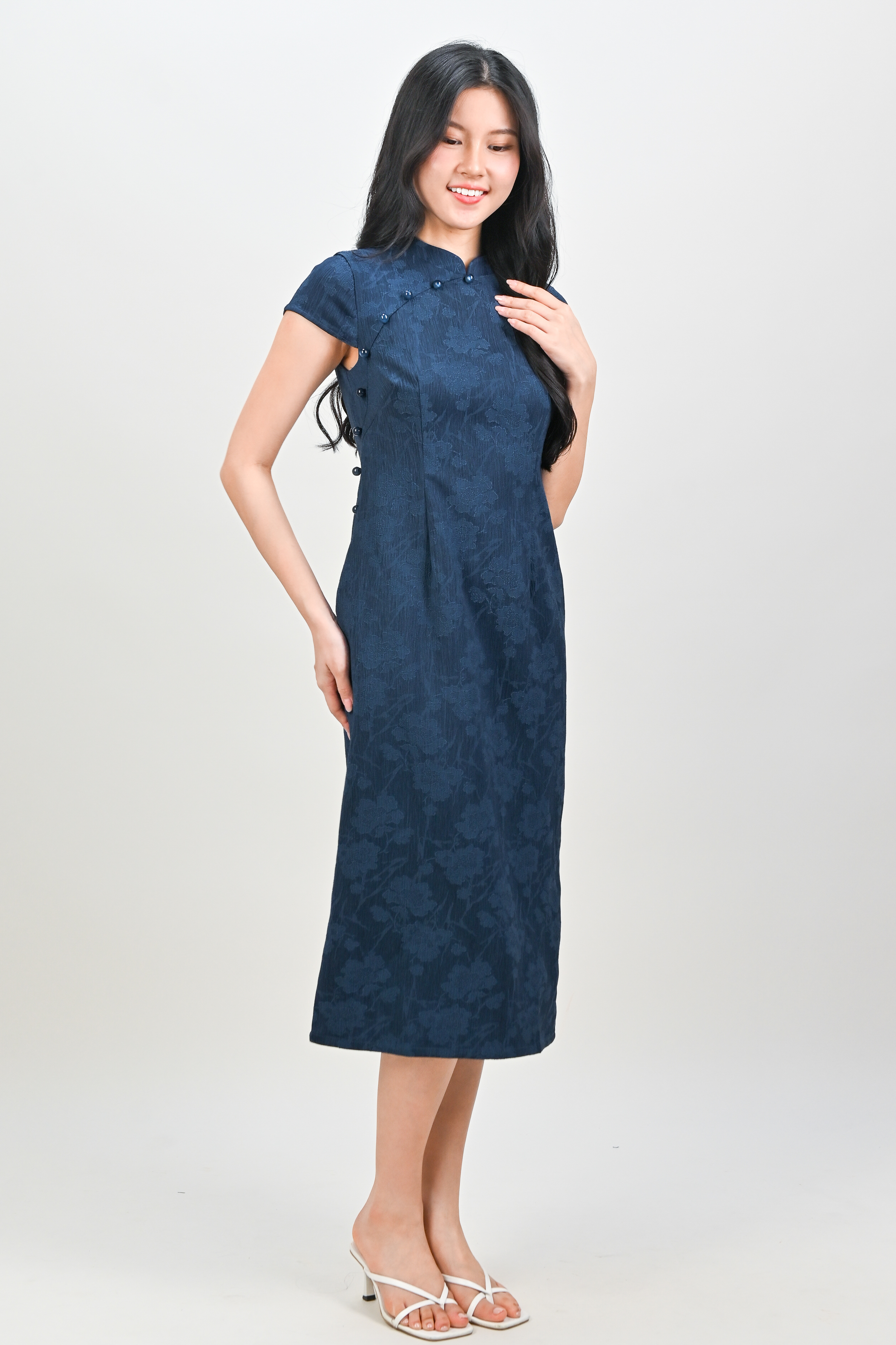 YUEYUE DARK BLUE CAP-SLEEVED CHEONGSAM DRESS