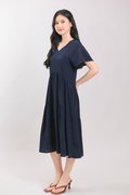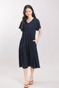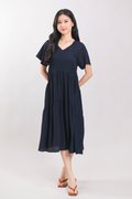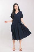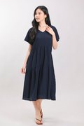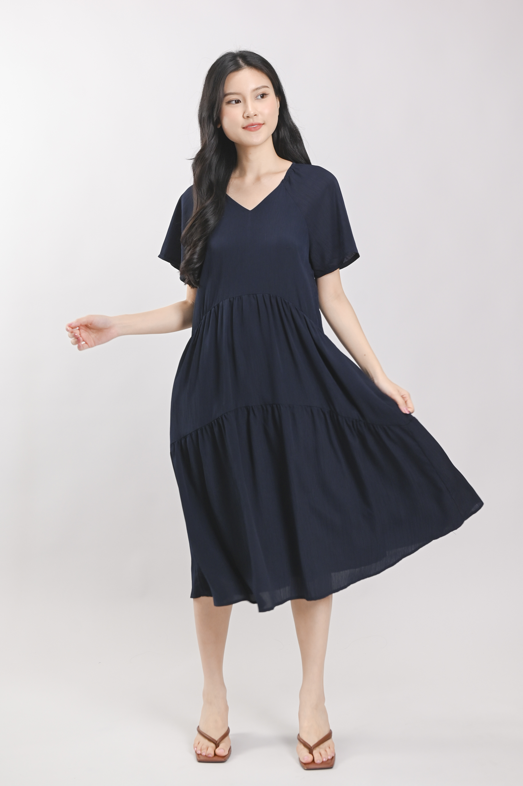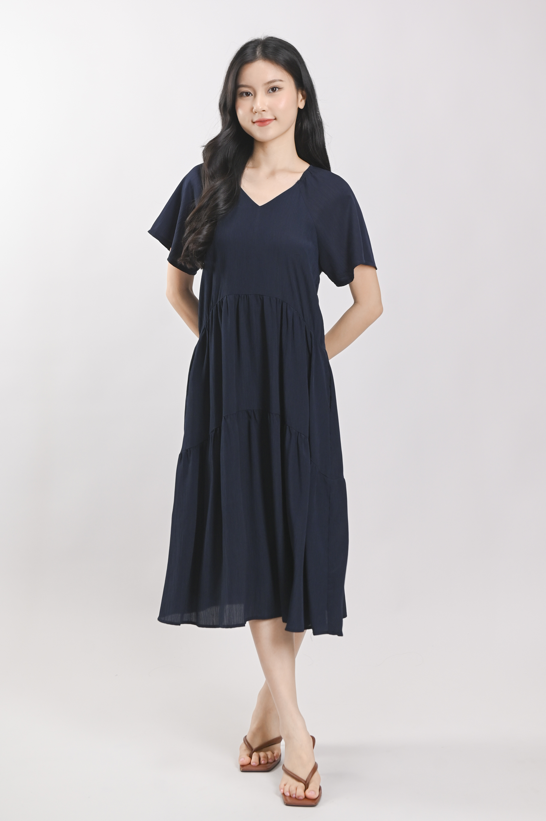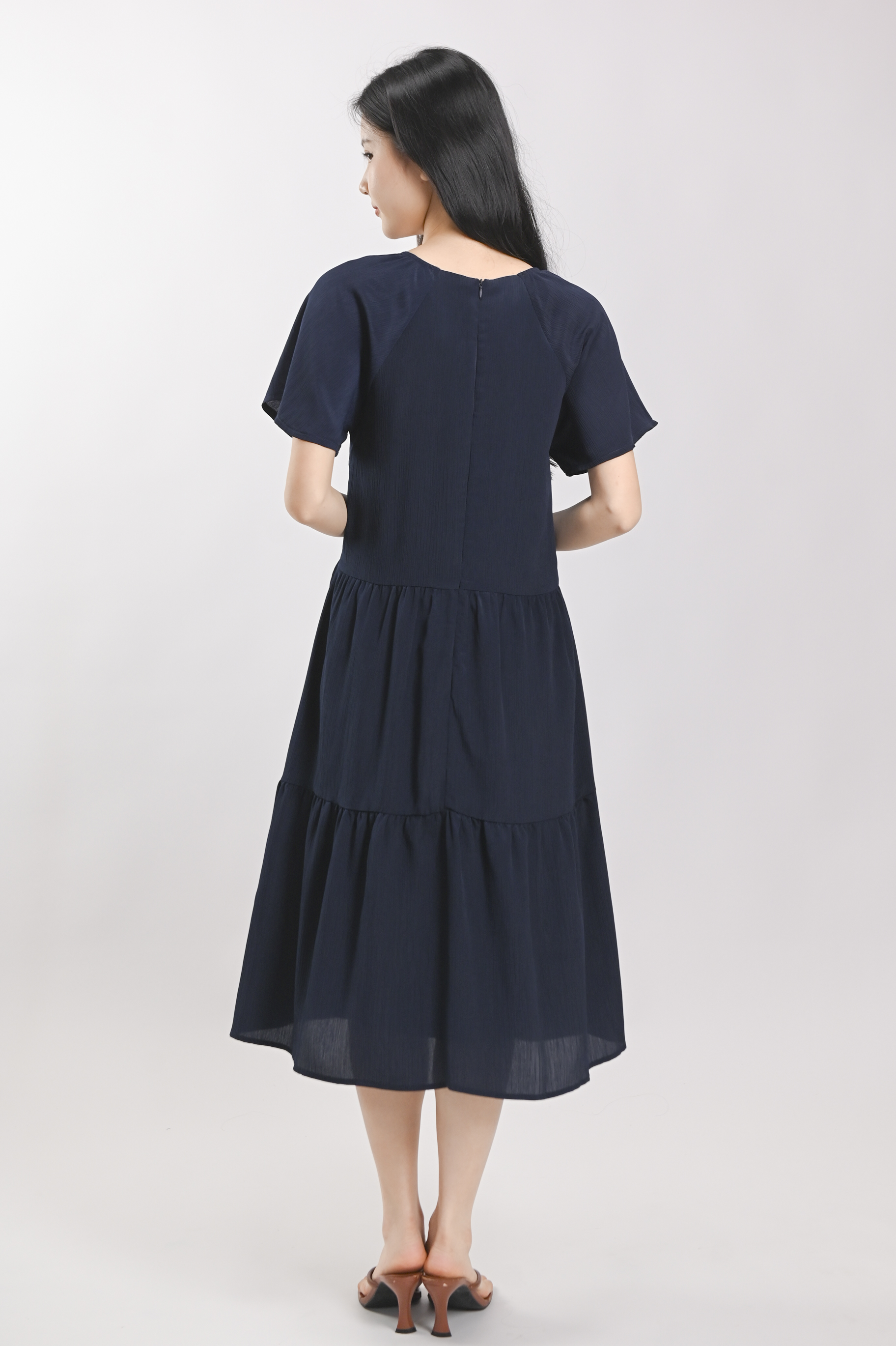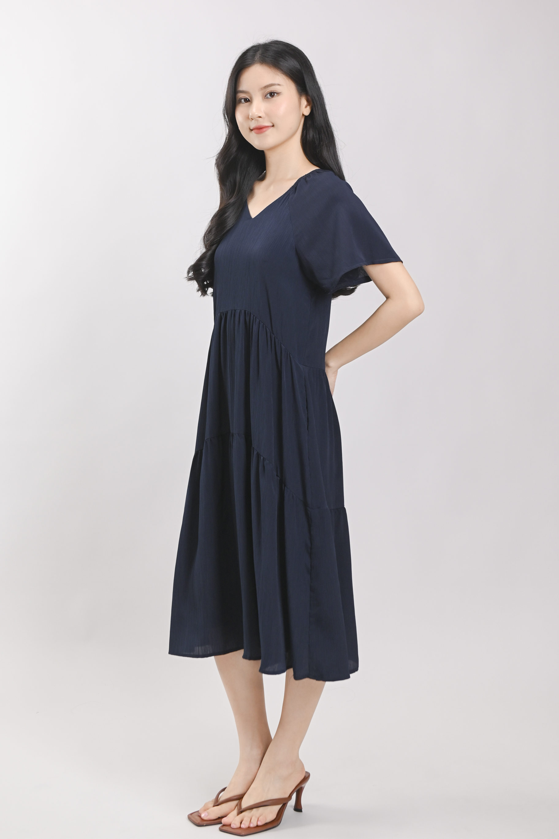 ZANIKA TEXTURED V-NECK SLEEVED TIERED DRESS IN NAVY