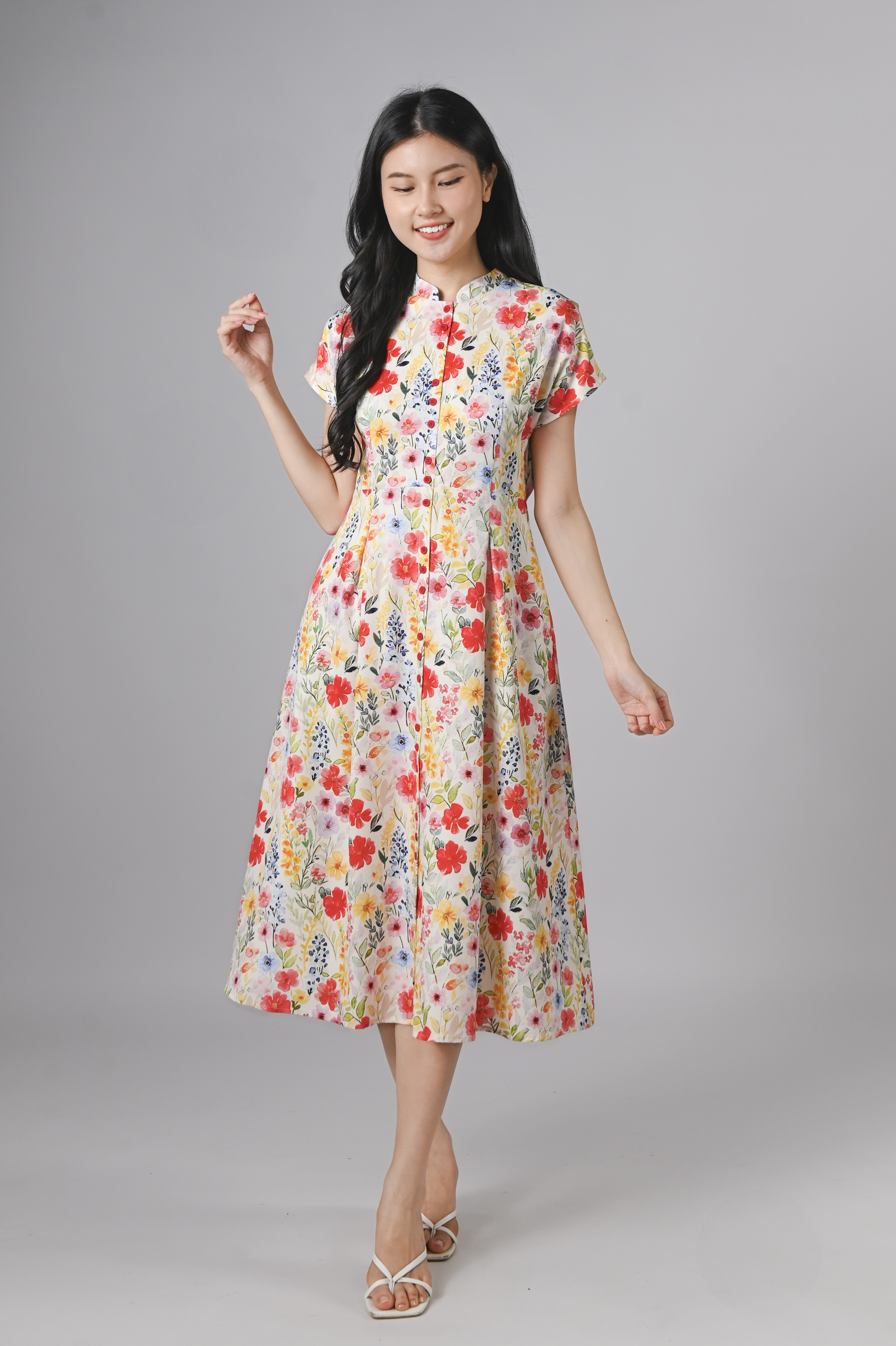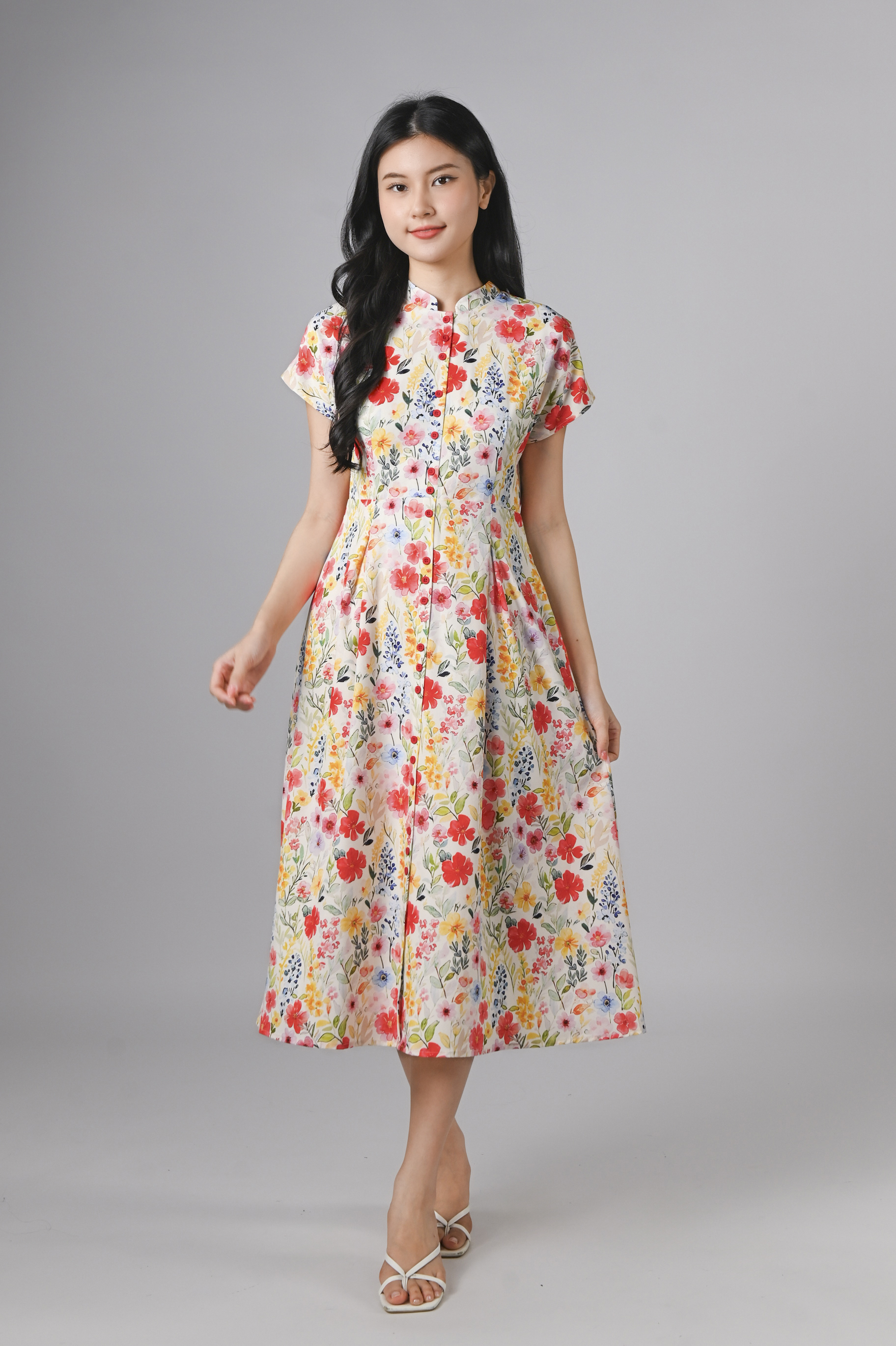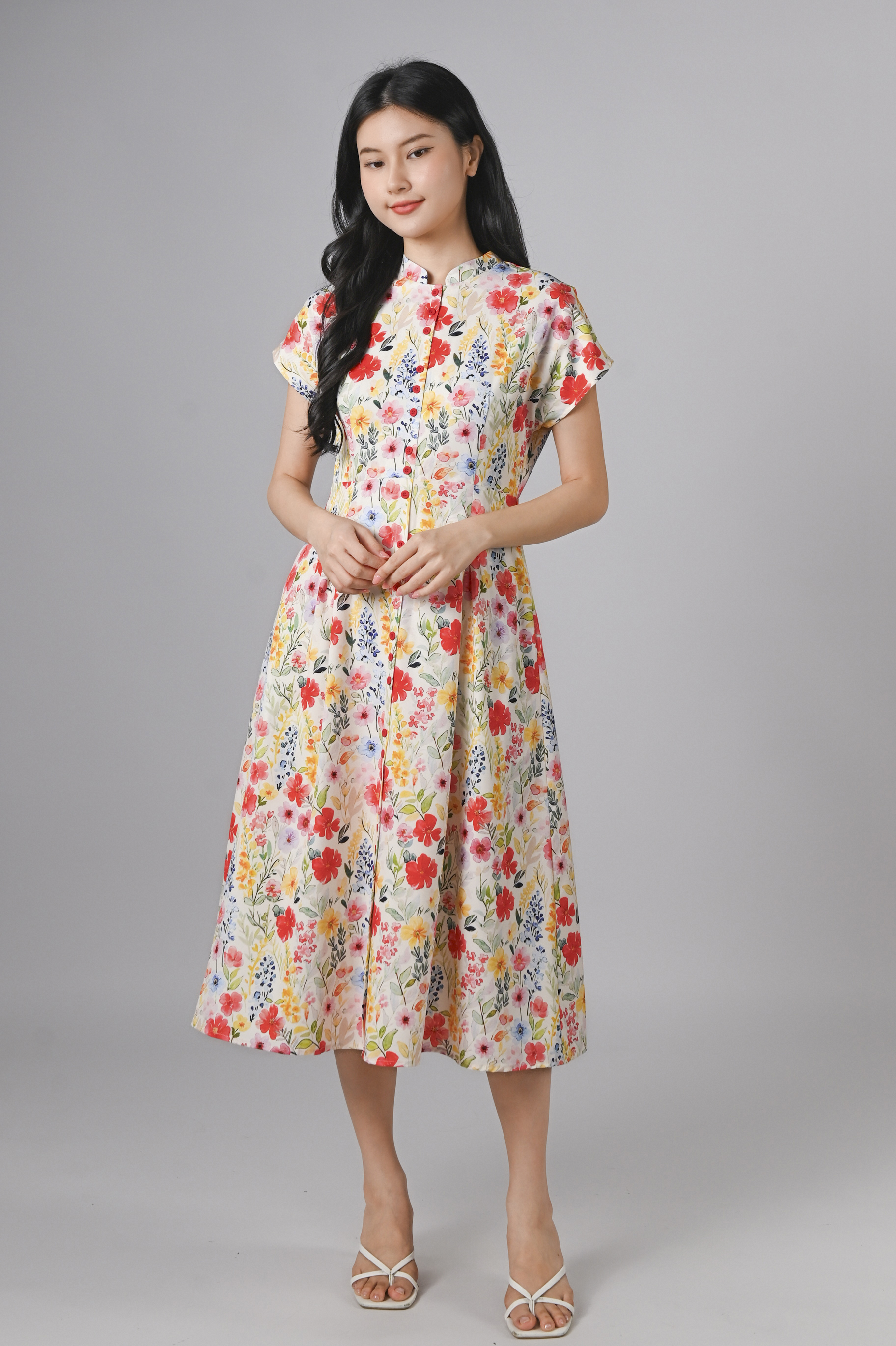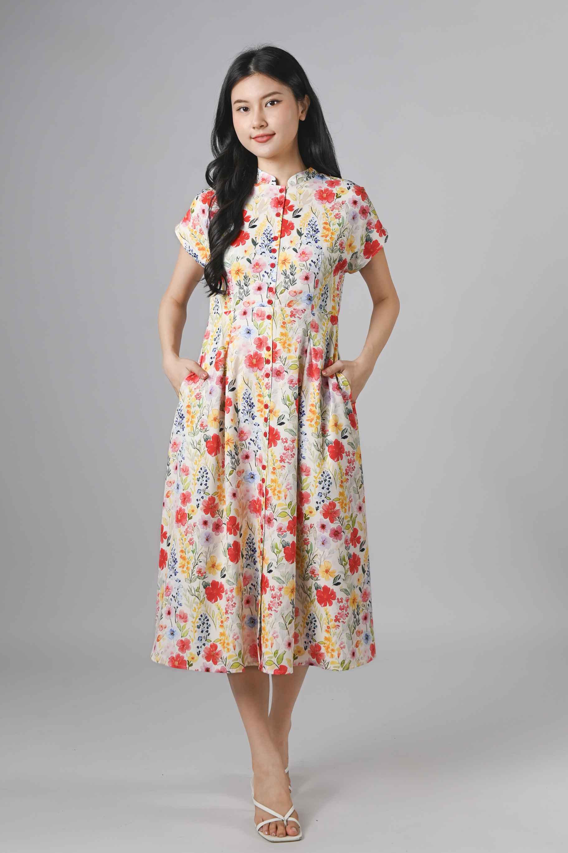 ZISHAN VIBRANT FLORAL SLEEVED CHEONGSAM MIDI DRESS