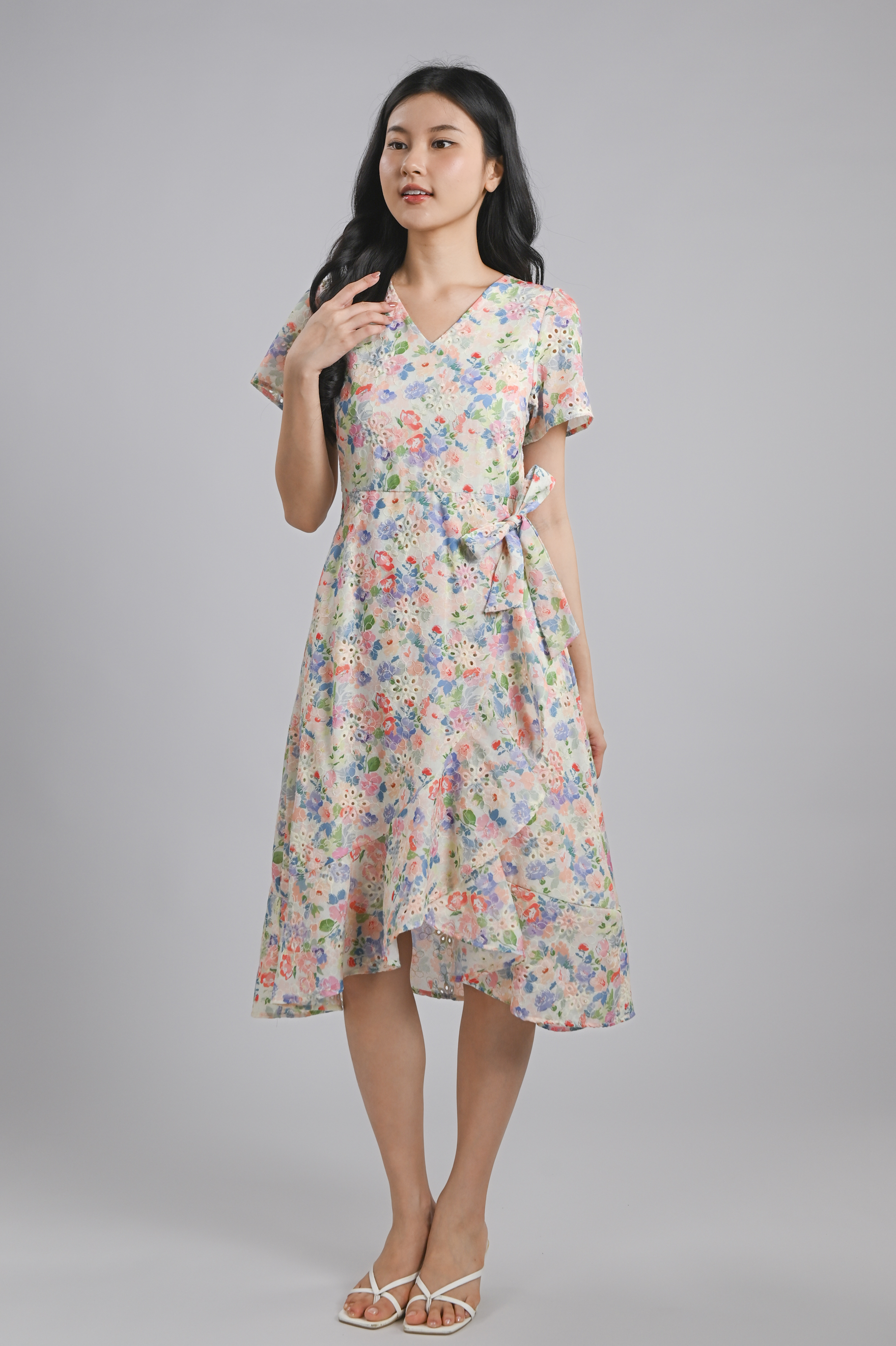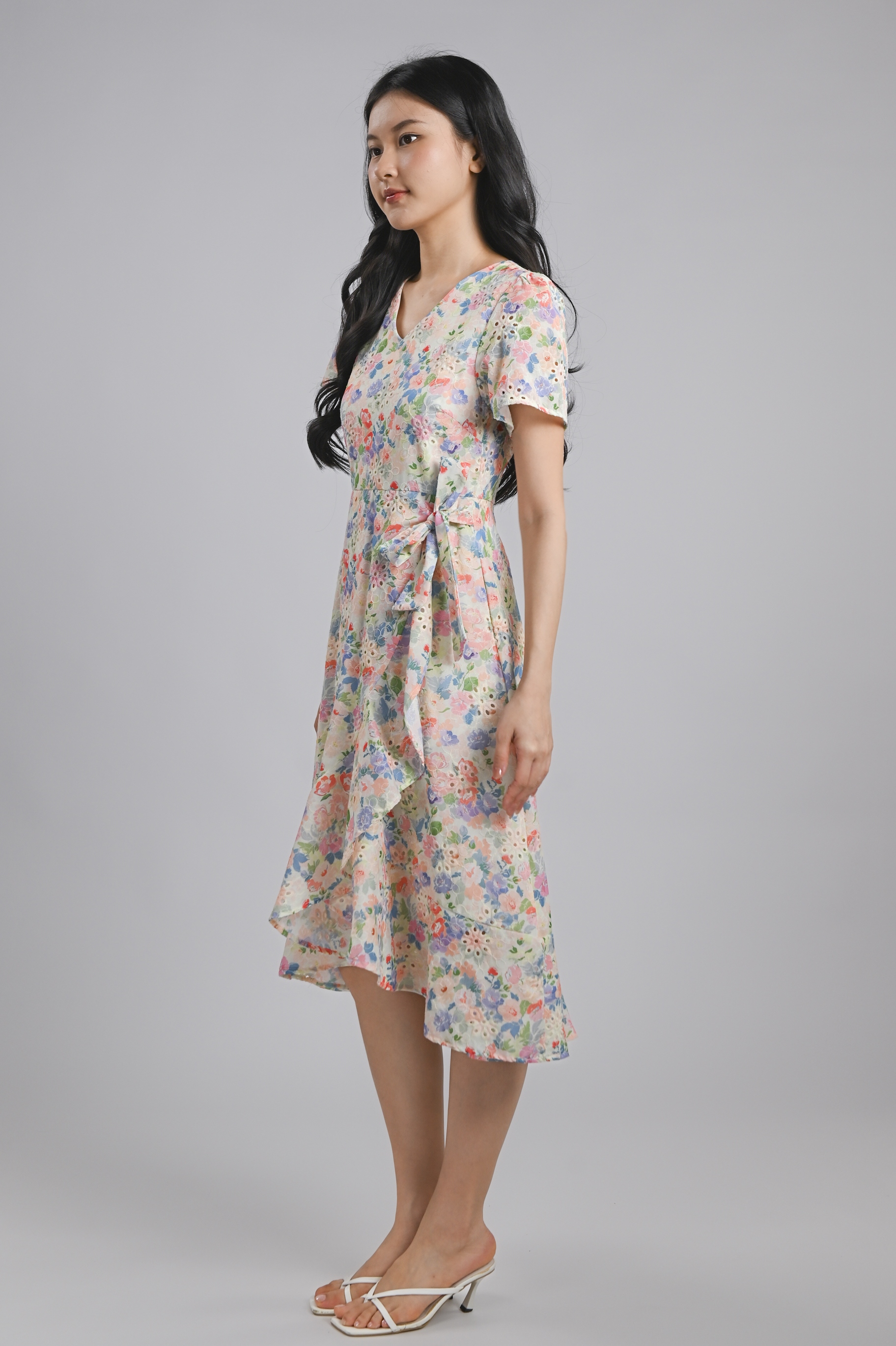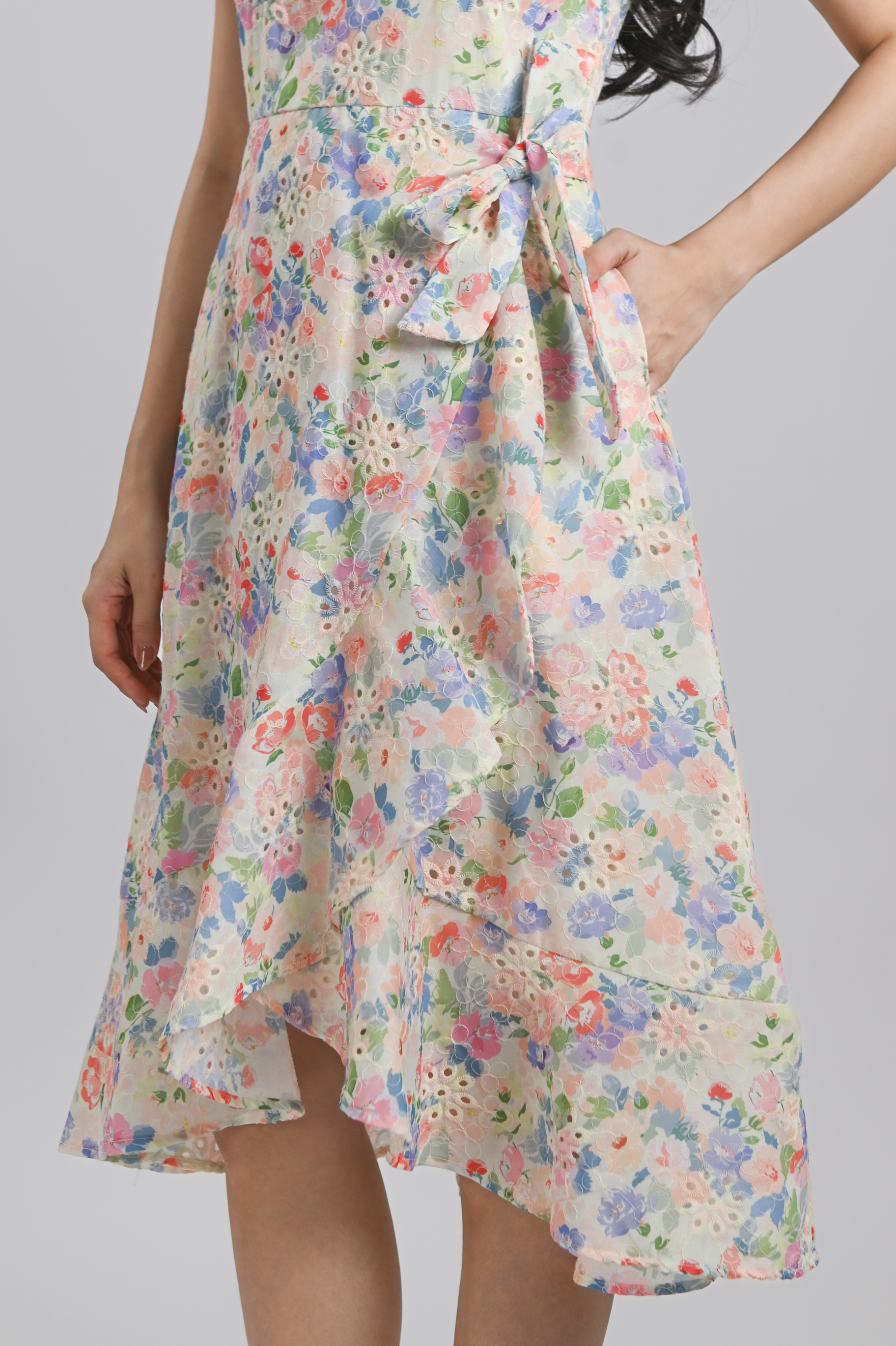 ZIWEI EYELET FLORAL SLEEVED RUFFLE MIDI DRESS