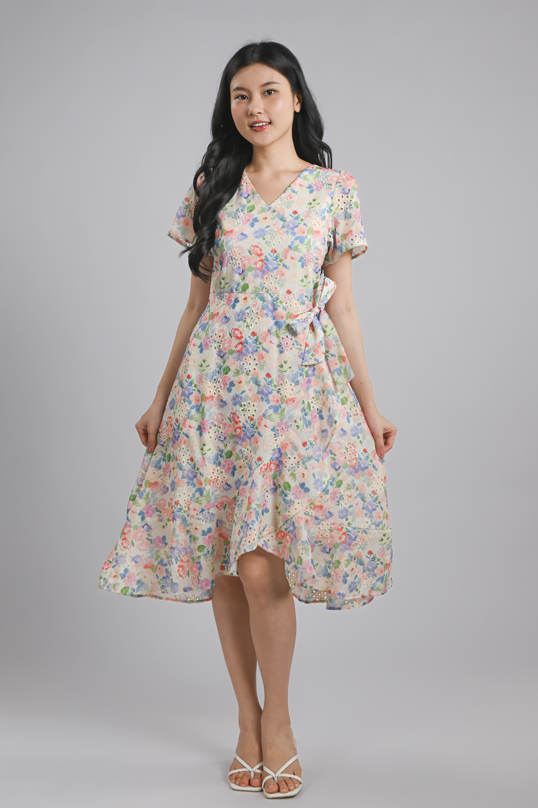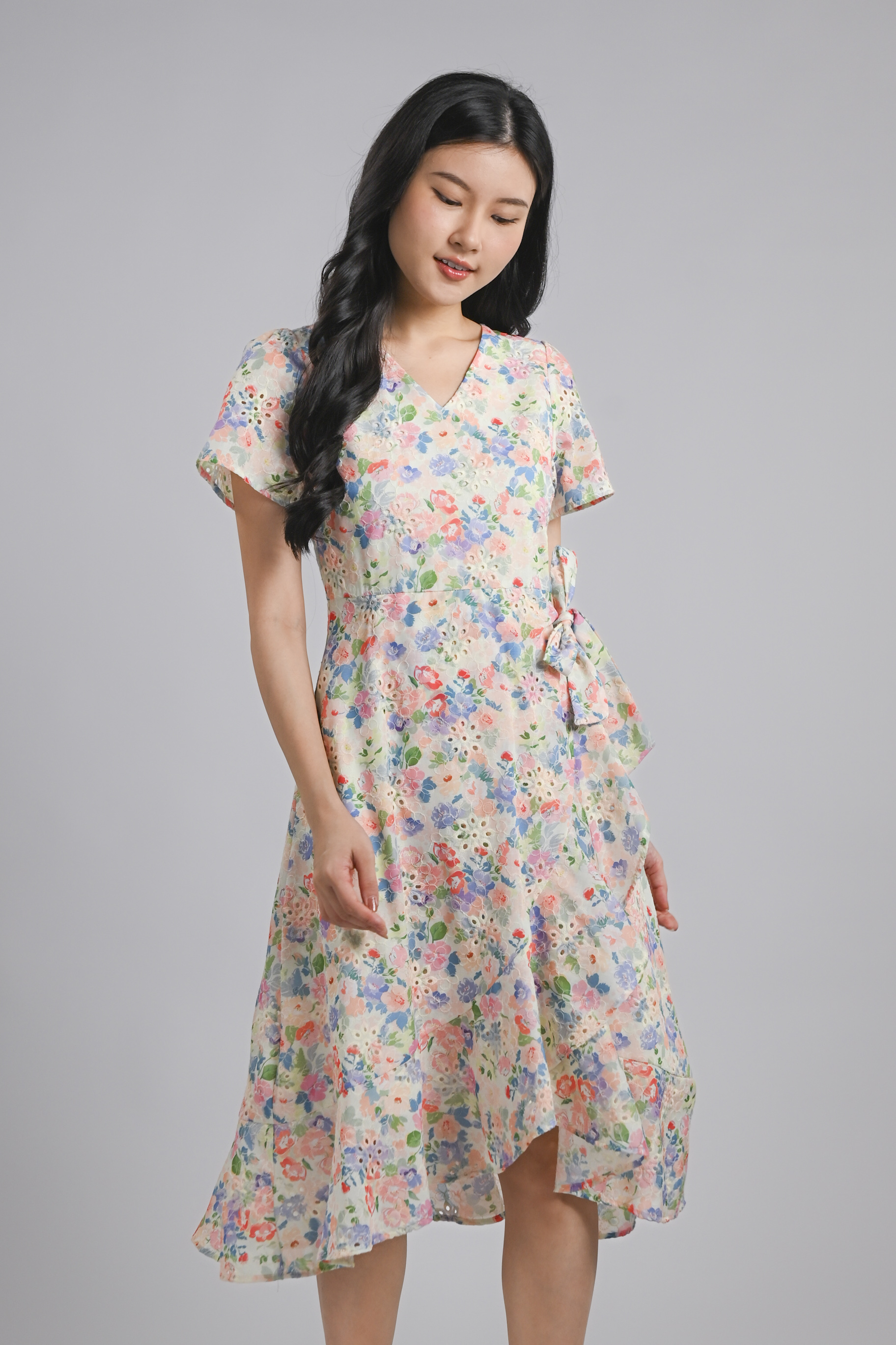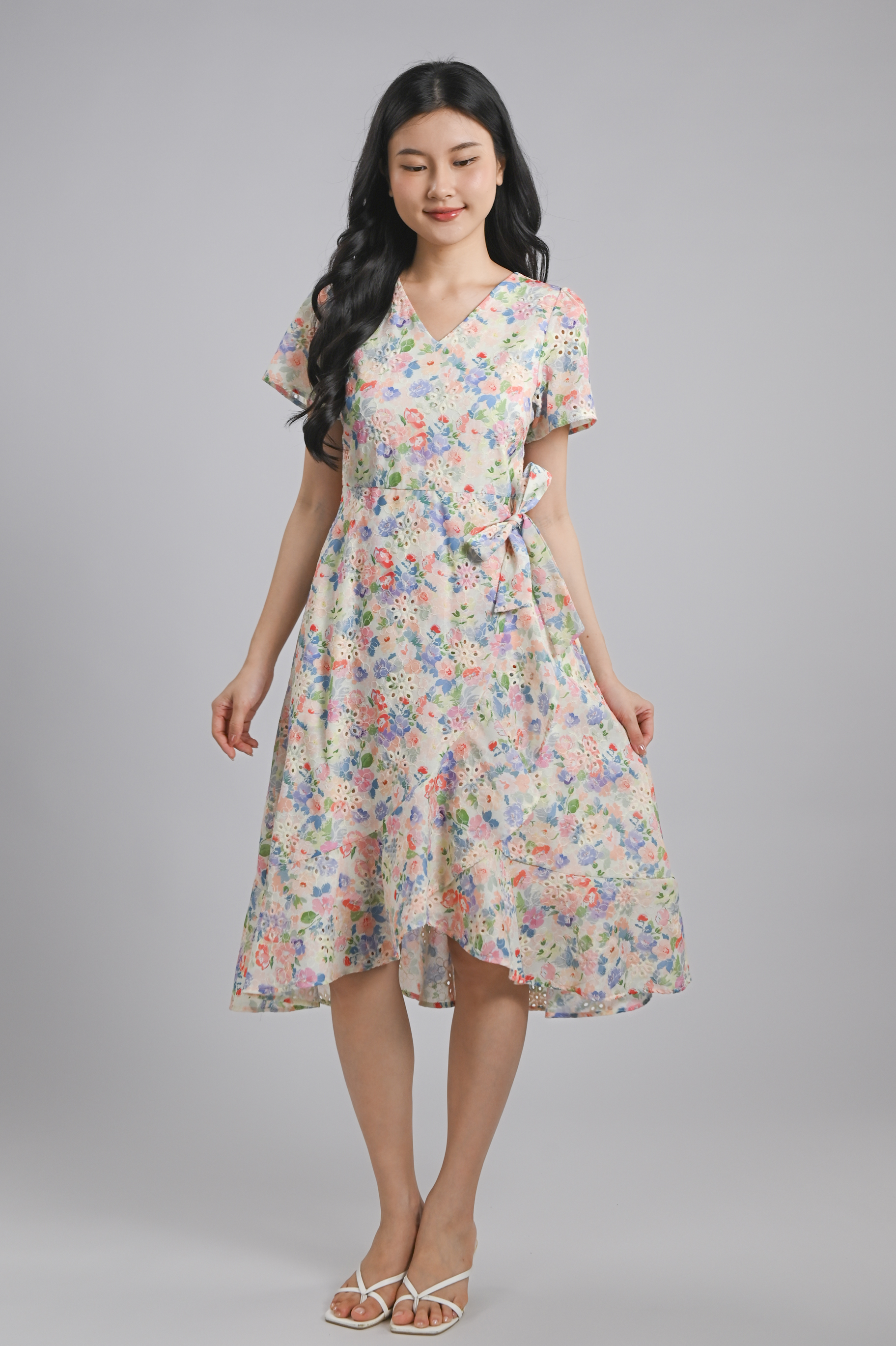 ZIWEI EYELET FLORAL SLEEVED RUFFLE MIDI DRESS