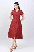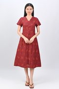 ZIYU EMB. V-NECK SLEEVED MIDI DRESS IN WINE