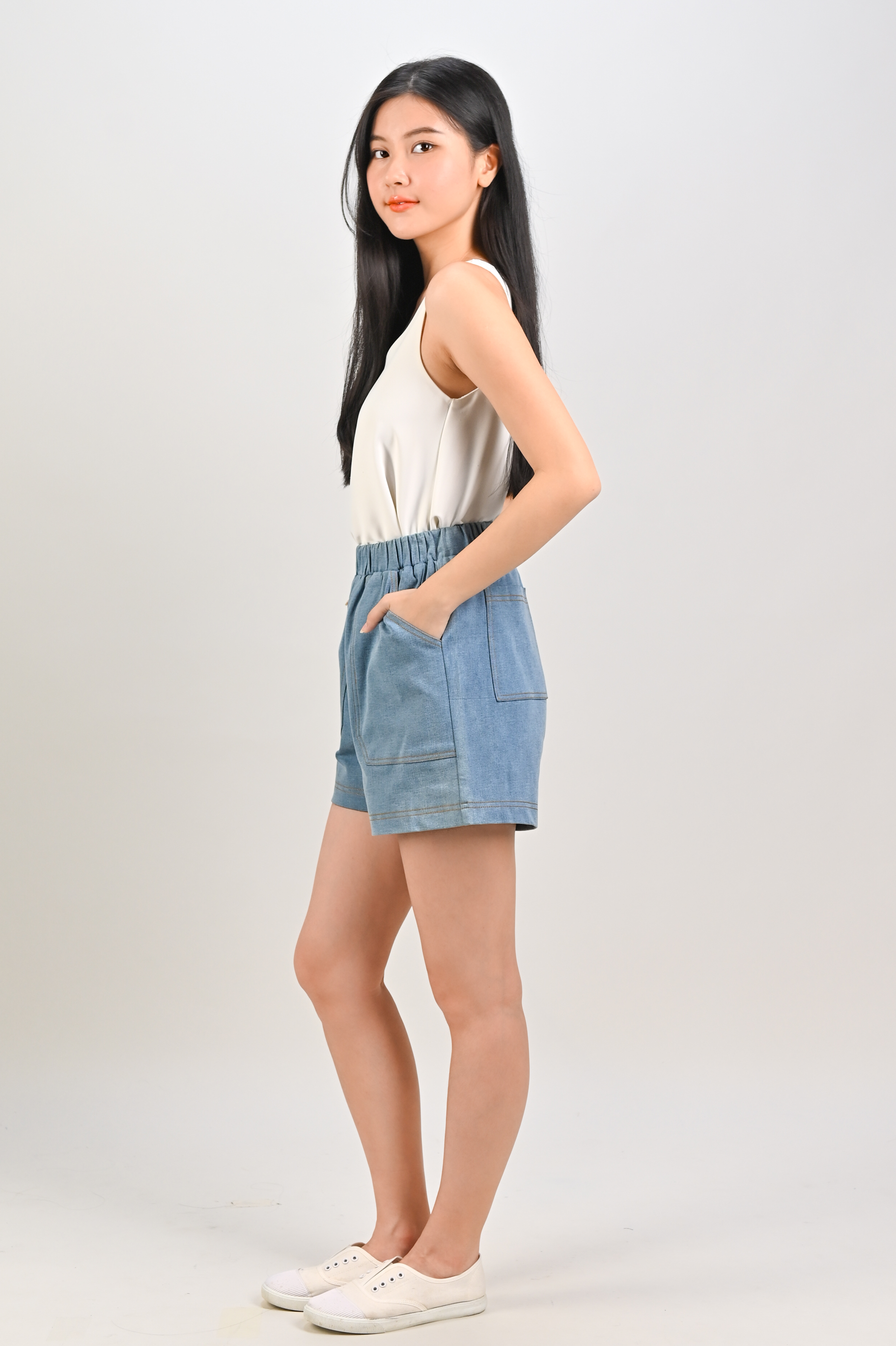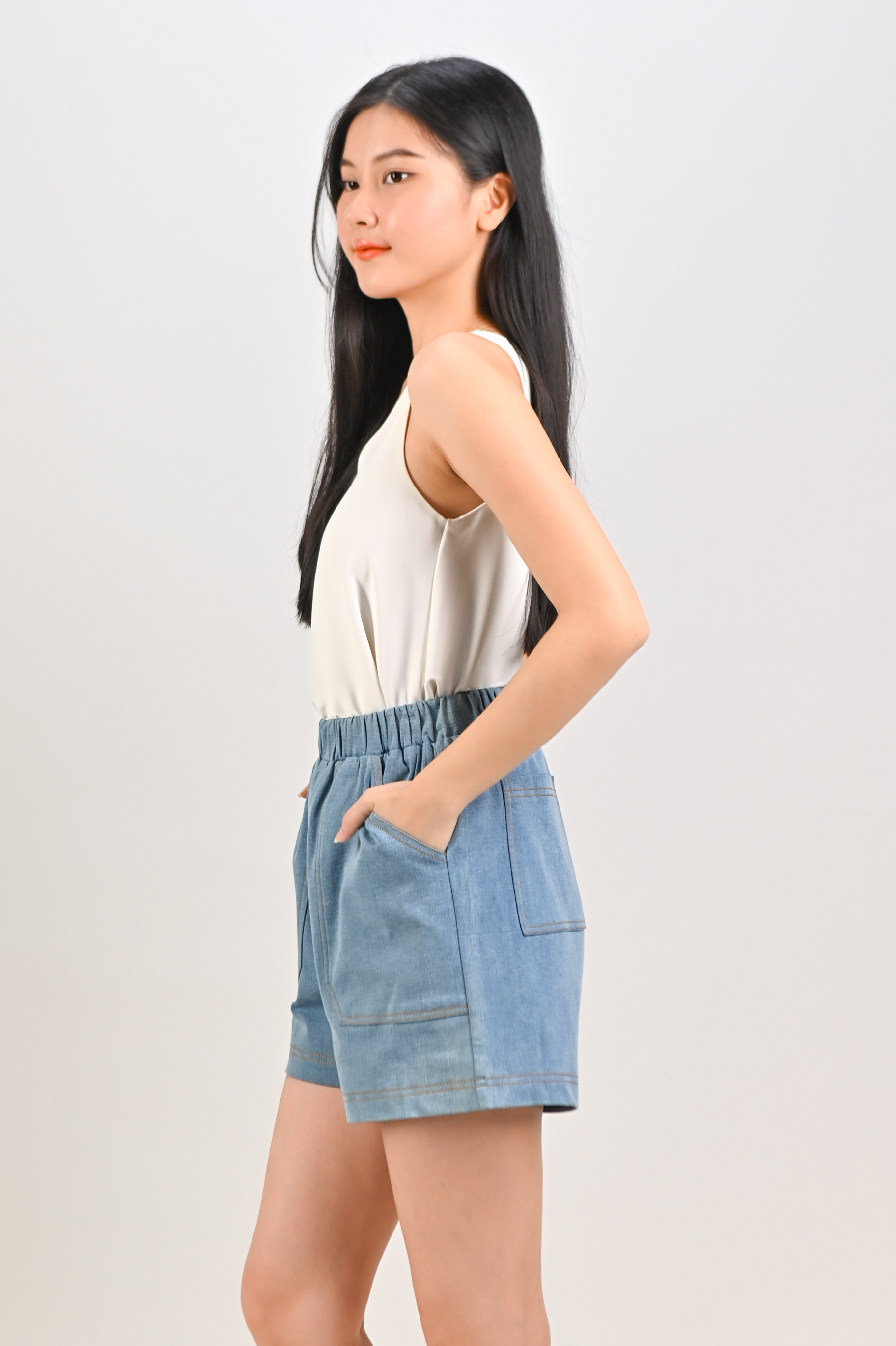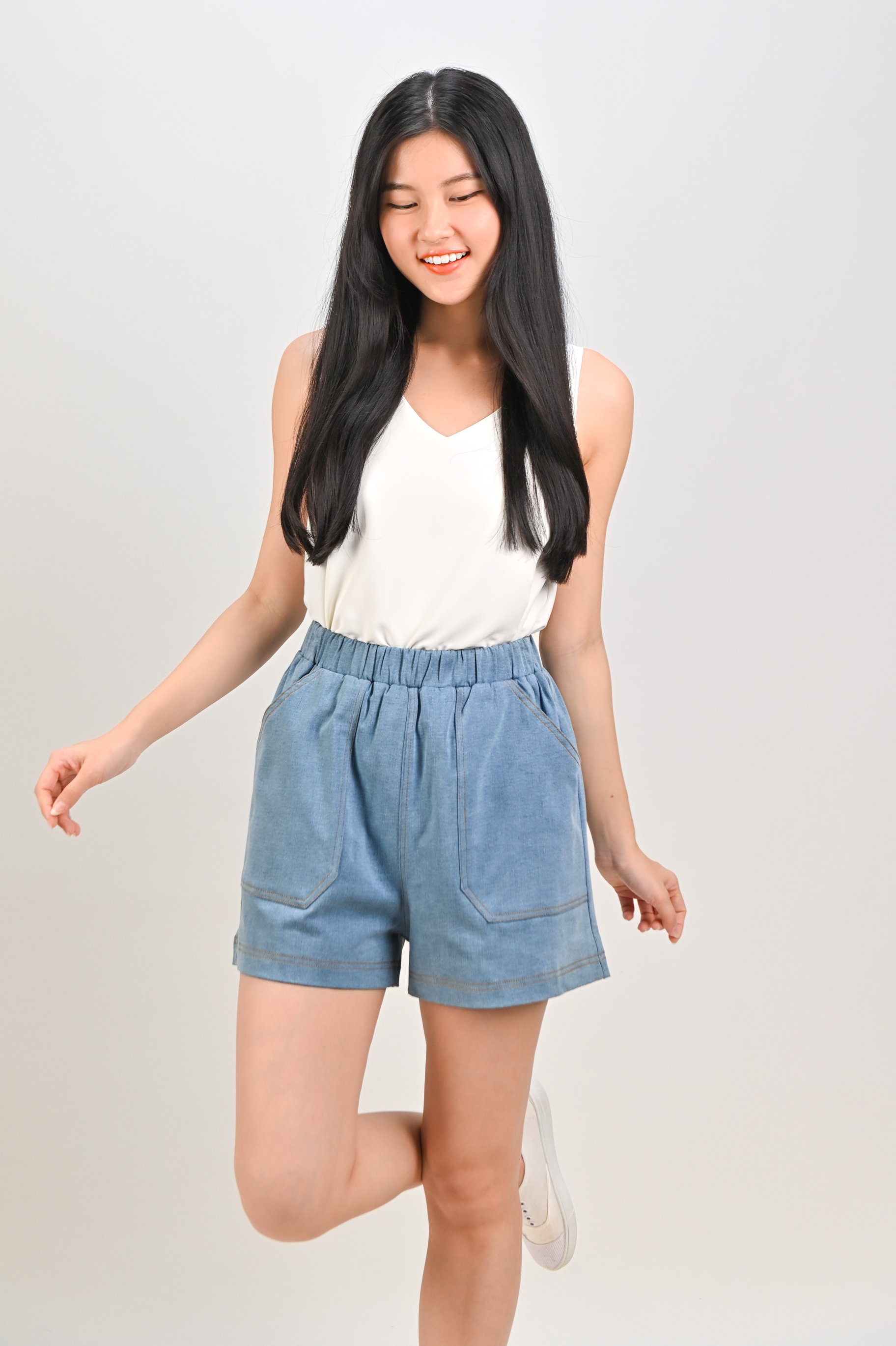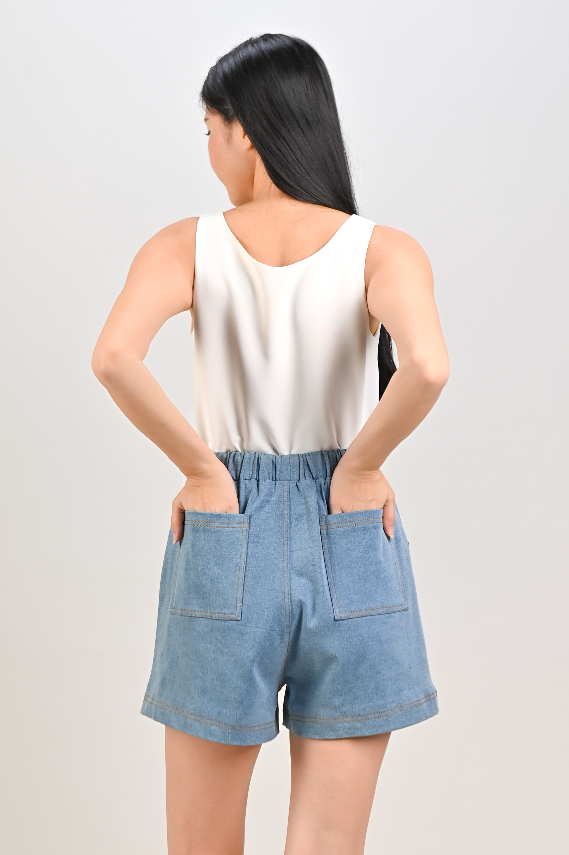 ZORANA ELASTIC-WAIST SHORTS IN LIGHT DENIM
