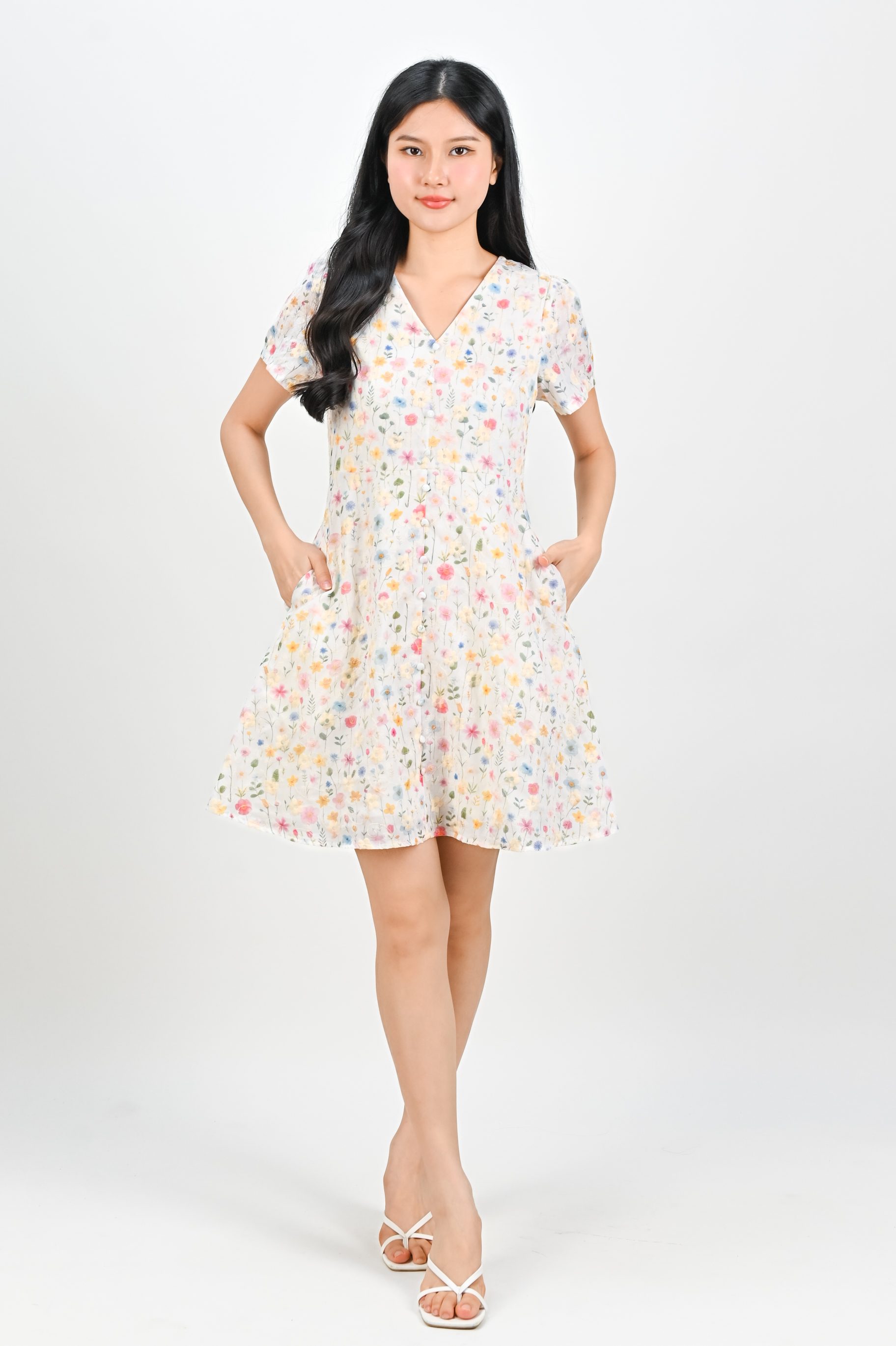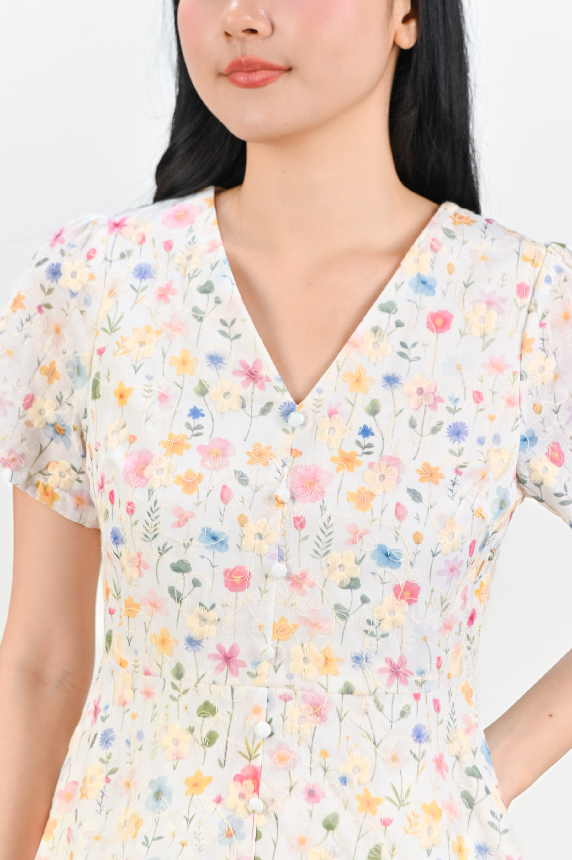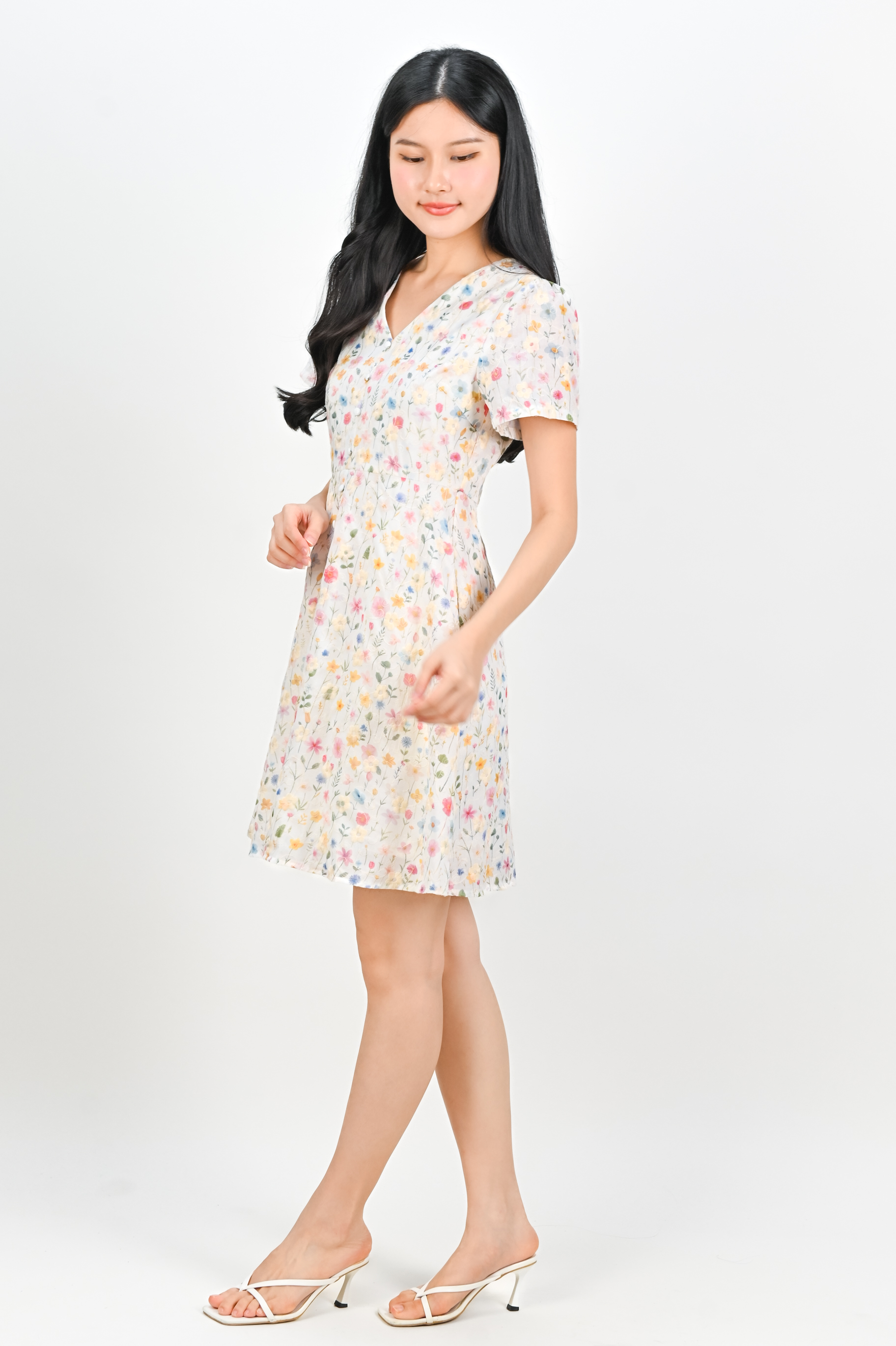 ZUZU SLEEVED BUTTON DRESS IN WHITE FLORAL